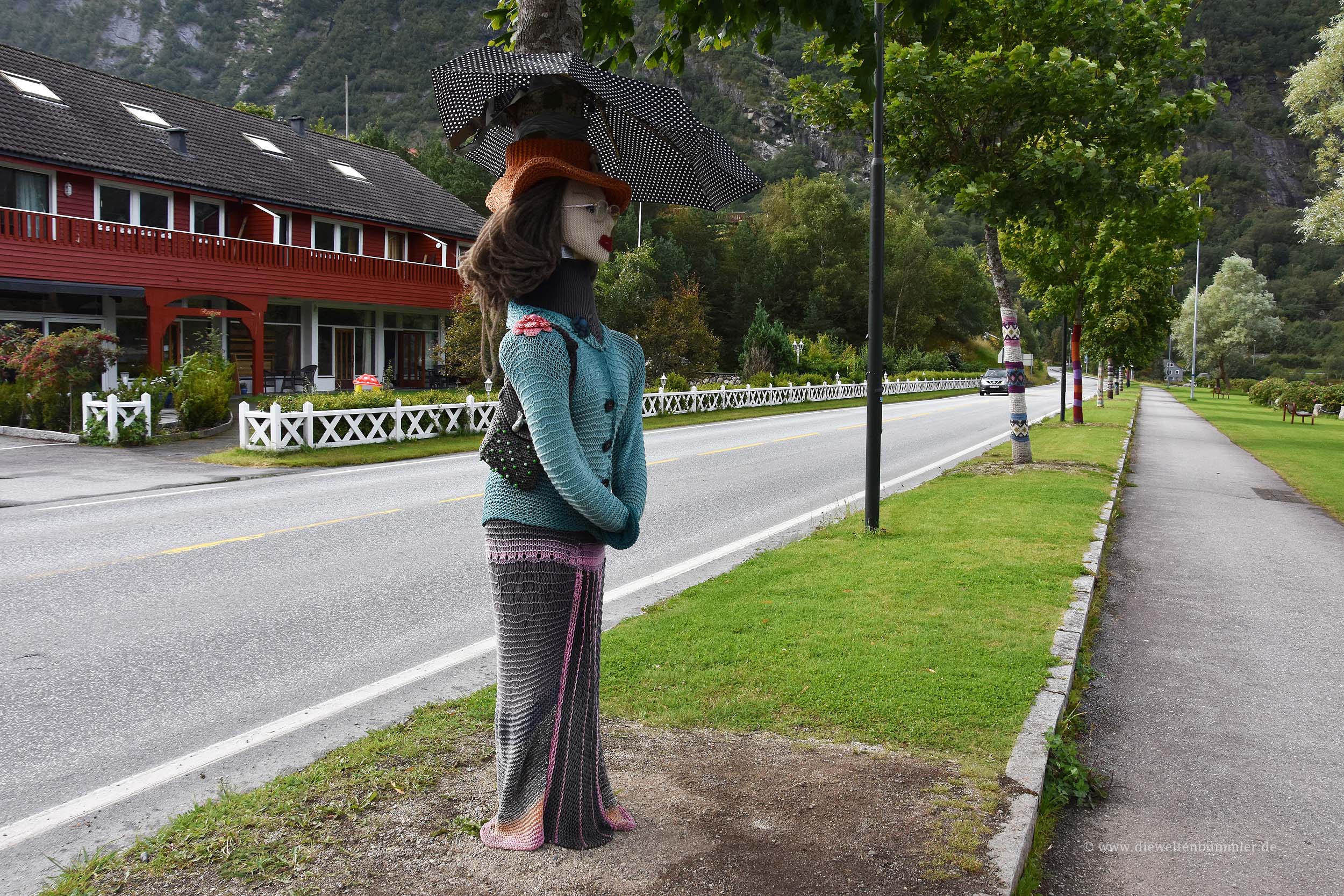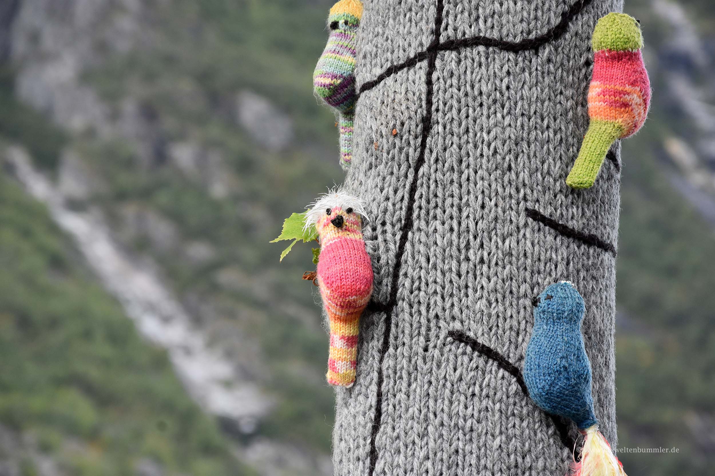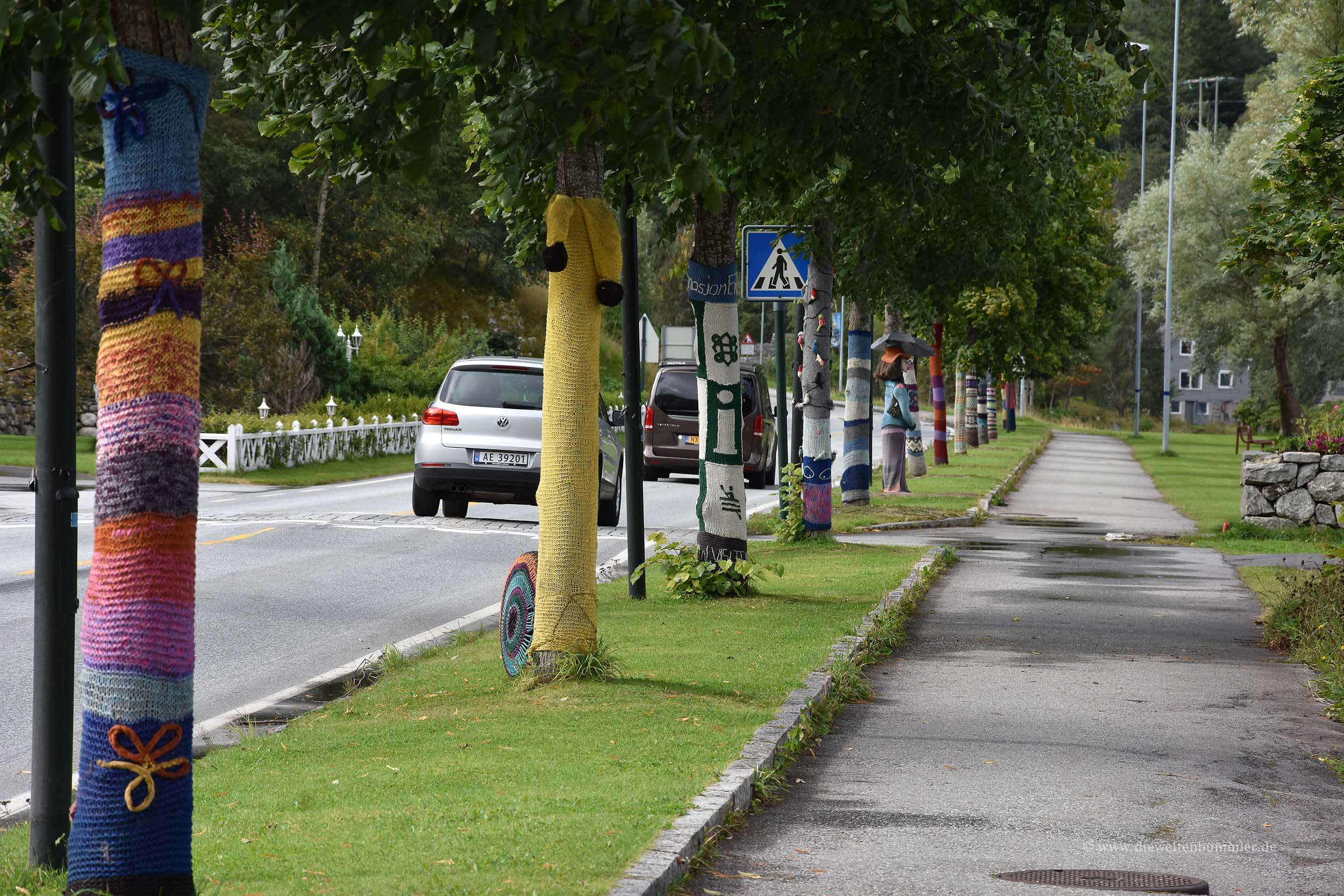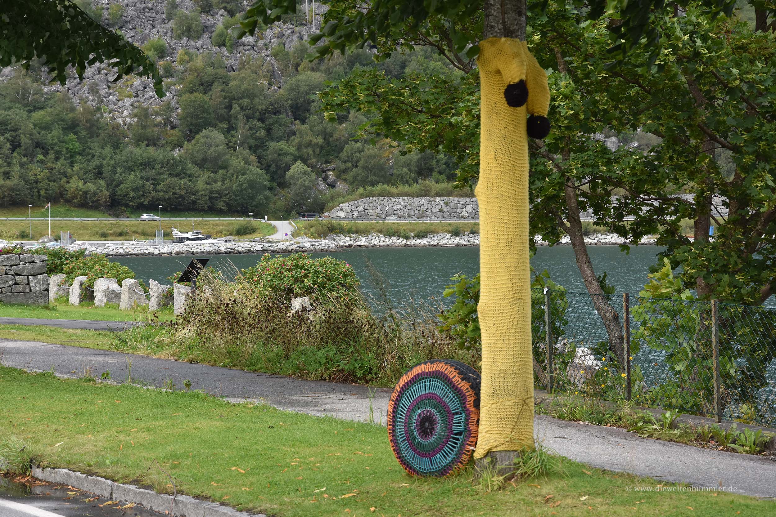 Wir fuhren also noch am Ufer entlang und steuerten Eidfjord an. Die Ortschaft kannten wir auch noch gut von einer unserer früheren Norwegen-Touren. Damals gab es eine Allee, in der jeder Baum im Rahmen der Strick Guerilla genutzt wurde. Und auch dieses Jahr entdeckten wir diese Bäume, die von Strickwaren umhüllt waren.