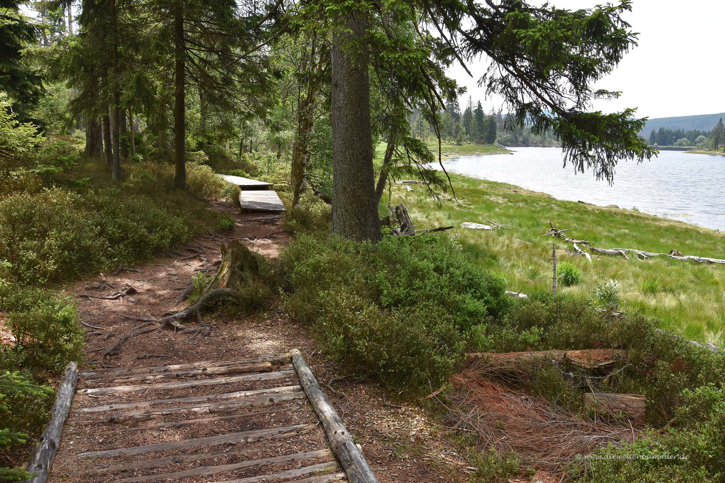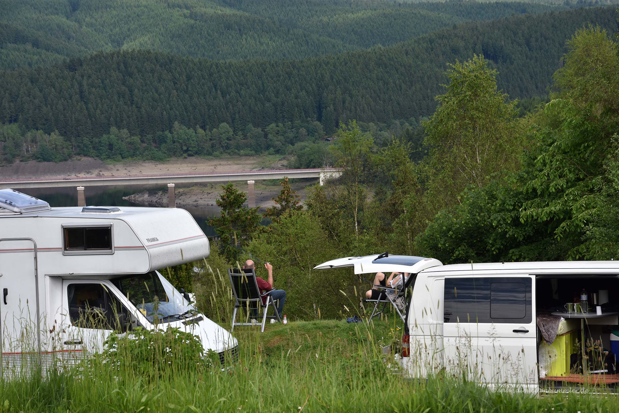 Oben angekommen standen dort zwei Mountainbiker, die darüber nachdachten, mit dem Rad den Weg abwärts zu fahren. Wir rieten davon ab, aber manche Leute wollen einfach nicht hören. Einer der beiden versuchte es trotzdem. Wir schauten noch zehn Minuten dabei zu, wie er versuchte, zwei Meter voranzukommen, doch dann wurde es uns zu doof und wir wanderten mit einem größeren Umweg völlig entspannt wieder hinab in das Okertal. Am Okerstausee konnten wir daher genau den entgegengesetzten Blick zum Wohnmobilstellplatz in Schulenburg genießen und sehen, dass dort jetzt ohnehin alles belegt war.