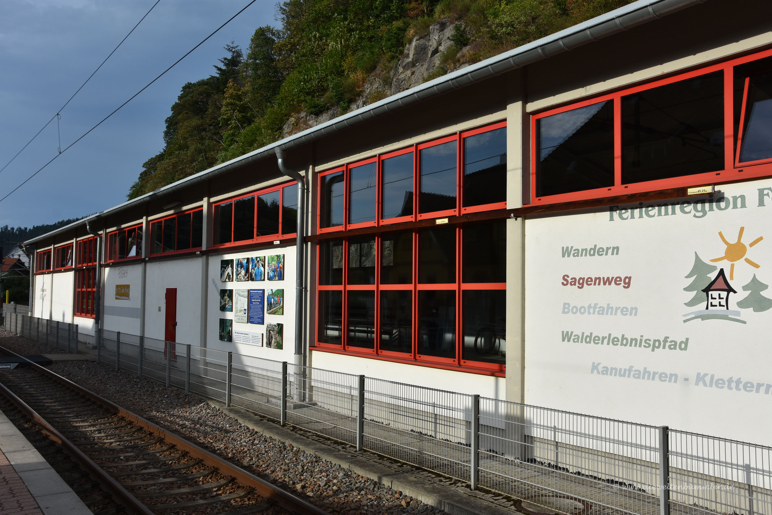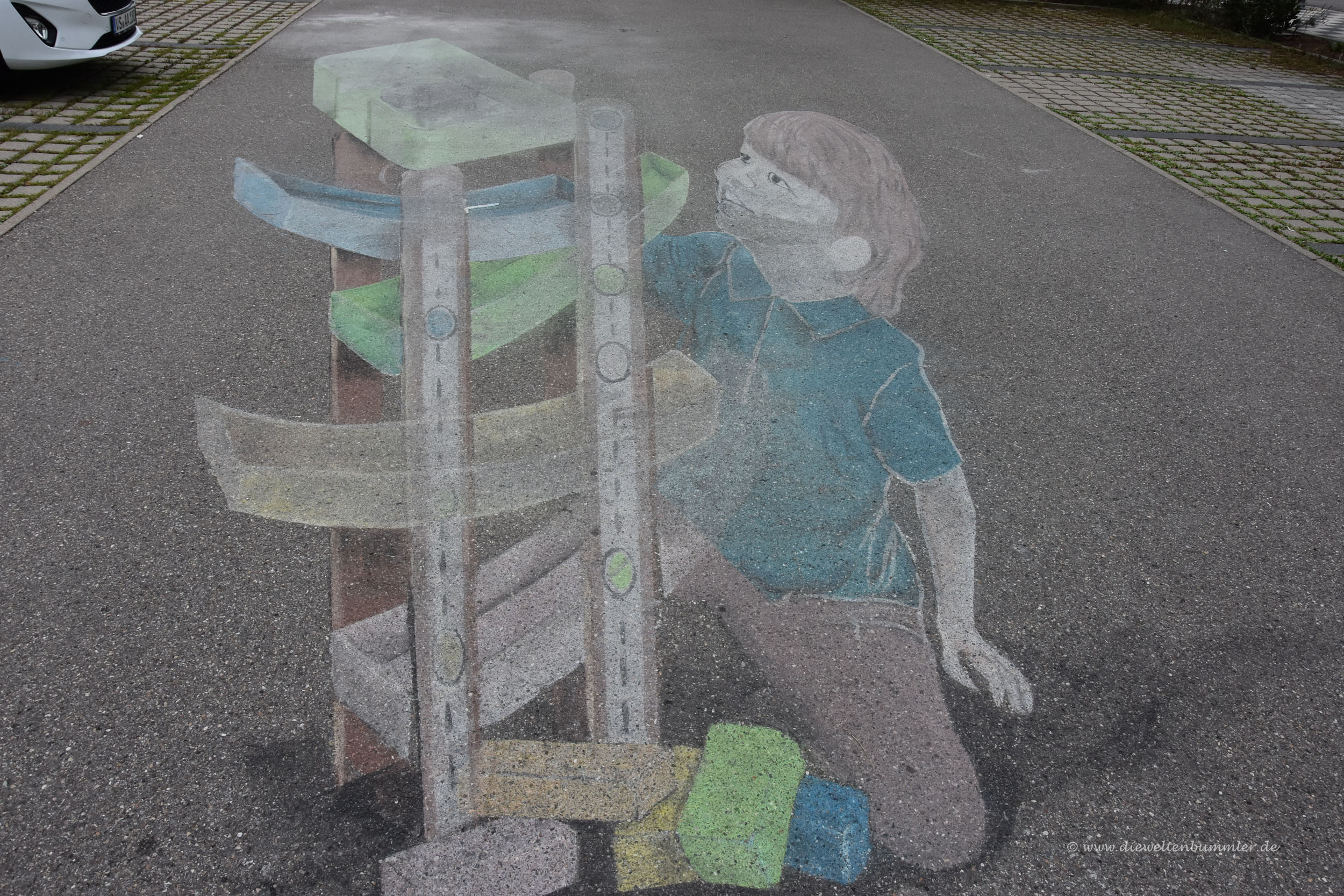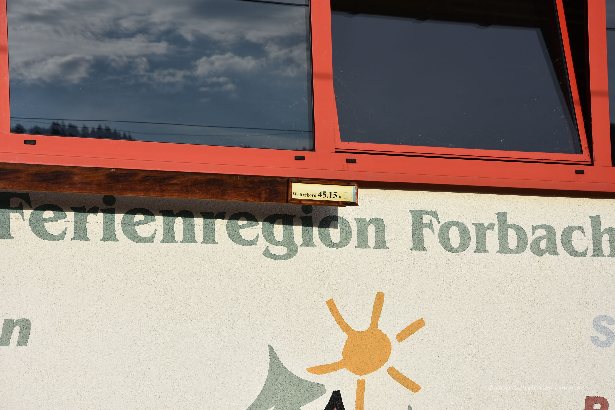Kaum wollten wir gerade losgehen, trafen wir den Vater an. Er erklärte uns ebenso freundlich, dass wir einfach hinterher zahlen könnten. Er wohne nebenan im Wohnhaus, wo er auch seinen Malerbetrieb hat. Das erklärte nun auch die bunt bemalten Holzblumen an den Stellflächen. Auch erklärte uns den Weg nochmal und gab uns als Tipp noch mit, dass es in Forbach das längste Brett der Welt geben würde. Man könne es sich am Bahnhof anschauen. Na, dachten wir, das machen wir doch glatt.