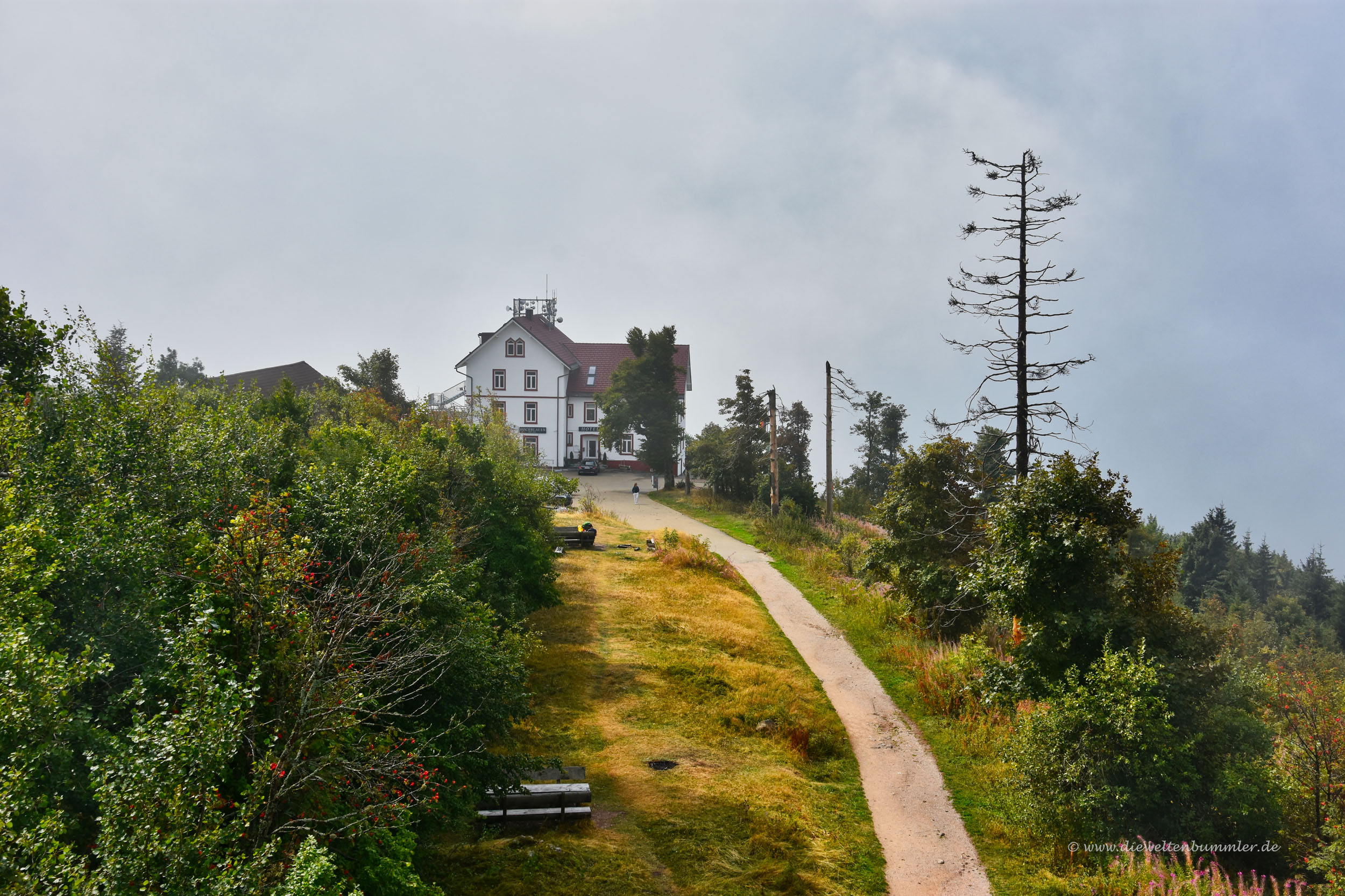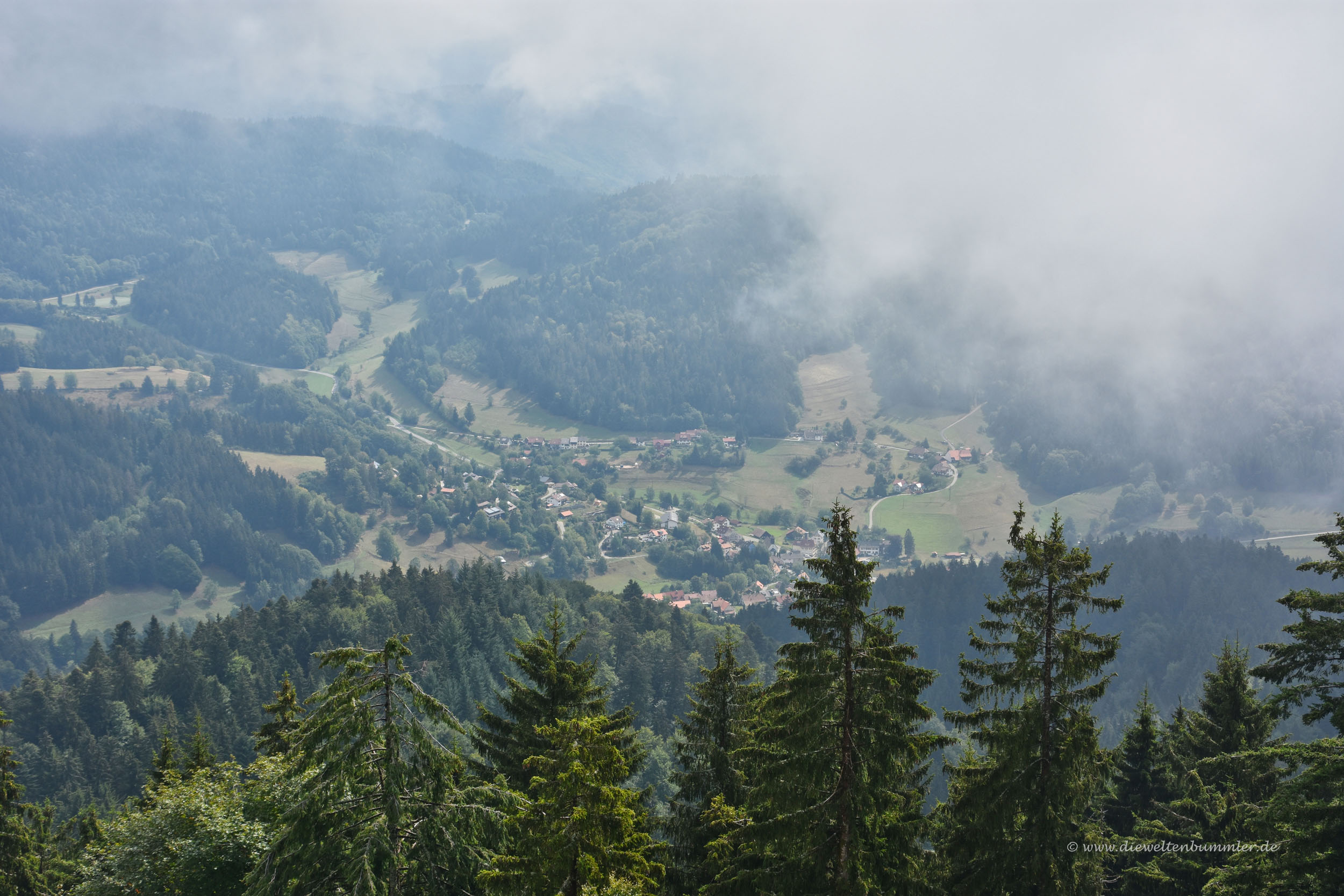 Das war aber nicht schlimm. So viel schöner war die Aussicht von dort oben auch nicht, weil eben vieles wolkenverhangen war. Vieles, aber zum Glück nicht alles. Zumindest in das Rheintal konnte man halbwegs blicken. Wir spazierten noch ein wenig auf dem Gipfel umher und waren ein wenig hin- und hergerissen. Sollten wir nun die Wanderer hier oben beneiden, weil sie deutlich mehr von der schönen Landschaft sehen würden als wir oder sollten wir froh sein, dass wir bei dem schlechten Wetter mal nicht viel wandern müssen?