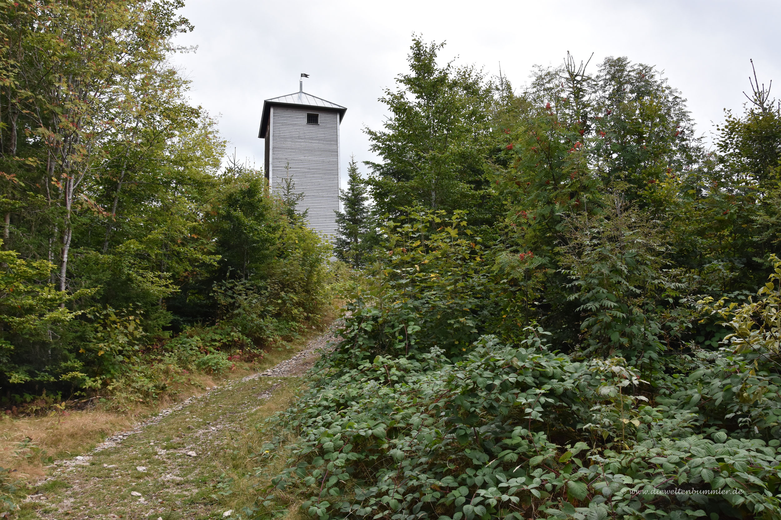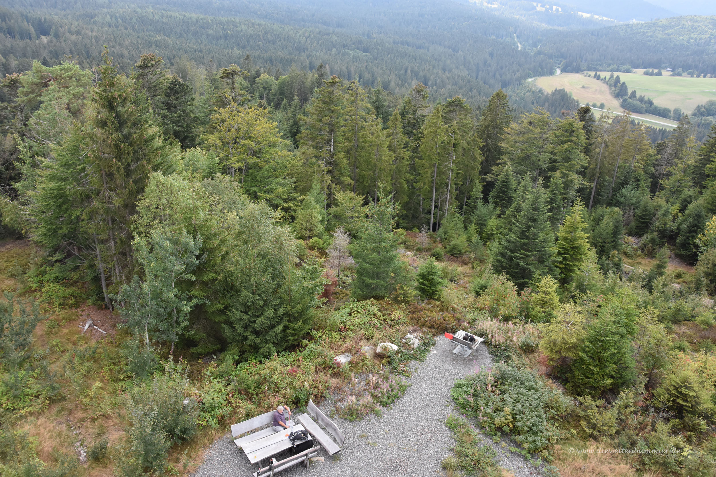 Nach einem kurzen Spaziergang kamen wir am Lehenkopfturm an und grüßten ein Wanderpärchen. Sie saß auf einem Waldmöbel mit Aussicht, während er mit dem dazugehörigen Hund in einiger Entfernung am Picknicktisch saß. Es wirkte, als hätten die beiden Stress miteinander. Aber das war nicht unsere Sorge. Wir gingen auf den Turm hinauf, genossen die Aussicht und machten entsprechend Fotos. Auch den Turm selber fotografierten wir natürlich als wir wieder unten waren. In dem Moment fragte uns der männliche Teil des Pärchens, warum wir denn wie wild fotografieren würden.