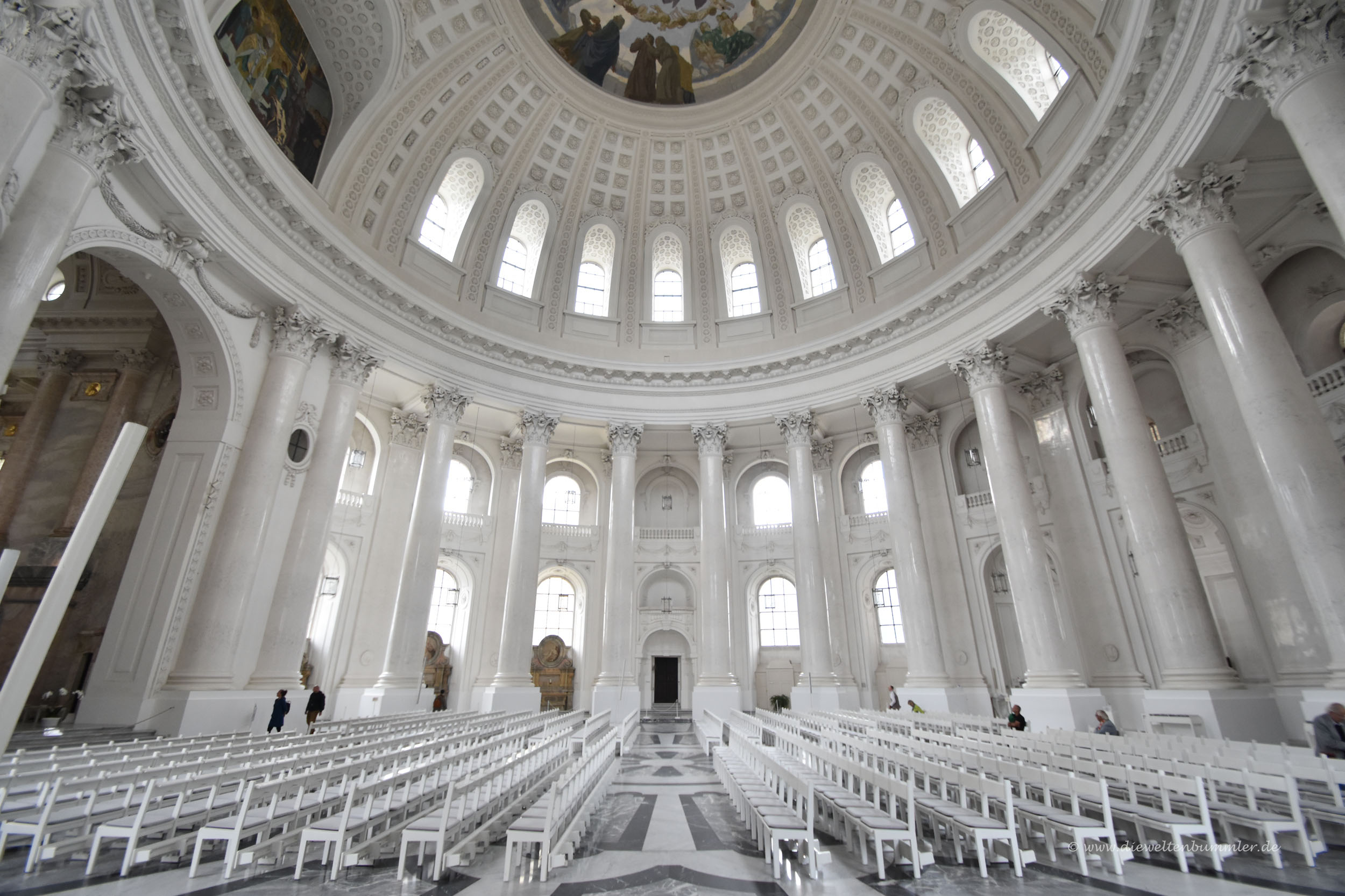 Allerdings fand ich ihn von außen trotz seiner Größe eher schlicht und grau. Als ich wir ihn aber betraten, war unsere Überraschung umso größer. In einem prachtvollen Weiß präsentiert sich das runde Kirchenschiff. Die Säulen und die Kuppel waren so hell und schön anzusehen, dass ich gleich mal das Objektiv wechselte und versuchte, das Ensemble mit dem Weitwinkel einzufangen.