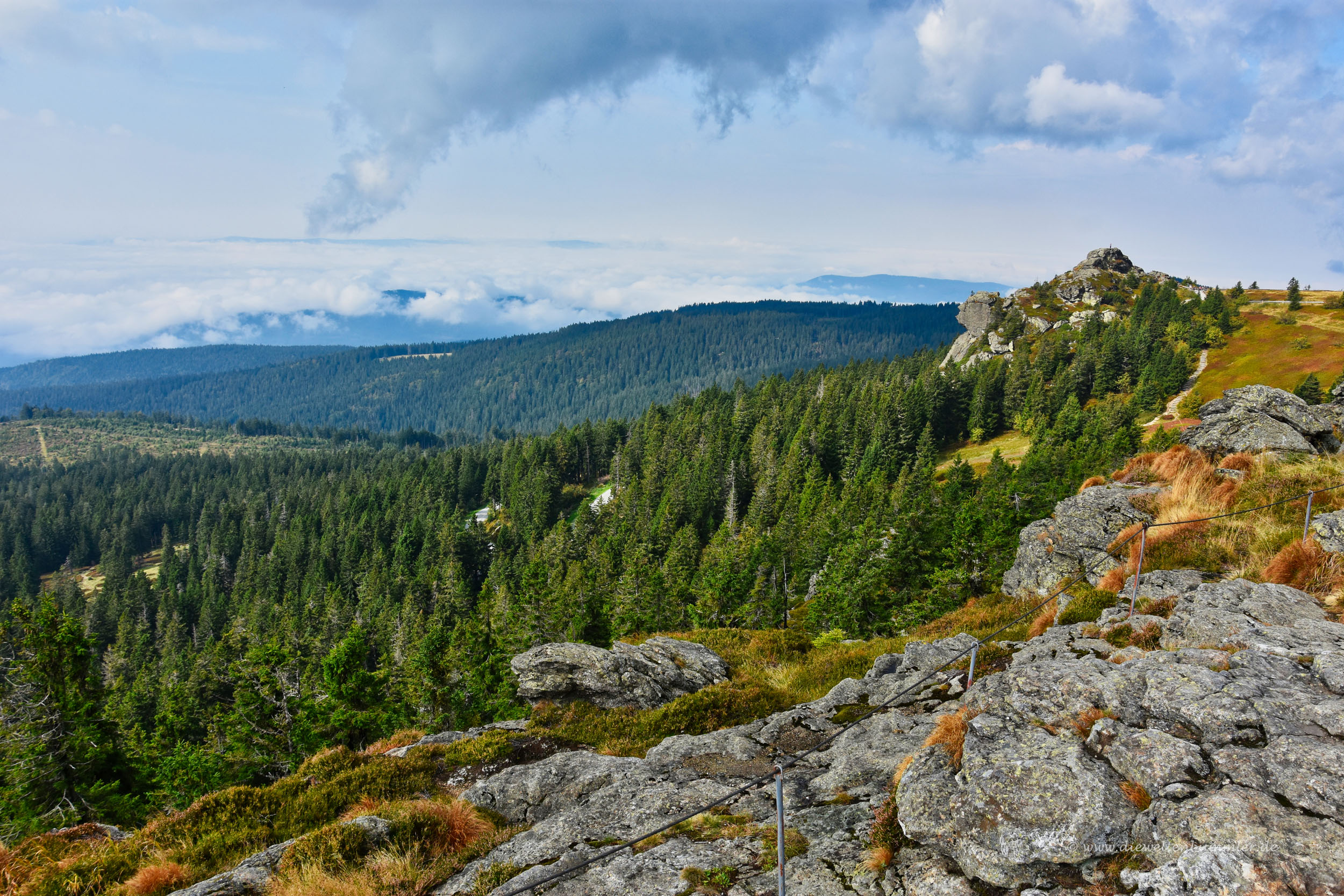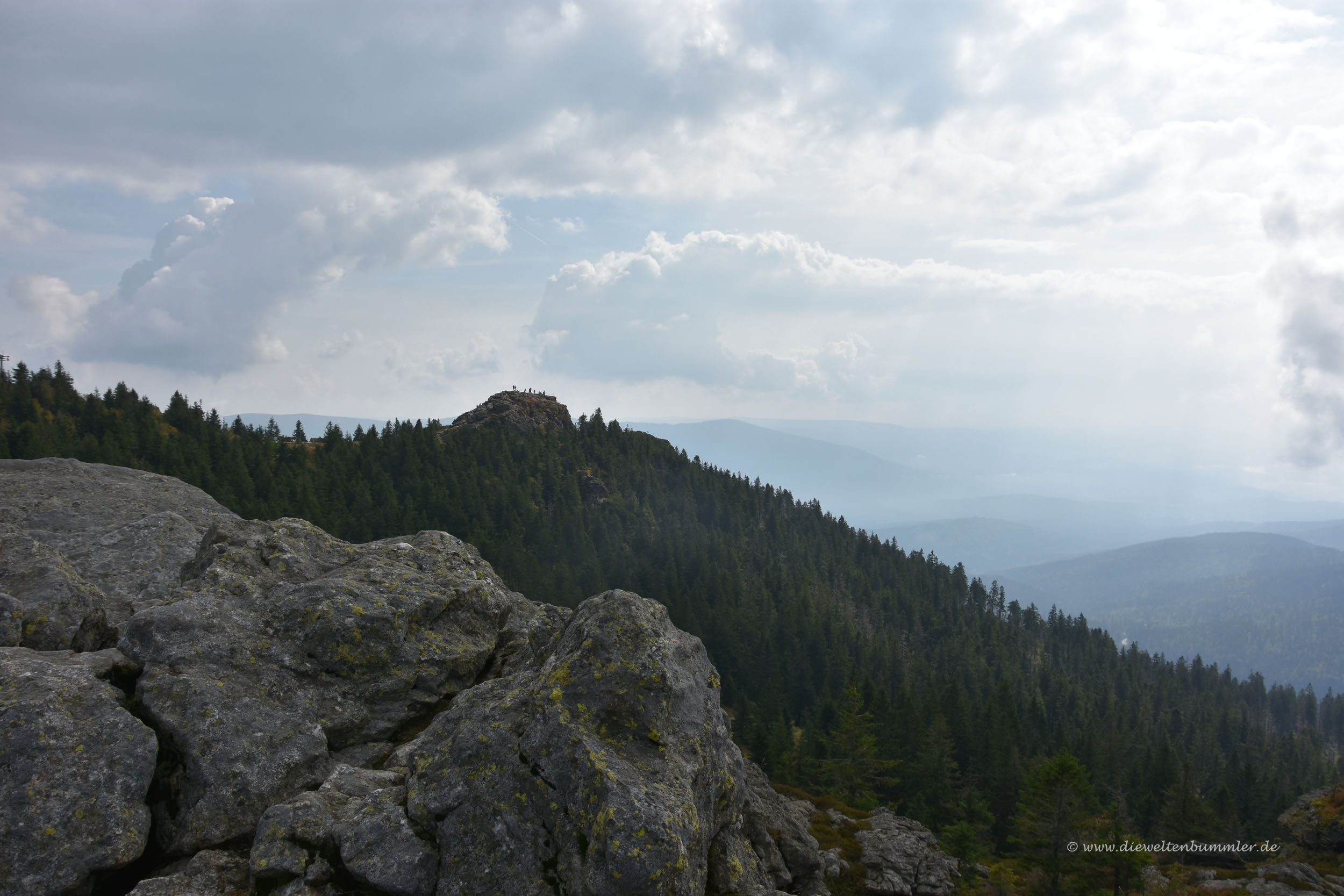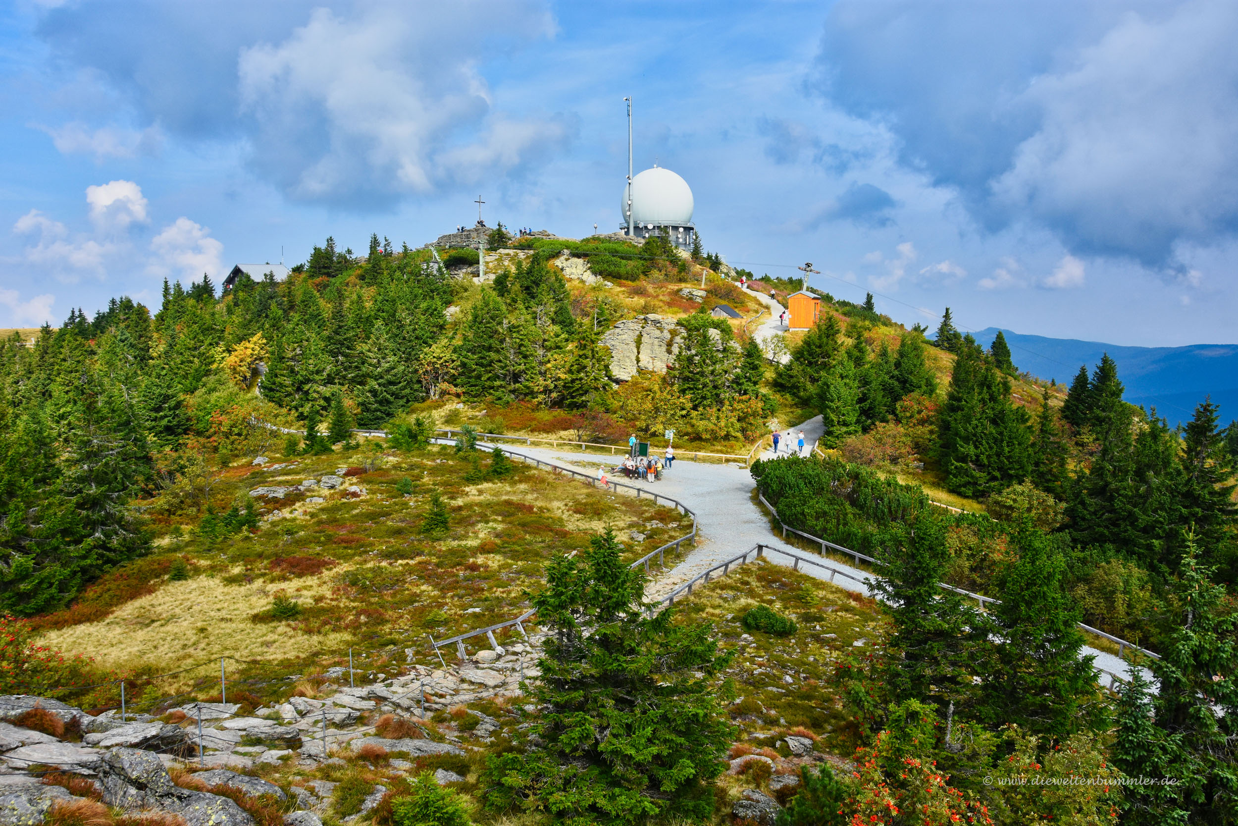 Einige Zeit später erreichten wir den Gipfel und schauten uns in Ruhe um. Der Große Arber hat ja eigentlich mehrere Gipfel bzw. Nebengipfel, die über breite Wege untereinander verbunden sind. Nach dem Rundgang gingen wir hinab zur Bergstation und stellten dabei fest, dass es nun deutlich voller wurde. Zahlreiche Besucher kamen uns plötzlich entgegen. Wanderer konnte man sie auf Grund ihres Gebarens nicht nennen. Da fielen nämlich jammernde Sätze wie steil es doch hier sei und der Wanderweg ist ja aus Felsen. Nein, diese Damen und Herren waren noch nie länger als drei Minuten auf einem Wanderweg. Sie entsprangen den Gondeln der Seilbahn, ganz offenkundig.