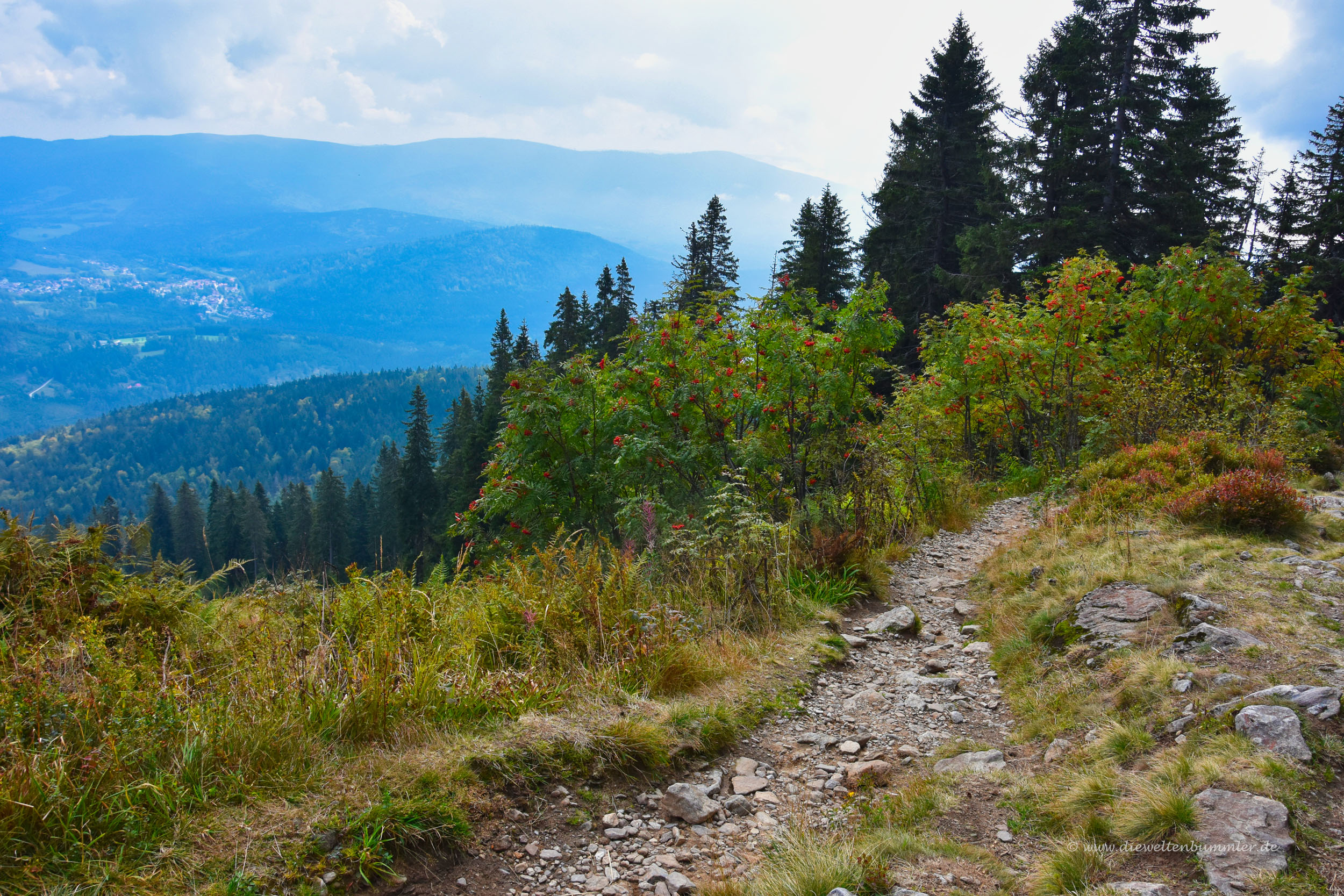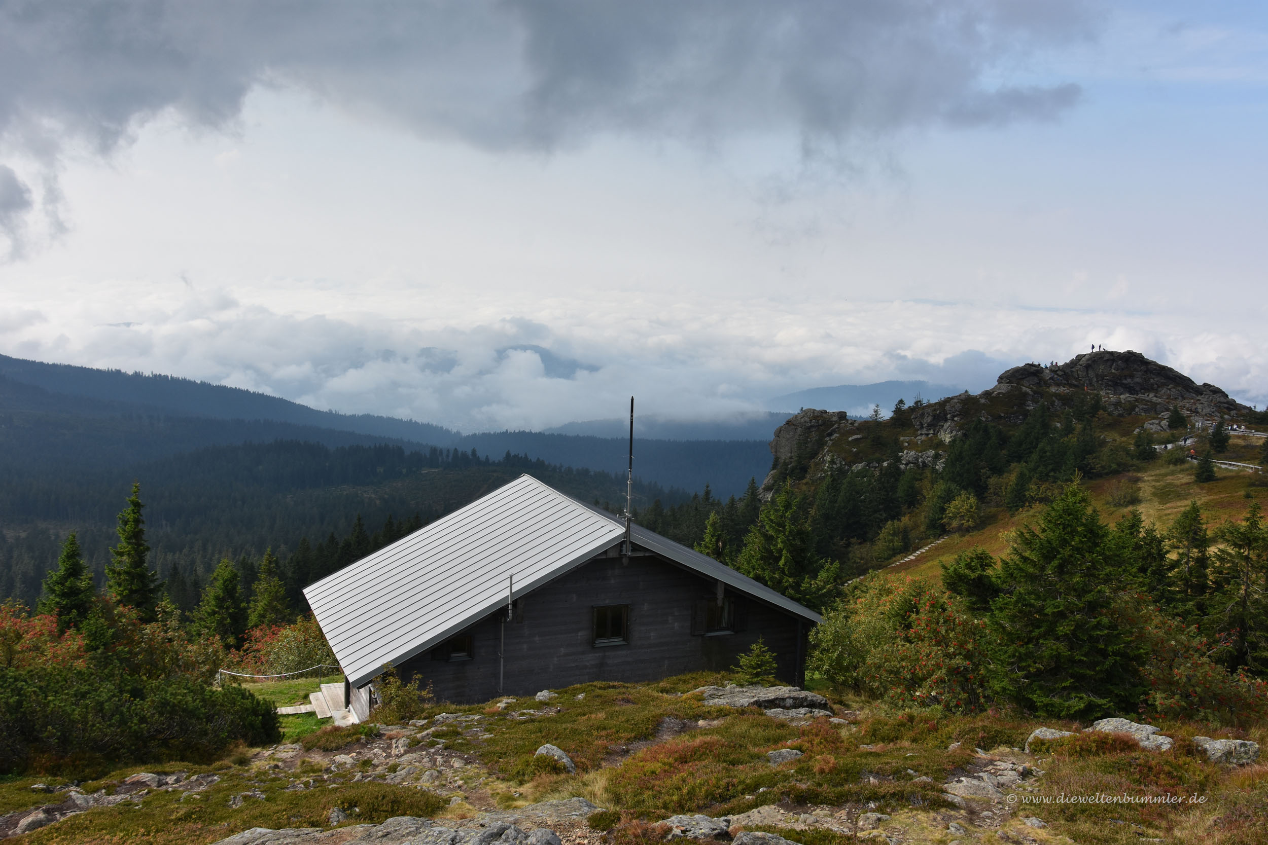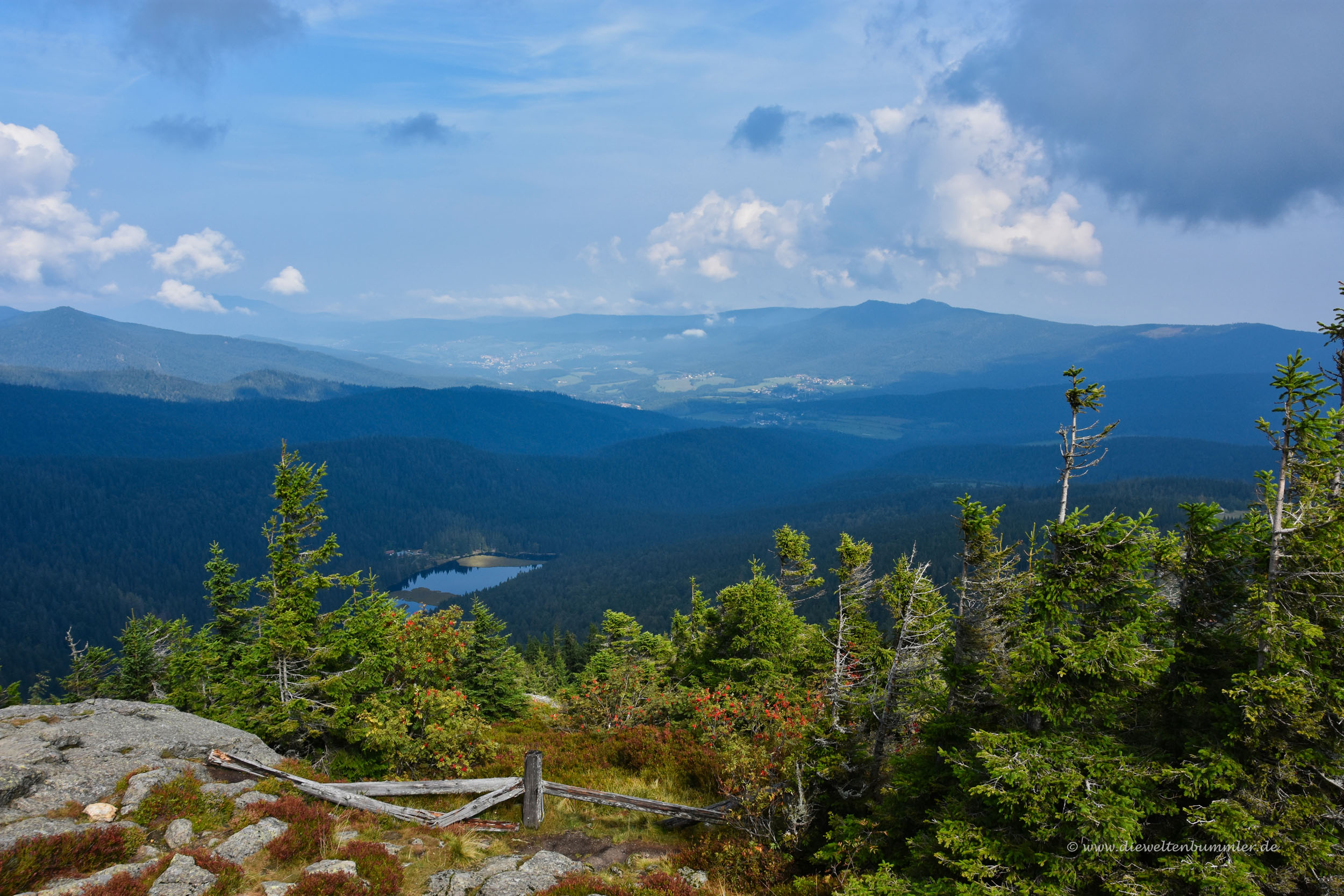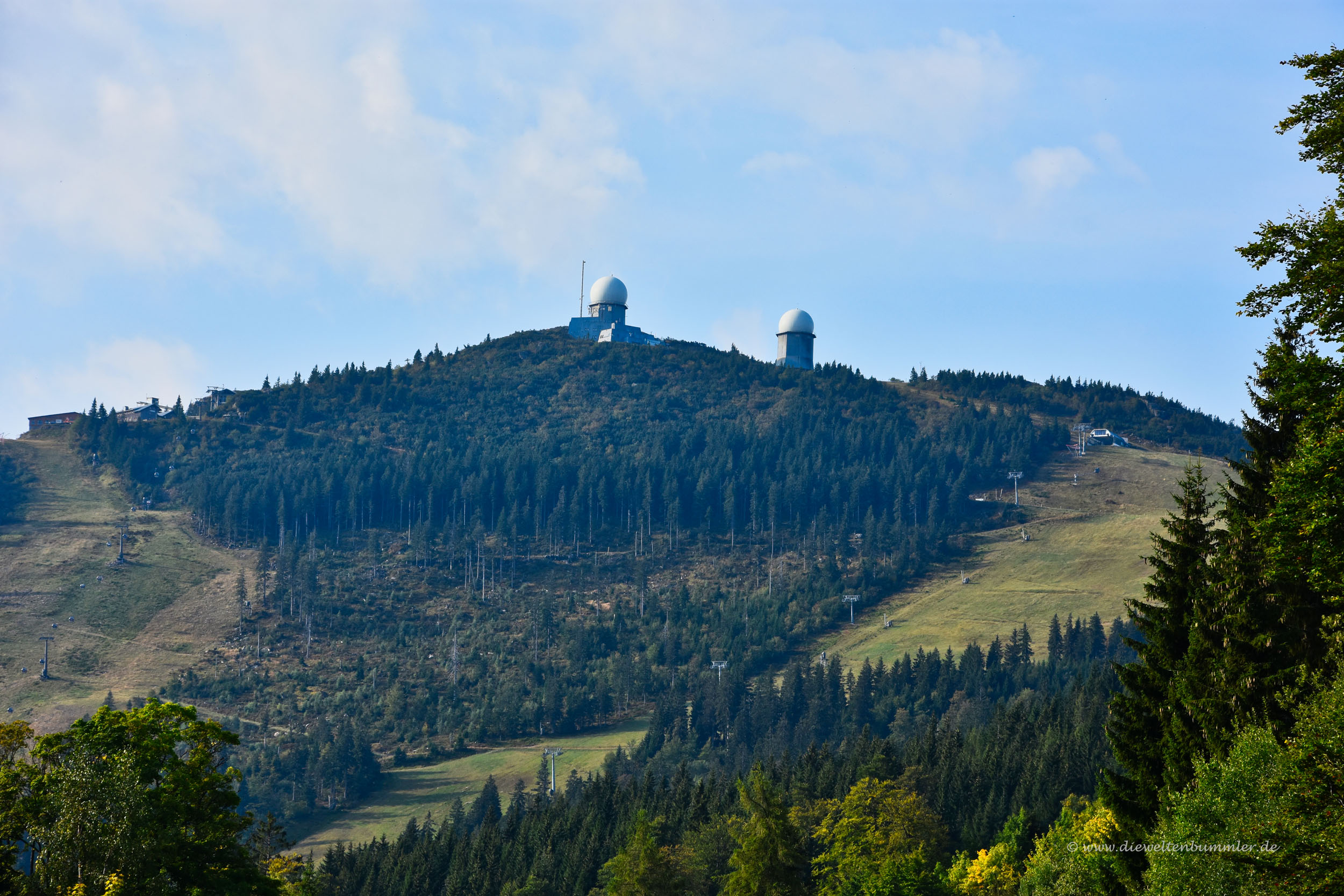 Einige Zeit später erreichten wir den Gipfel und schauten uns in Ruhe um. Der Große Arber hat ja eigentlich mehrere Gipfel bzw. Nebengipfel, die über breite Wege untereinander verbunden sind. Nach dem Rundgang gingen wir hinab zur Bergstation und stellten dabei fest, dass es nun deutlich voller wurde. Zahlreiche Besucher kamen uns plötzlich entgegen. Wanderer konnte man sie auf Grund ihres Gebarens nicht nennen. Da fielen nämlich jammernde Sätze wie steil es doch hier sei und der Wanderweg ist ja aus Felsen. Nein, diese Damen und Herren waren noch nie länger als drei Minuten auf einem Wanderweg. Sie entsprangen den Gondeln der Seilbahn, ganz offenkundig.
