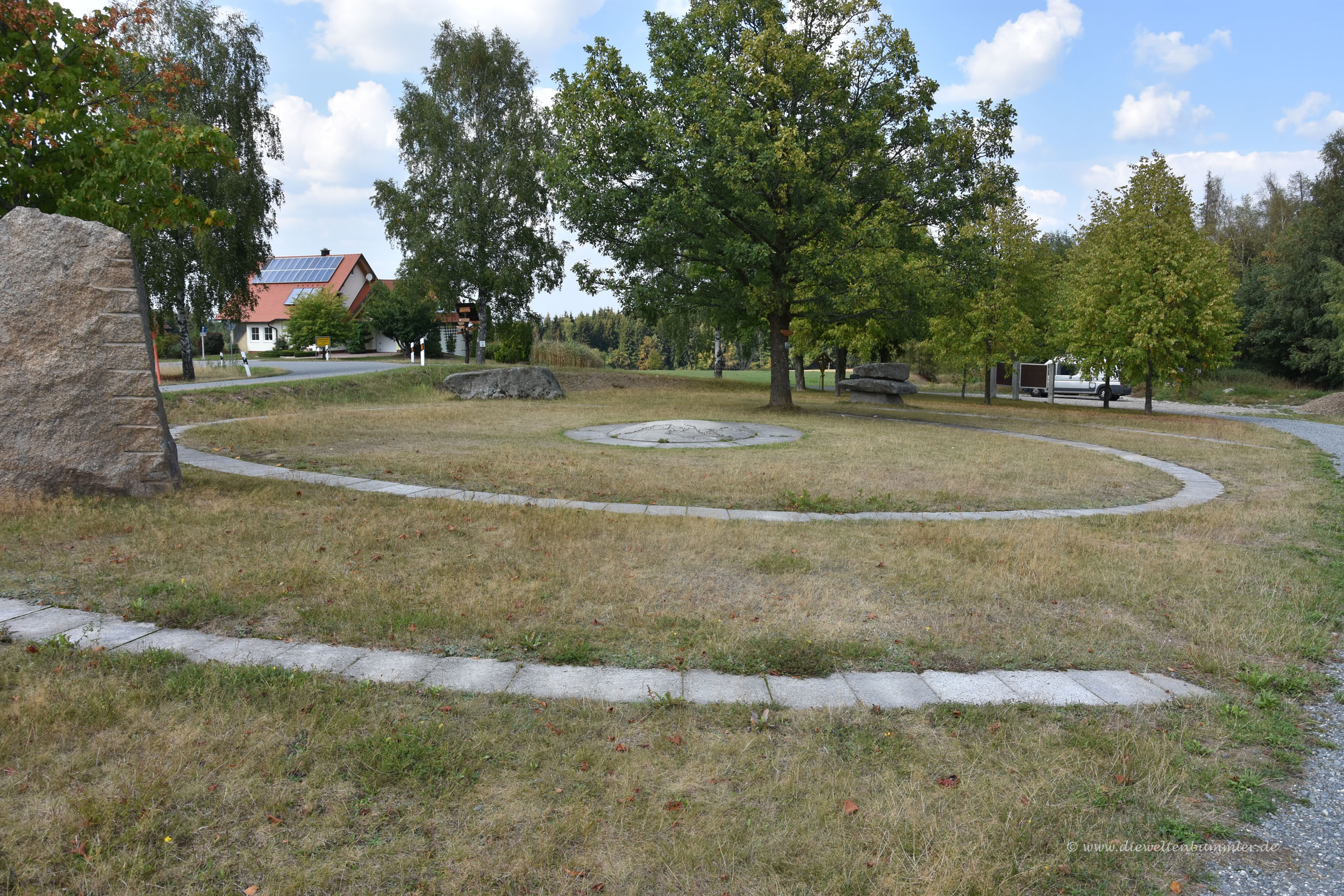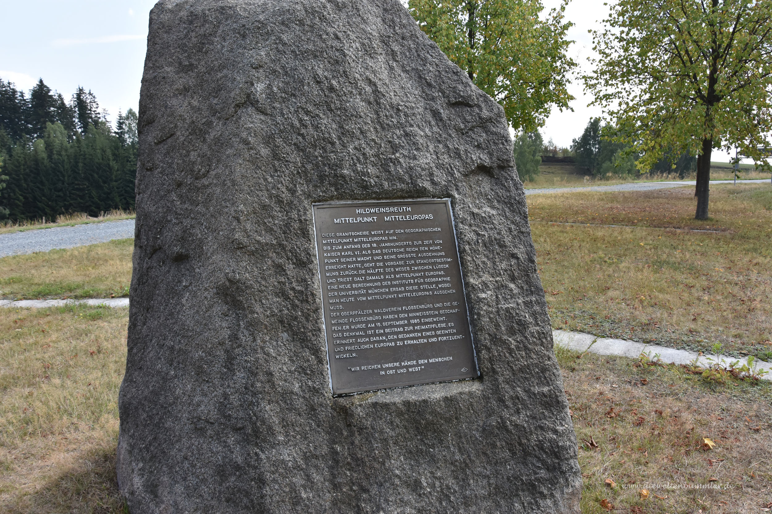 Nun waren wir wieder etwas länger unterwegs, denn wir fuhren in Richtung Flossenbürg nach Norden. Es war nicht die Gedenkstätte, die wir besuchen wollten, denn die hatten wir schon im Frühjahr kennengelernt. Vielmehr wollten wir zum sogenannten geografischen Mittelpunkt von Mitteleuropa. Unweit des Ortes befand sich hierfür eine Markierung und genau diese hatten wir bei unserem Besuch im Frühjahr aus verschiedenen Gründen verpasst. Aber da wir ja quasi in der Nähe waren, konnten wir das jetzt nachholen.