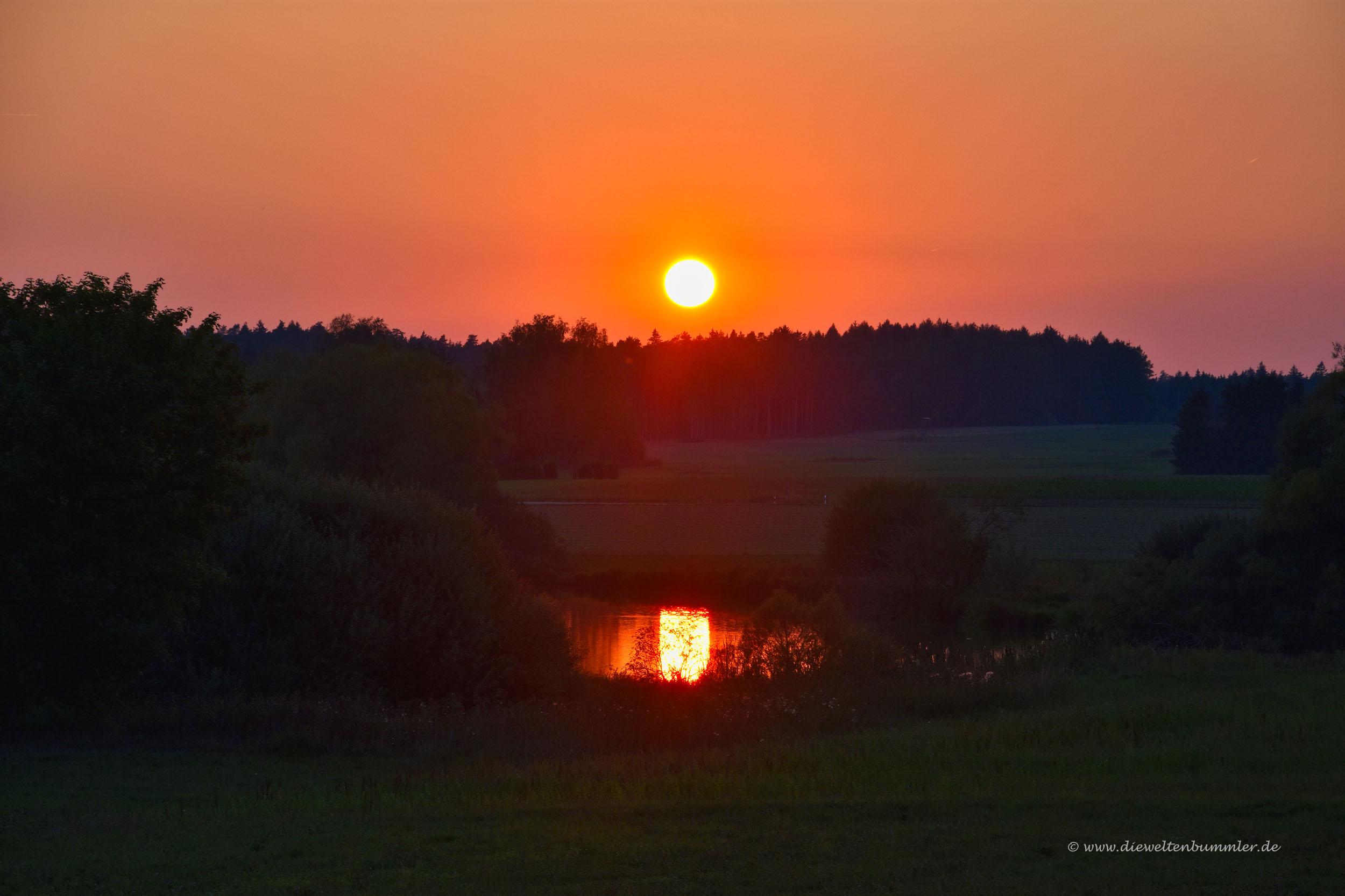 Bei Auerbach bogen wir links auf eine kleine Landstraße ein und passierten einen See namens Lohwiesenweiher. In diesem See spiegelte sich die untergehende, rote Sonne wunderbar und so hielten wir spontan an, um den Moment mit der Kamera festzuhalten. Auf der kleinen unbedeutenden Straße war ja sonst keiner unterwegs. Der Stellplatz an der Gaststätte Schlupfloch ist gerade einmal 700 Meter entfernt und wir ahnten nicht, dass wir bereits vom Betreiber beobachtet wurden.