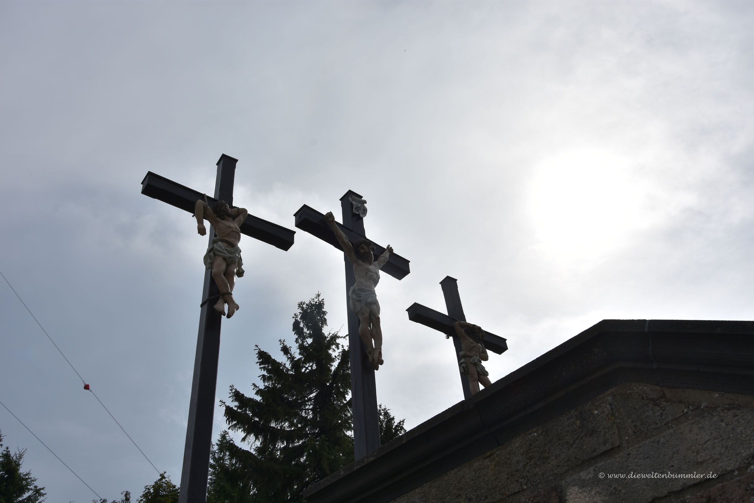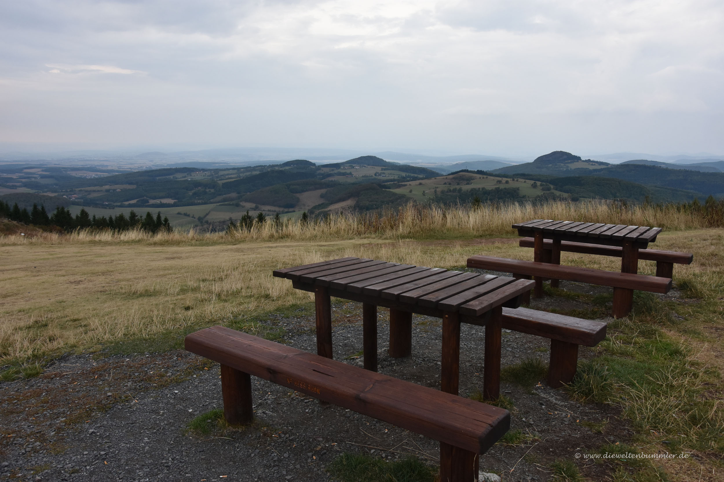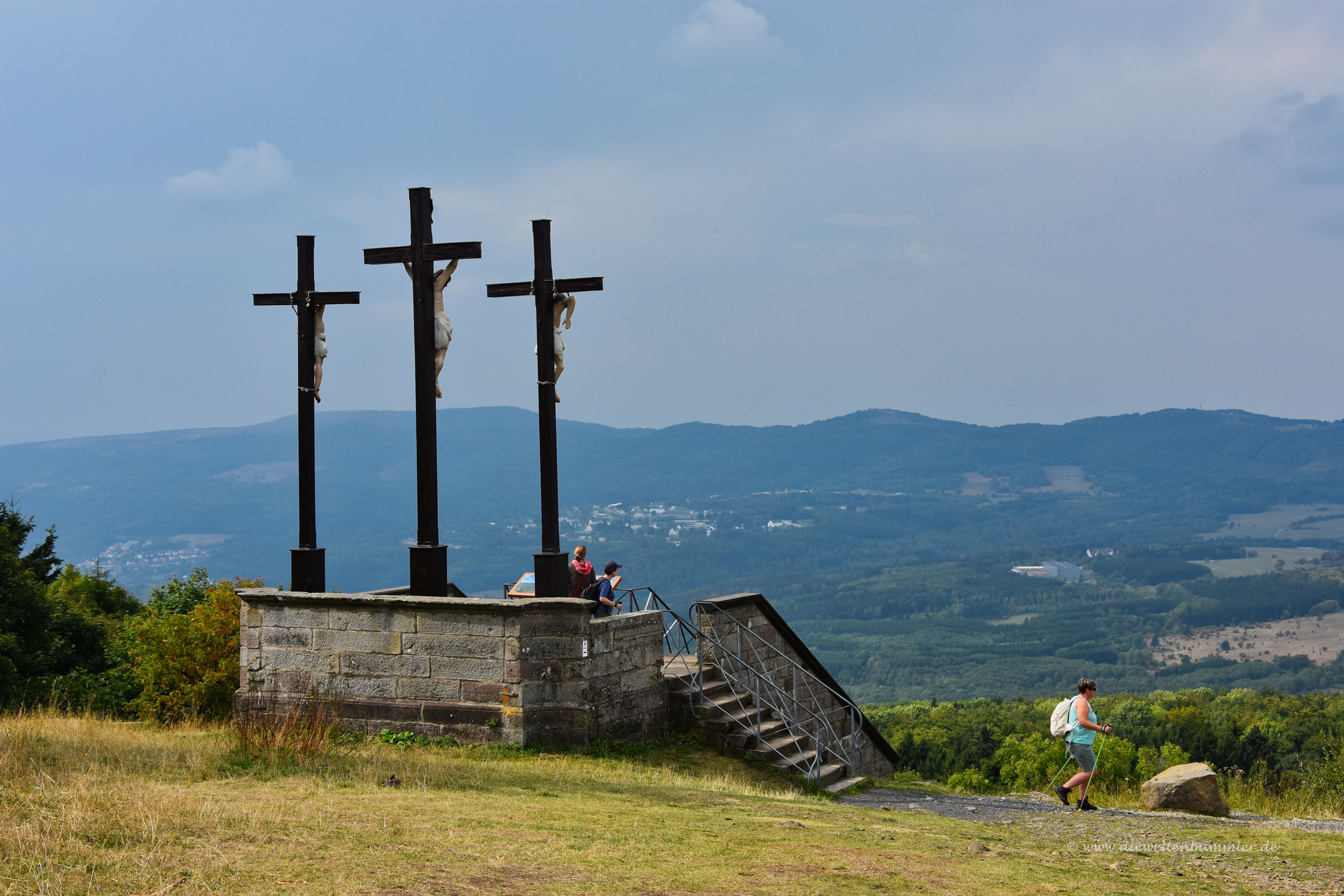 Doch vorher spazierten wir zum Gipfel und wagten uns die zahlreichen Treppenstufen zu den drei Kreuzen hinauf, die den Kreuzberg zieren. Für das Kloster und die dortige Einkehrmöglichkeit konnten wir uns weniger erwärmen. Eher spazierten wir ein wenig über das Gipfelplateau, schauten uns den Sender an und gingen nach einem angenehmen Rundgang wieder zurück zum Auto. Eines unserer nächsten Ziele zeigte sich ja schon in der Ferne, denn zur Wasserkuppe würden wir ja auch noch fahren wollen.