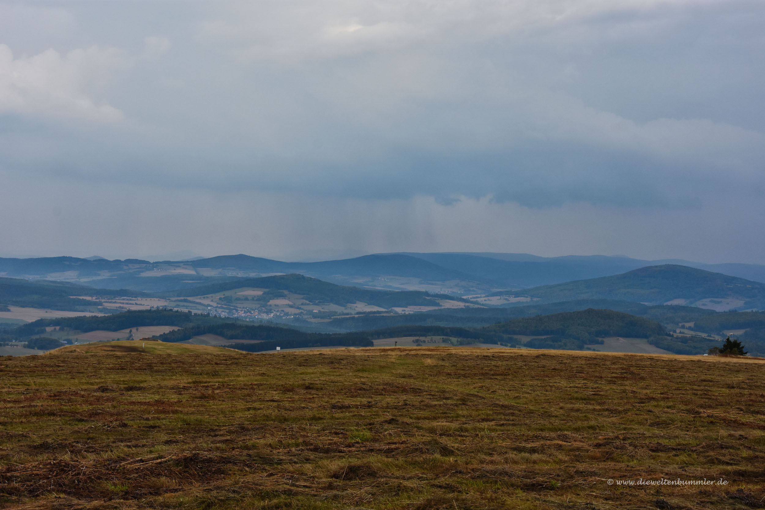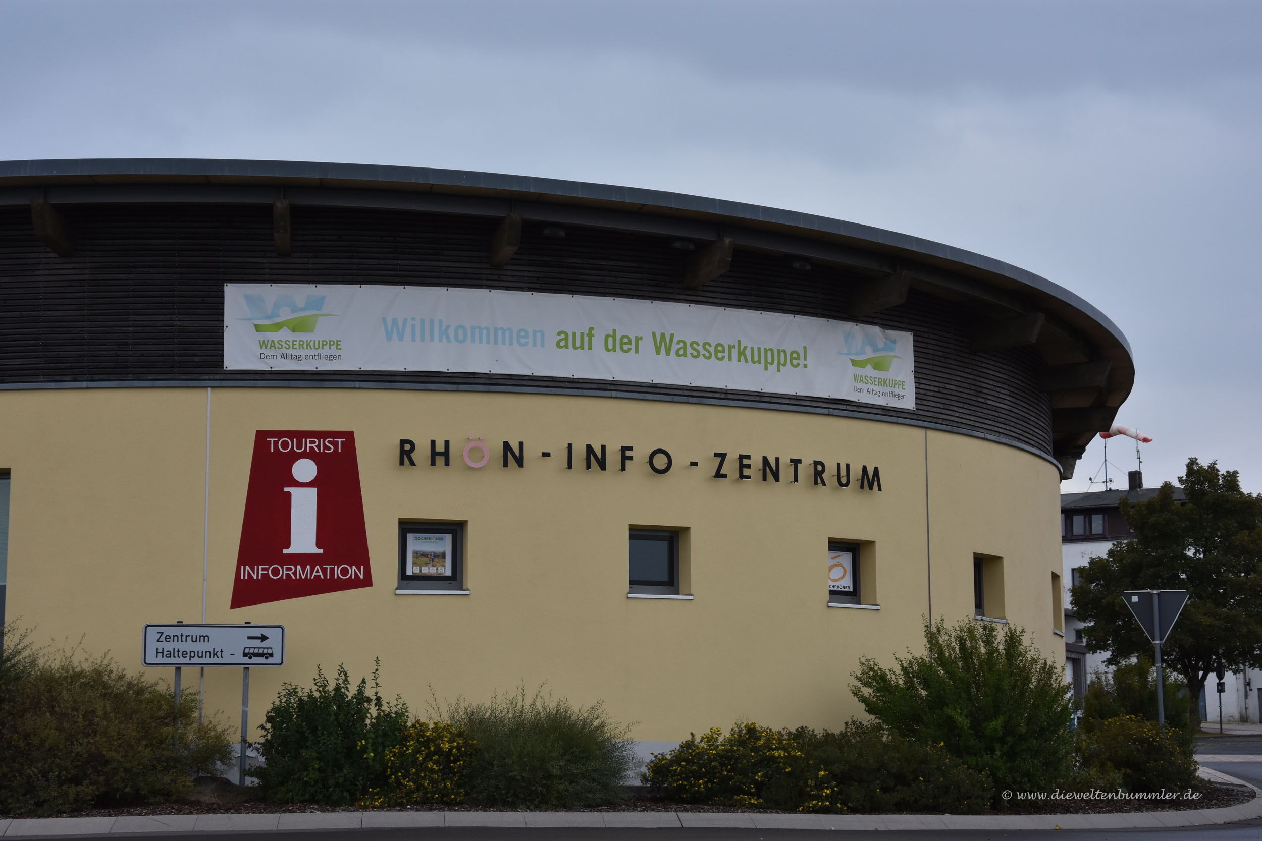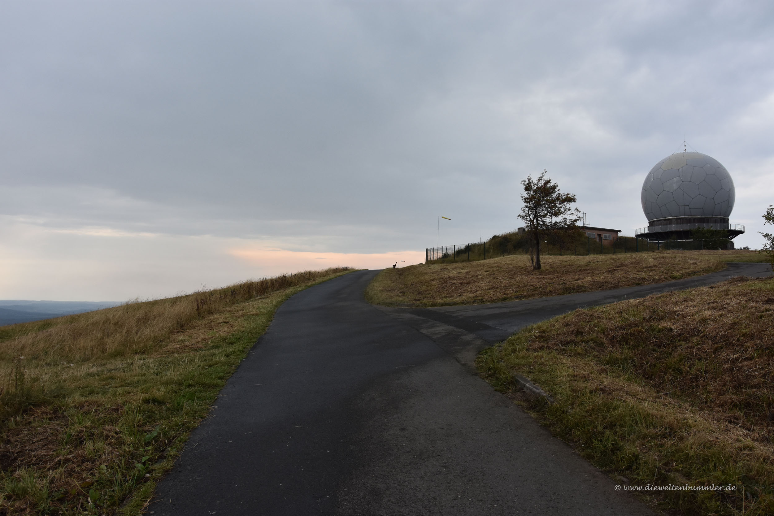 Da der Regen uns glücklicherweise verschonte, konnten wir auch noch schnell zur Wasserkuppe hinauf fahren. Diese kannten wir ja auch schon. Ist zwar schon wieder ein paar Jahre her, aber ich hatte ja mal eine Bilder-Ausstellung im Rathaus von Poppenhausen gehalten und in dem Zusammenhang besuchten wir auch die Wasserkuppe. Das Wetter war dunstig, diesig und dunkel. Oder anders ausgedrückt: Es war nicht einladend. Daher und durch die Tatsache, dass es schon ein wenig später war, war es auf der Wasserkuppe ziemlich leer. Das fanden wir ganz angenehm und so spazierten wir einmal um das Radom und wieder zurück.