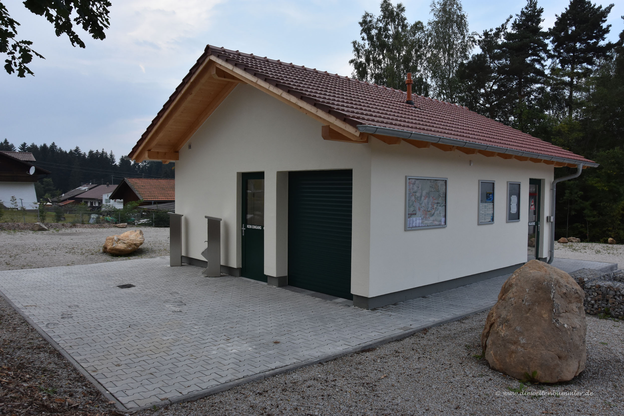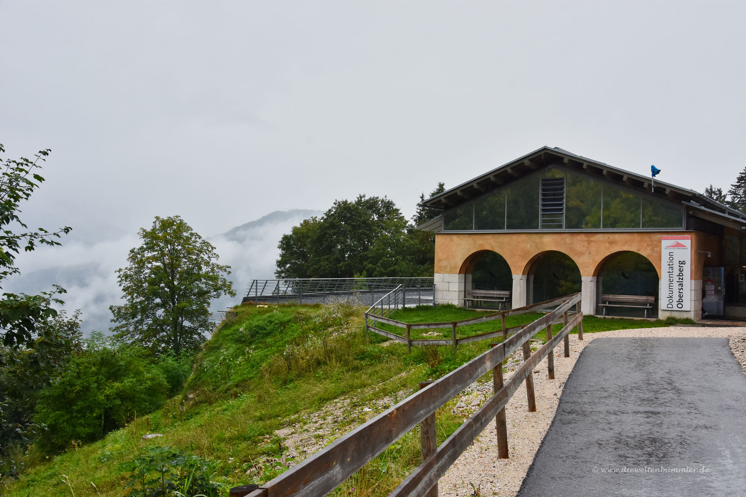 Es sind nur ein paar Fahrminuten vom Stellplatz zur Dokumentationsstätte Obersalzberg. Die hatten wir damals auf unserer Fahrt im Jahr 2014 mit dem Wohnmobil durch die Alpen bereits aus Zeitgründen ausgelassen. Dieses Mal stand sie fest auf dem Programm. So ist das halt manchmal bei uns. Was dieses Mal nicht klappt, klappt bei der nächsten Tour. Und so fuhren wir zur Dokumentationsstätte und stellten uns partout dort auf den falschen Parkplatz. Im Regen lief ich um das Gebäude und stellte fest, dass es sich nicht um das Museum handelte, sondern um ein Restaurant. Na toll. Aber es war nicht schlimm, da wir sowieso viel zu früh dran waren. Die Gedenkstätte öffnete erst eine halbe Stunde nach unserer Ankunft.