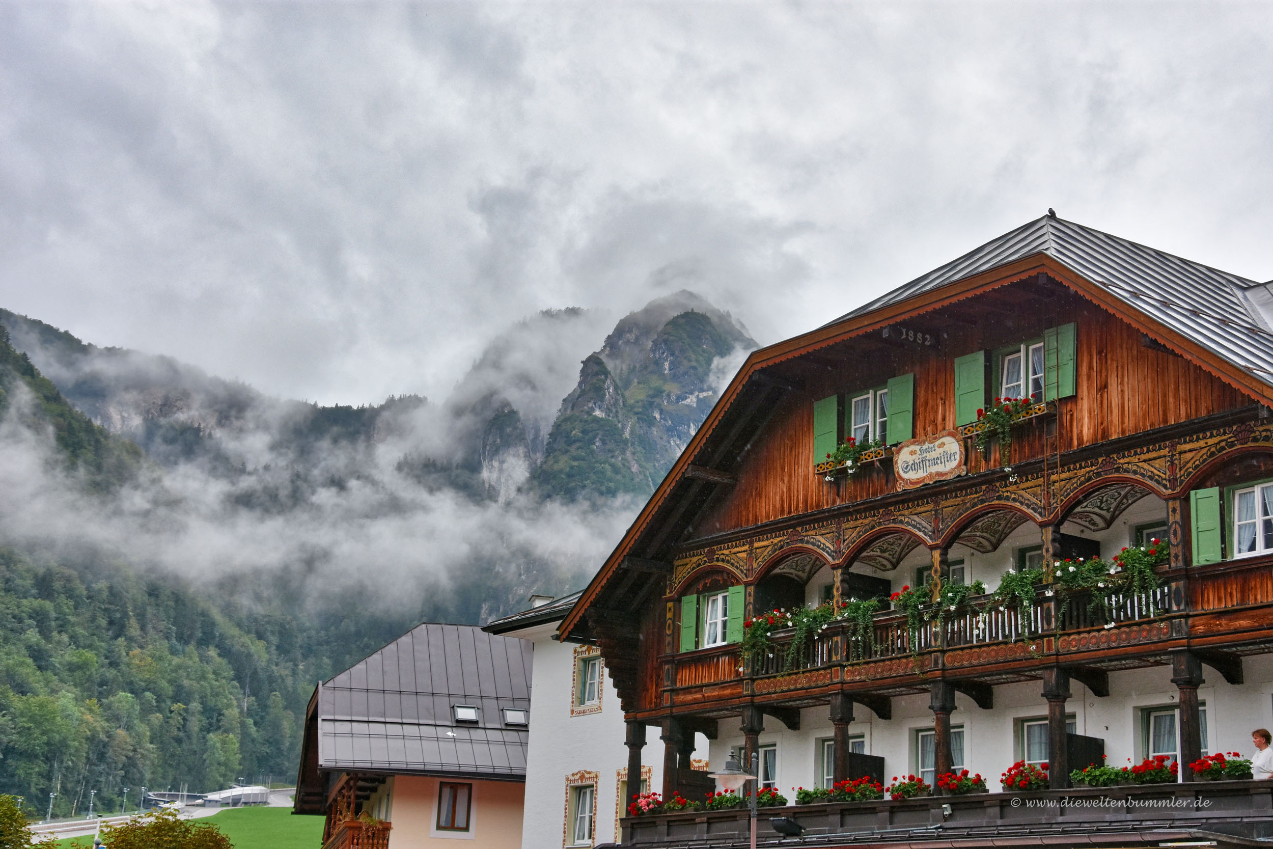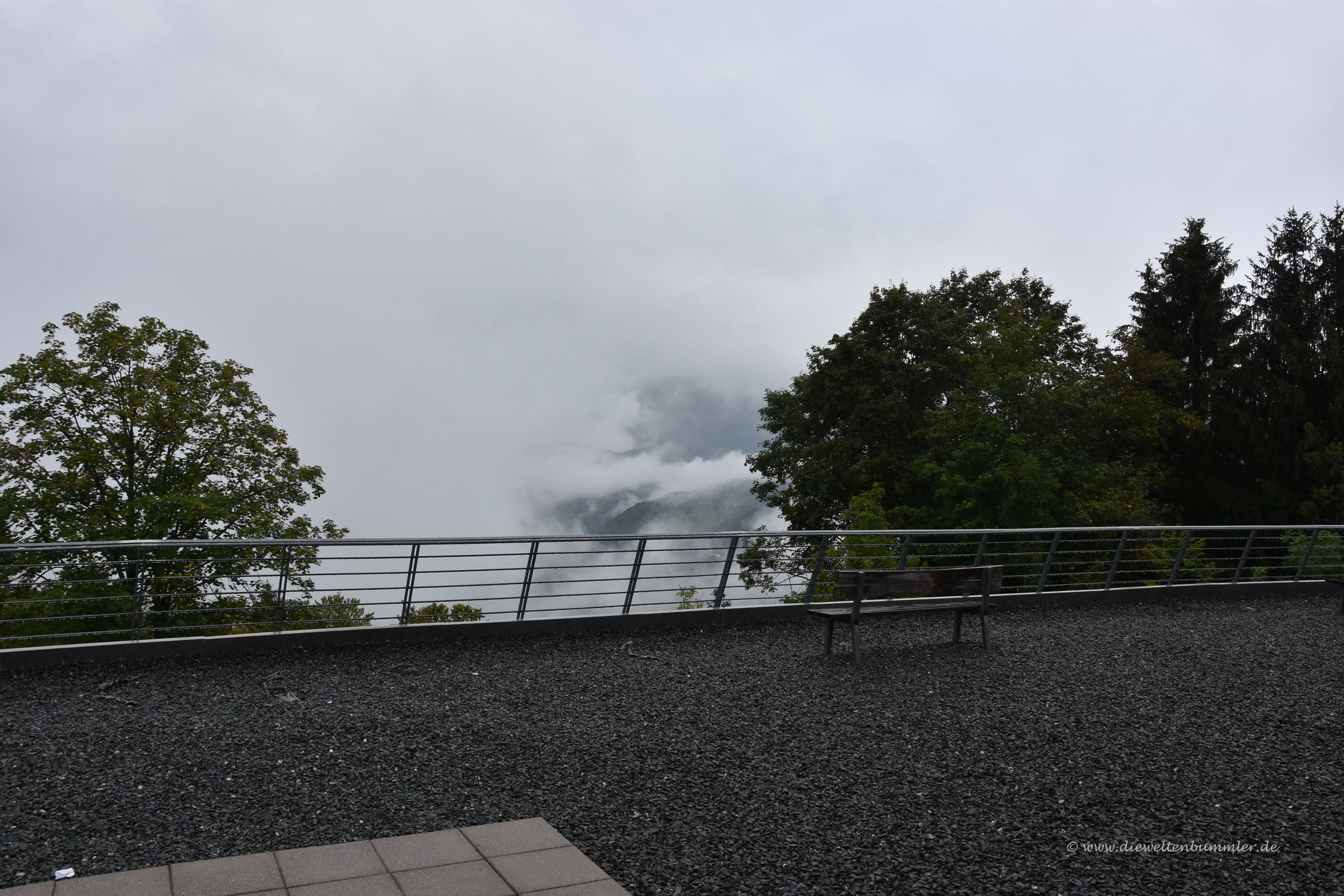 Nach dem Rundgang durch die Ausstellung, bei der wir wegen Renovierungsarbeiten auf die Bunkeranlagen verzichten mussten, fuhren wir vorsichtig die steile Straße hinab ins Tal. Eine Fahrt hinauf auf das Kehlsteinhaus lohnte sich nicht. Die Sicht war dort oben gleich Null. Schon wenige Höhenmeter über uns war die Wolkendecke mal wieder so dicht, dass man kaum etwas sehen konnte.