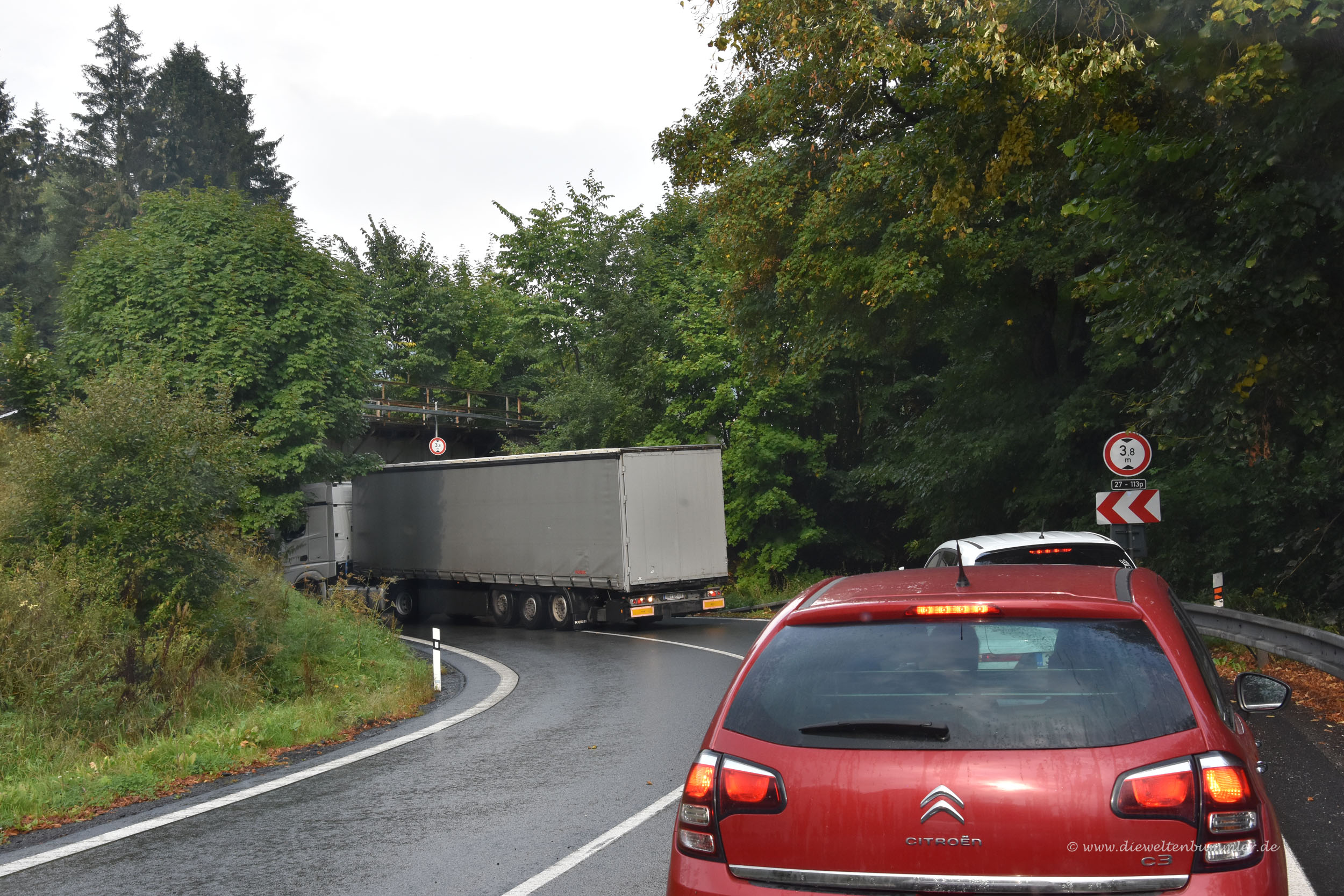 Es dauerte ein Weilchen bis er zumindest so rangieren und Luft aus den Reifen ablassen konnte, damit der Verkehr wieder fließt. Moni huschte schnell in die Supermärkte und brachte Leckereien aus Tschechien mit, während ich am Wohnmobil wartete, weil wir keinen Parkplatz gefunden hatten. Danach ging es die gleiche Strecke wieder zurück, wo wir sehen konnten, dass an der Eisenbahnbrücke mittlerweile die Polizei den Verkehr regelte.