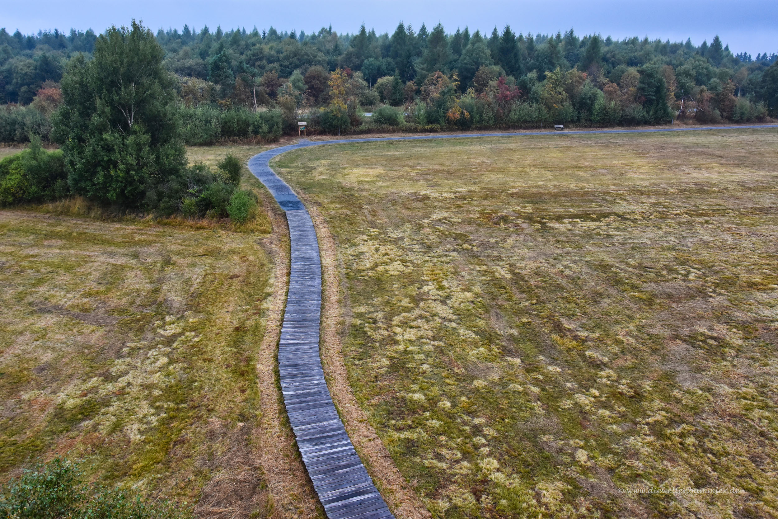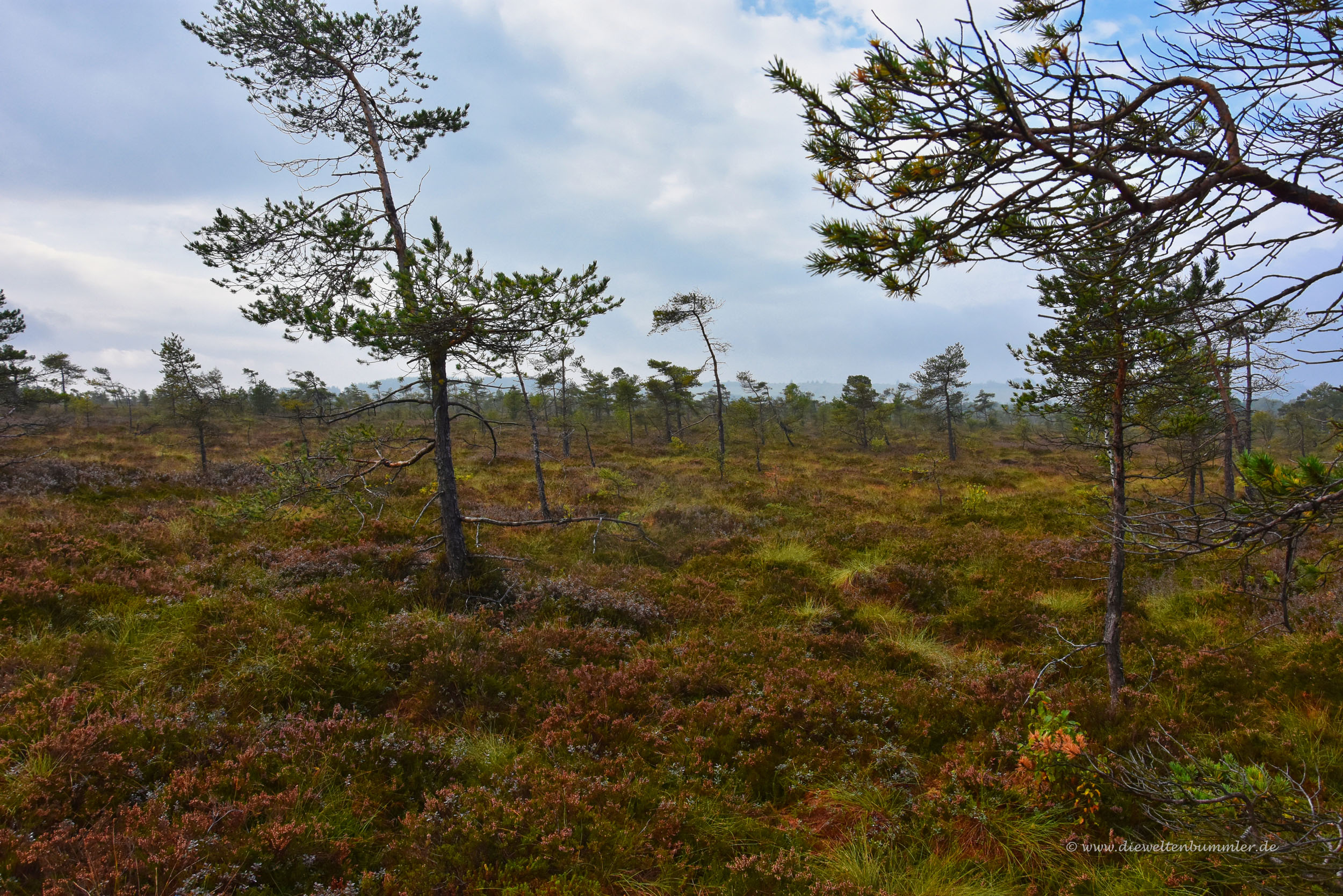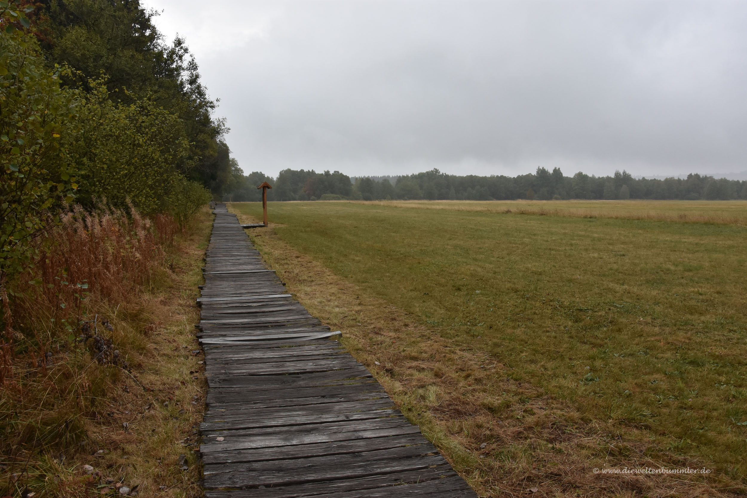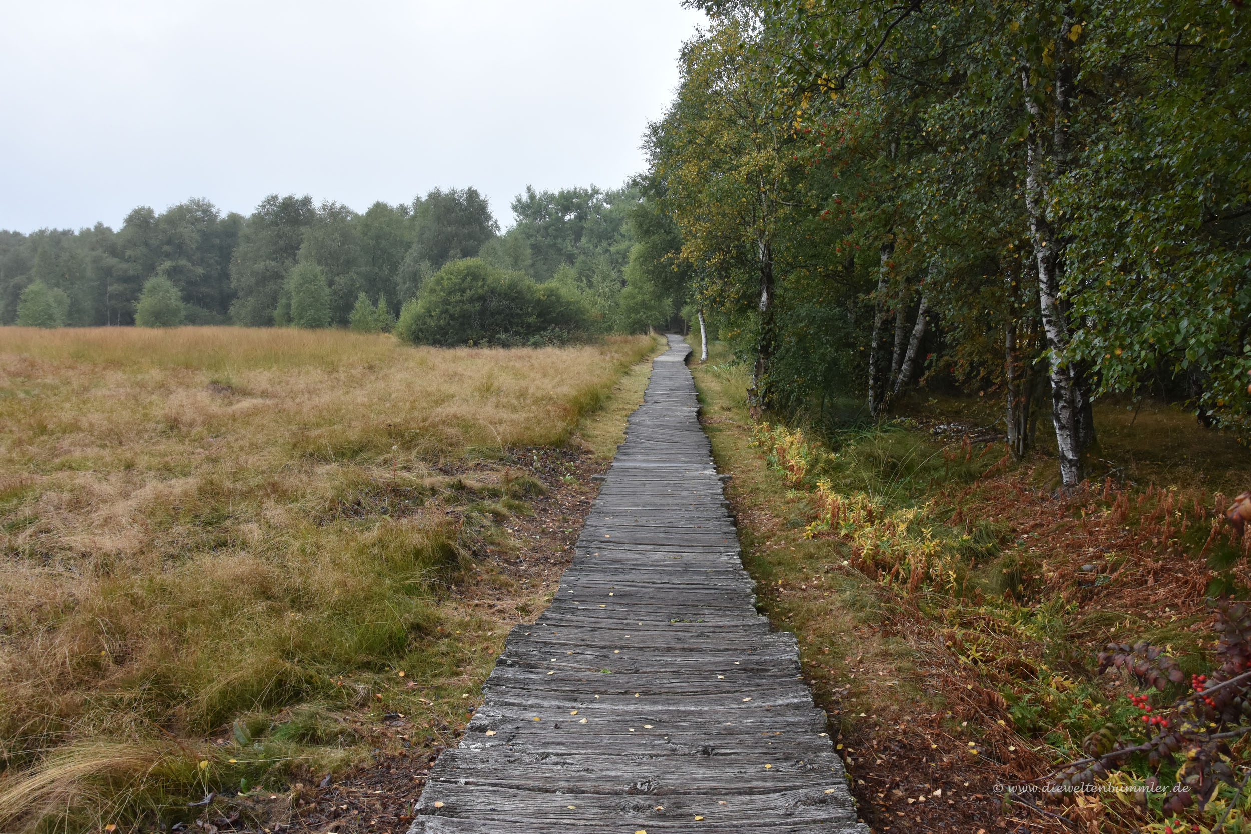 Wir spazierten zum Schwarzen Moor, betraten es und folgten auch hier wieder einem Holzbohlenweg. Wir gingen zunächst mal zum Aussichtsturm, denn ein Teil des Weges war wegen Renovierungsarbeiten gesperrt. Nachdem wir oben auf dem Turm die Aussicht genossen, schauten wir aber einfach mal nach, ob man auf dem Weg denn nicht von der anderen Seite kommen könnte. Und tatsächlich, es war nur ein kleines Stück vom Rundweg gesperrt, so dass zwei Sackgassen entstanden. Die längere Sackgasse gingen wir also auch bis zu ihrem Ende durch und kamen damit wunderbar durch das Schwarze Moor. Sogar zwei Mal, denn durch die Baustelle mussten wir ja auch wieder zurück.