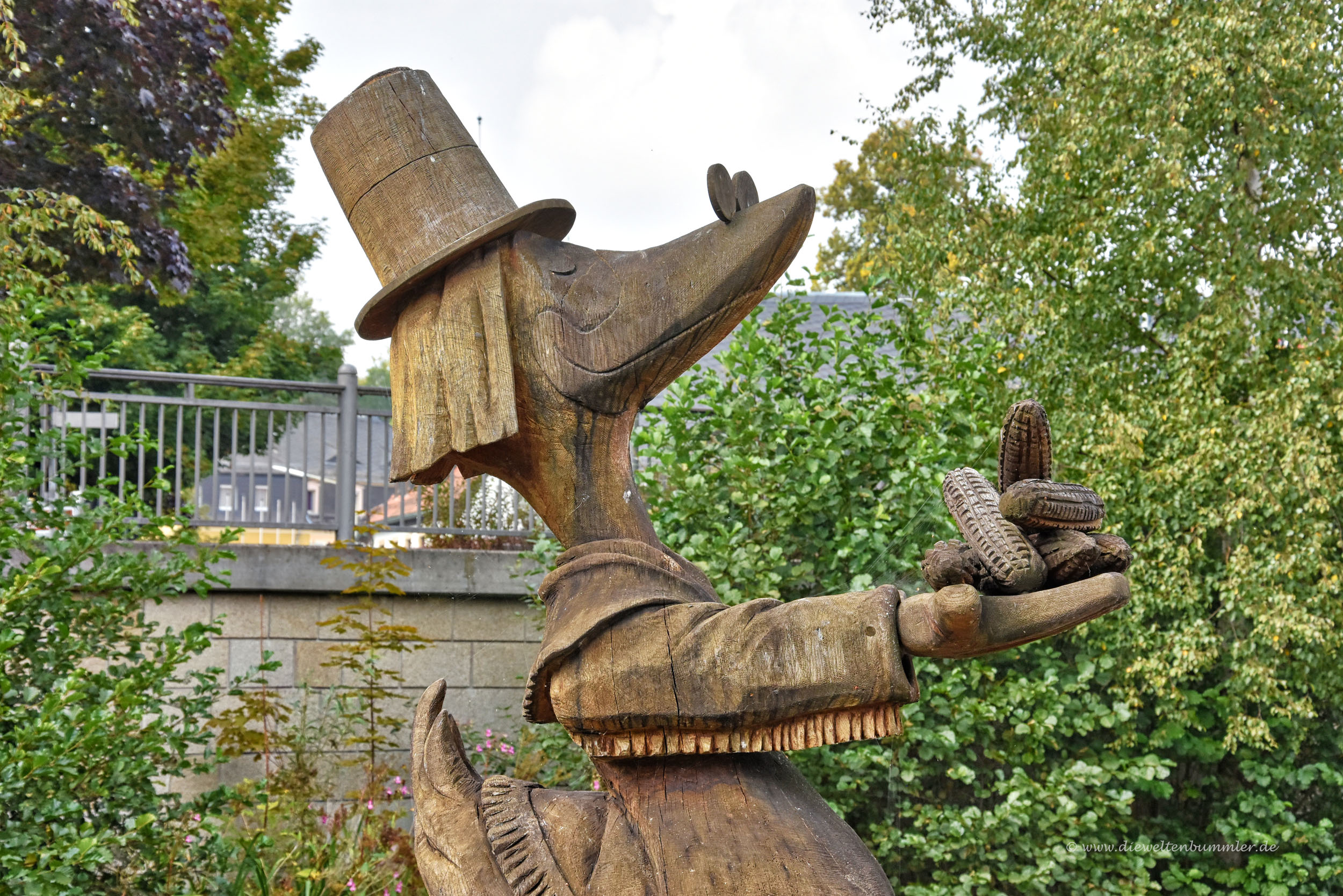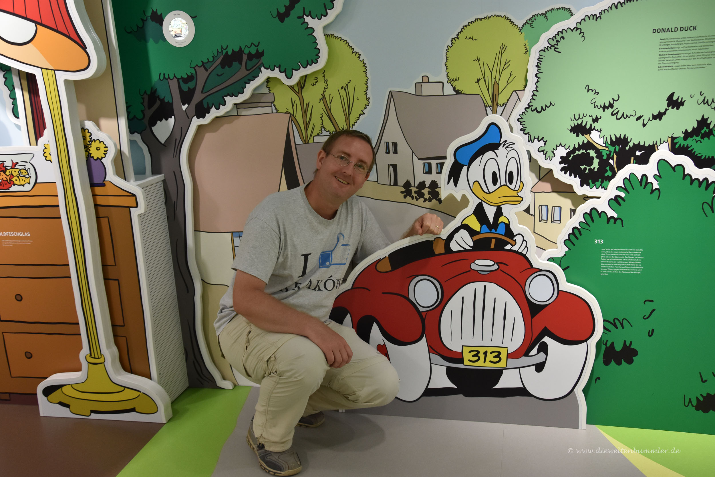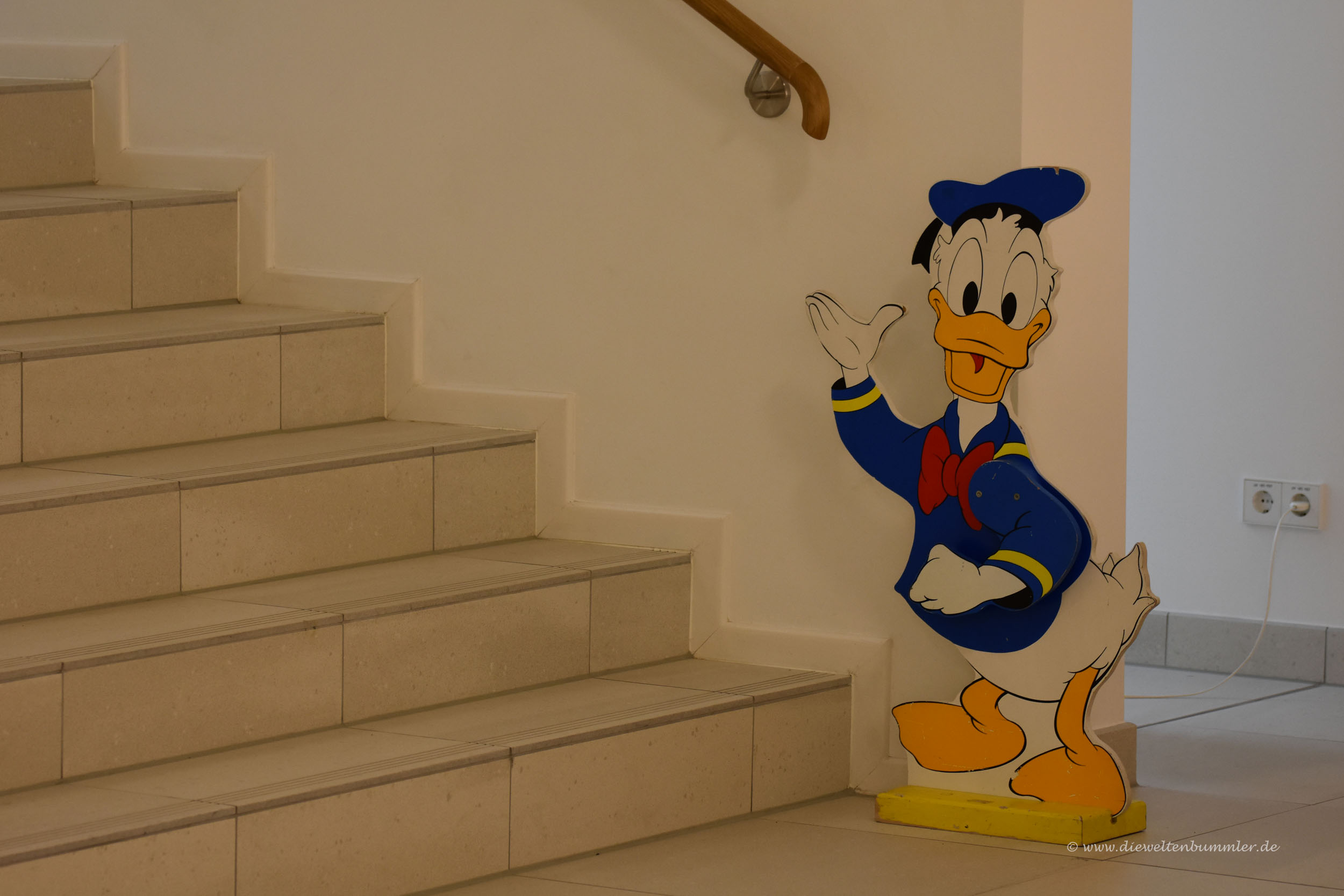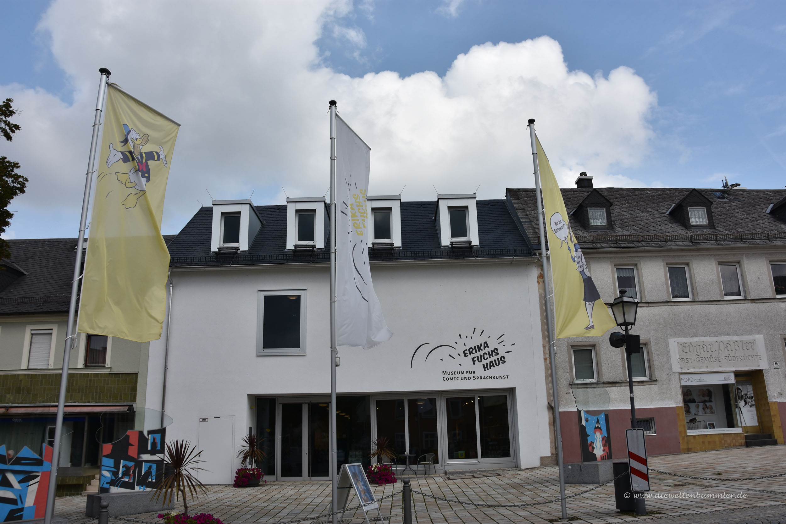 Also machten wir es uns wieder auf der ziemlich leeren Autobahn gemütlich und fuhren in aller Ruhe nach Schwarzenbach an der Saale. Dort stand ein Punkt auf dem Programm, den ich auf keinen Fall auslassen wollte und auch nicht ausgelassen hätte. Ich wollte nämlich endlich mal das Erika Fuchs-Haus sehen. Die Übersetzerin ist bekannt dafür, dass sie zahlreiche Comics von Carl Barks ins Deutsche übersetzte und damit recht berühmt wurde. In der Stadt Schwarzenbach an der Saale lebte sie lange Zeit und daher wurde dort vor einigen Jahren ein Comic-Museum ins Leben gerufen. In meinem Blog berichtet ich bereits ausführlich über unseren Besuch im Erika Fuchs-Haus.