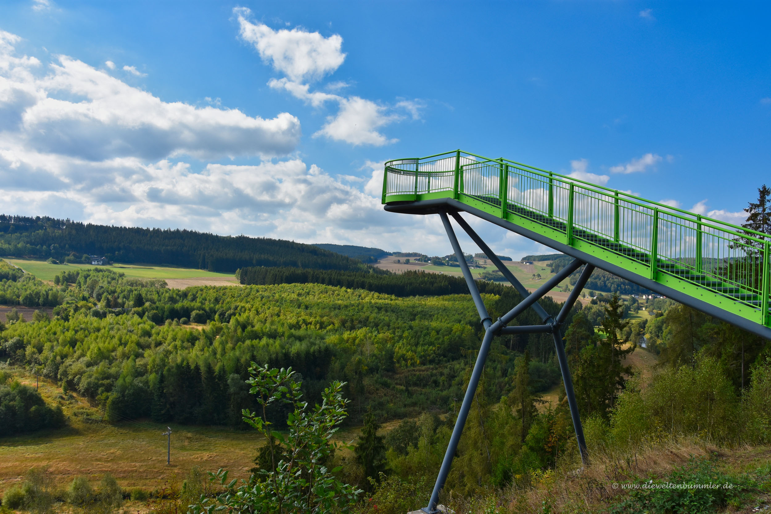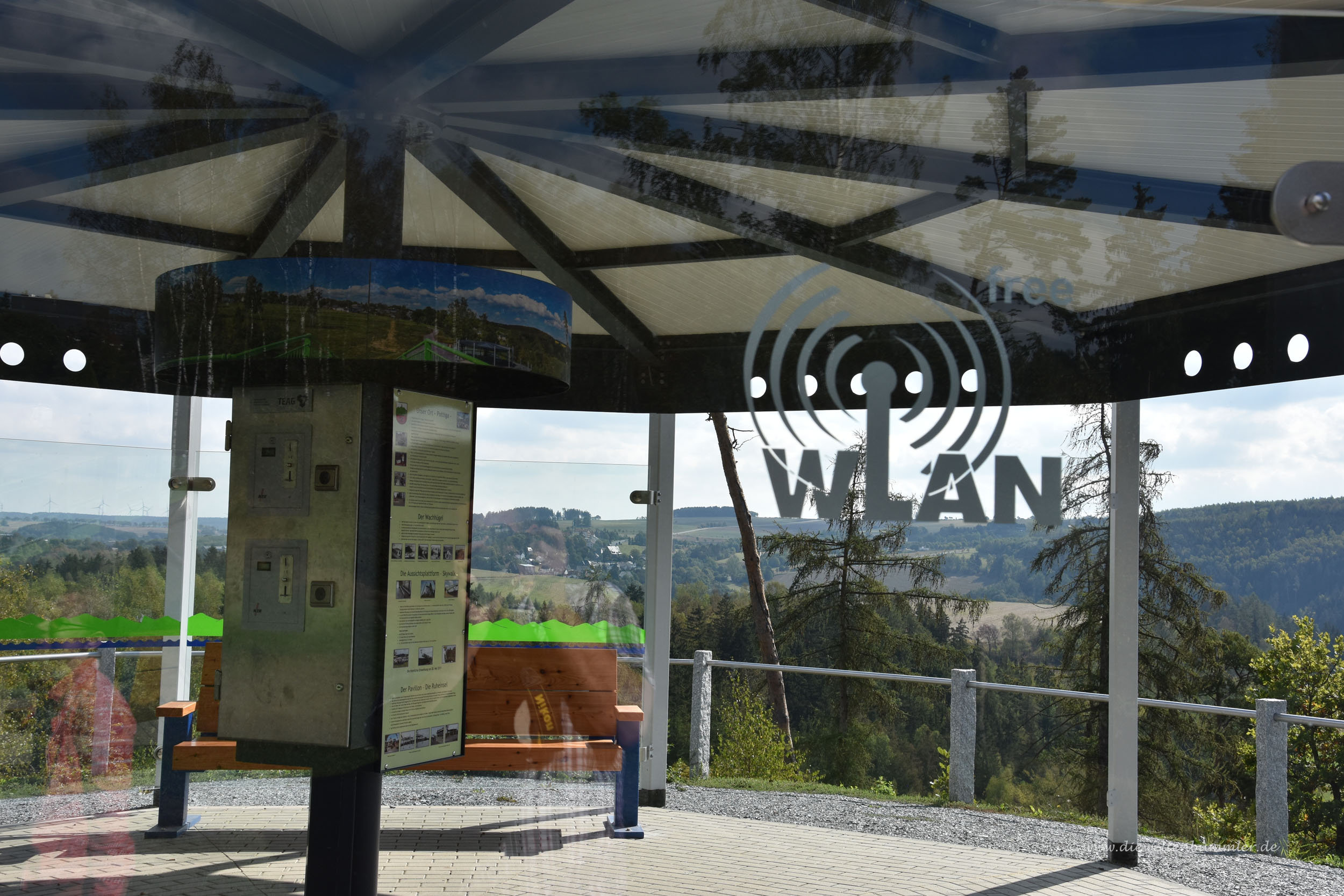 Durch die Informationen am Drehkreuz des Wanderns wurden wir auf die kleine und nahe gelegene Ortschaft Pottiga aufmerksam. Dort würde es eine Art Skywalk über dem Tal der Saale geben. Das interessierte uns und wir fuhren gleich direkt dort hin. Wir gingen auf die Aussichtsplattform, die noch sehr neu und frisch aussah, waren aber verwundert, als wir lasen, dass sie schon einige Jahre alt sei. Respekt für die anscheinend gute Pflege, dass sie noch so neu aussah. Gleich neben dem Skywalk von Pottiga gab es einen Picknickplatz für Wanderer, der uns ebenfalls überraschte.