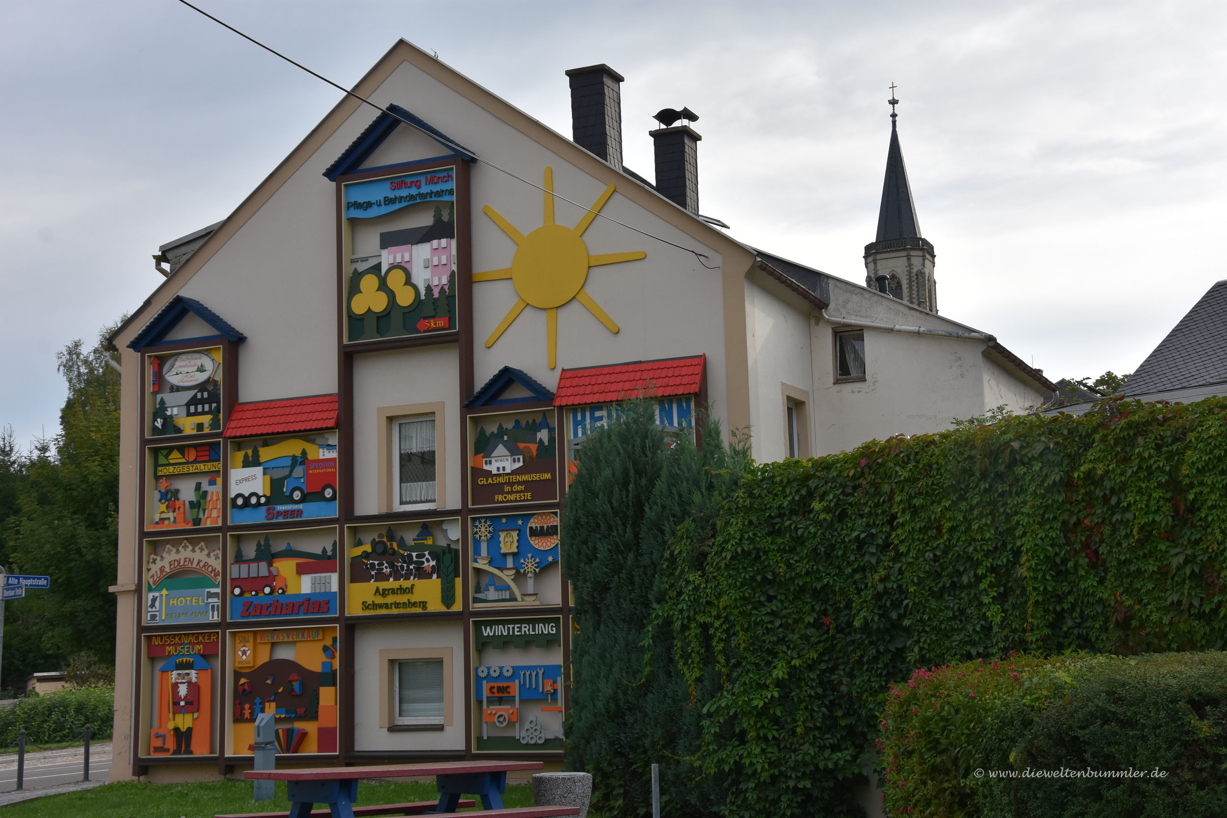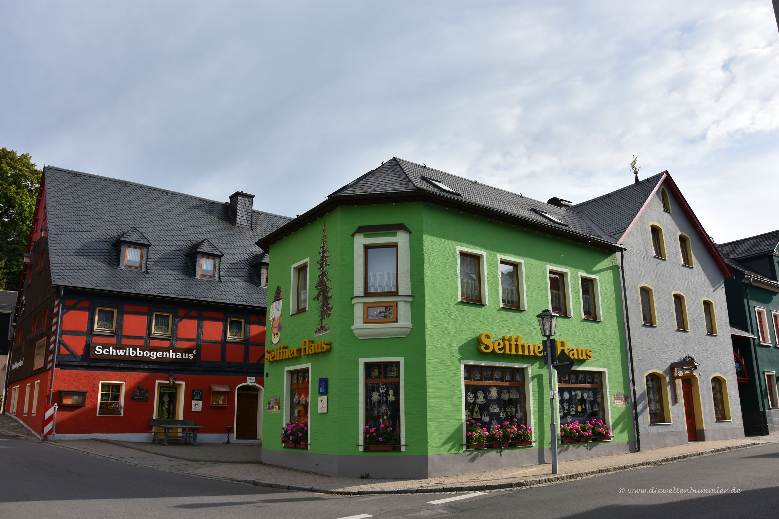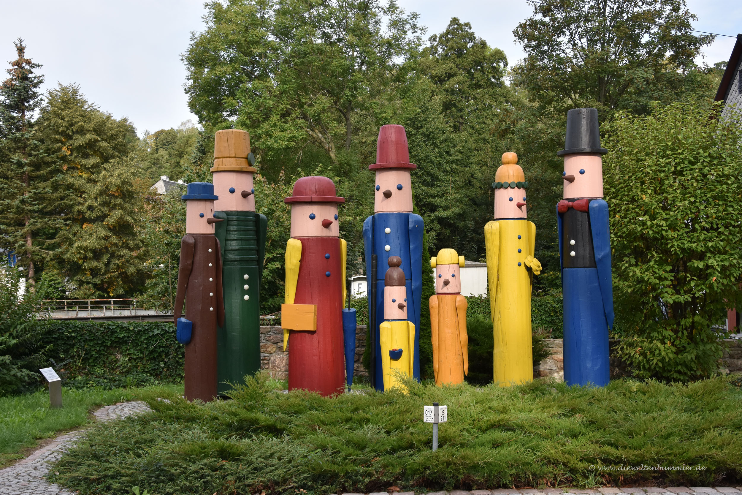 Dadurch dass es am Vorabend wieder sehr spät wurde, waren wir an diesem Morgen ziemlich nah an unserem ersten Zielpunkt des Tages. Ich bezahlte morgens die Übernachtung in der Rezeption auf der anderen Straßenseite, wir entsorgten noch schnell und dann fuhren wir schon in das benachbarte Neuhausen. Dort wollten wir einen Blick auf den größten Nussknacker der Welt werfen. Schon auf dem Weg dorthin wird man im Ort von überdimensionalen Holzspielzeug begrüßt. Machte irgendwie einen netten Eindruck. Eigentlich nahmen wir an, dass der Nussknacker dort vor dem Museum steht und im Grunde tat er das auch. Er ist frei zugänglich. Aber der Ort wirkte ansonsten an diesem Sonntag Morgen recht ausgestorben und wir fragten uns, ob hier überhaupt Besucher hinkämen. Nussknacker sind ja nun nicht das Riesenthema, außer für das Erzgebirge wahrscheinlich. Und die, die hier leben, kennen das Museum vermutlich schon in- und auswendig.