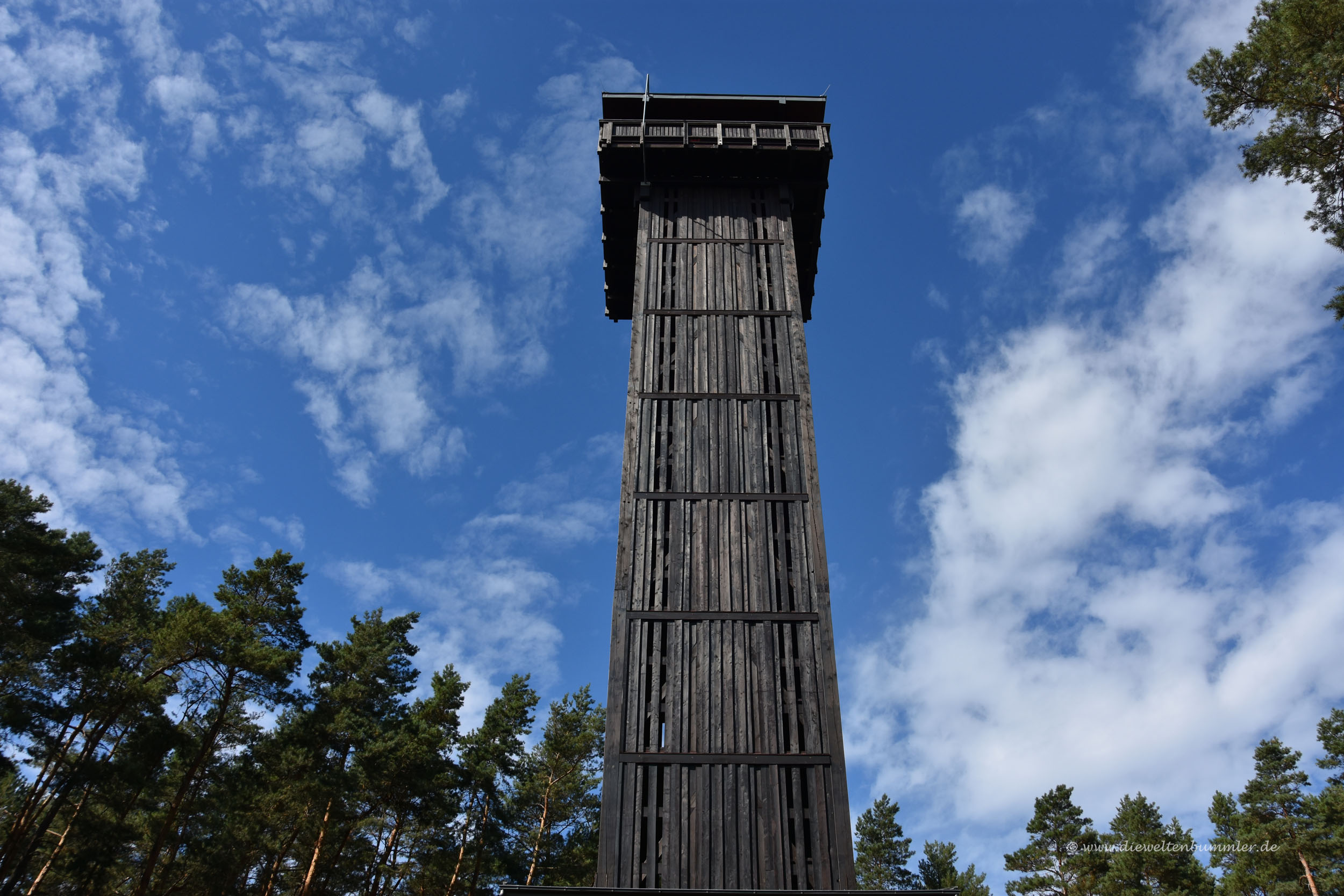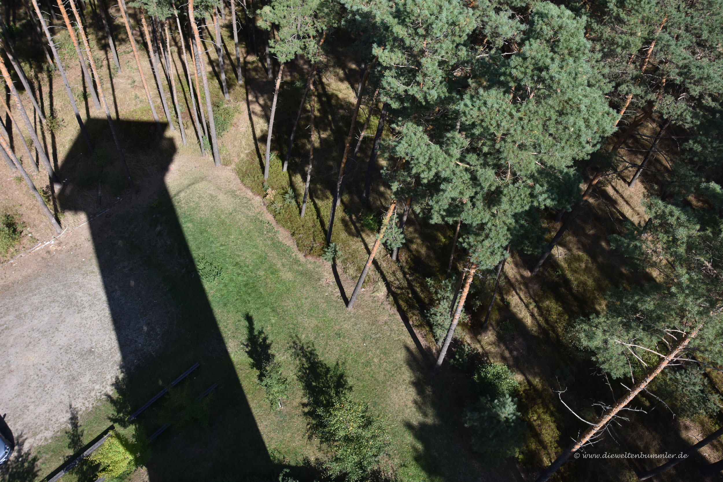 Am Turm angekommen, bestiegen wir ihn auch. Dort als wir oben waren, fühlten wir uns gar nicht mehr so wohl. Als Aussichtsplattform dient eine Art hölzerner Balkon, der oben einmal um den Turm herumführt. Und diese Holzplattform weckte nicht mein Vertrauen. Ich bin einmal schnell rumgelaufen und wollte dann auch zügig wieder hinab. Manchmal habe ich das, das ich von einem Aussichtsturm schnell wieder hinunter möchte. Und beim Thema Holz haben wir ja erst vor zwei Tagen gesehen, dass das auch ziemlich morsch werden kann. Ich erinnere da nur an die Brücke am Drehkreuz des Wanderns.