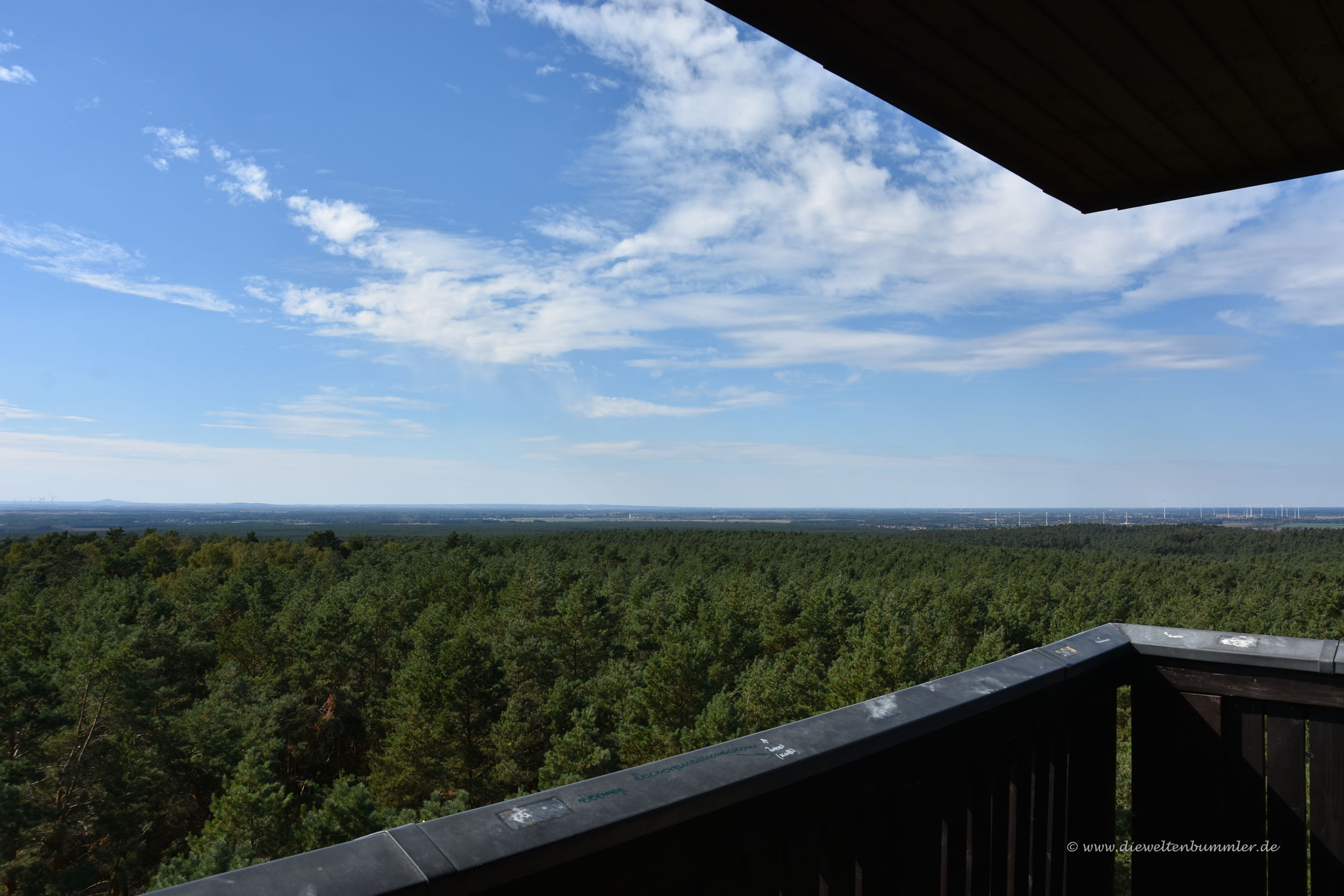 Da wir in den ersten Tagen unserer Reise mit dem Wohnmobil durch Deutschland viel Pech mit dem Wetter hatten und uns zeitlich ins Zeug legten, hatten wir jetzt Luft, auch mal solche Sachen zu besuchen. Zuerst fuhren wir nach Strauch, weil wir annahmen, dass wir von dort ganz gut zum Heidebergturm auf der Heidehöhe wandern könnten. Doch das war ein Irrglaube, besser wäre es wohl von dem kleinen Parkplatz an der Landstraße, den wir auf dem Weg dorthin gesehen hatten. Also fuhren wir wieder zurück, stellten unser Wohnmobil ab und gingen gut zwei Kilometer durch den Wald bis zum Aussichtsturm.