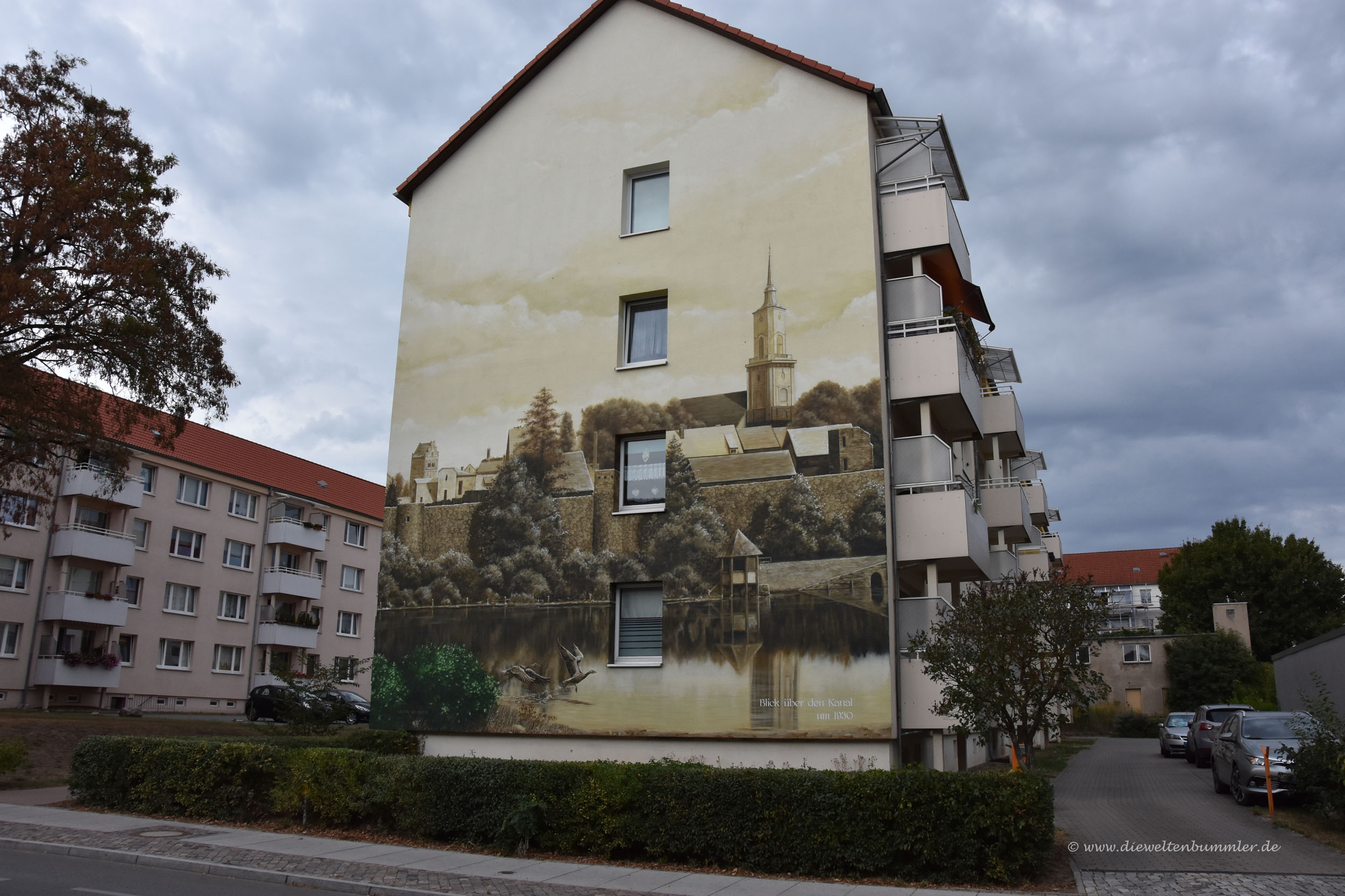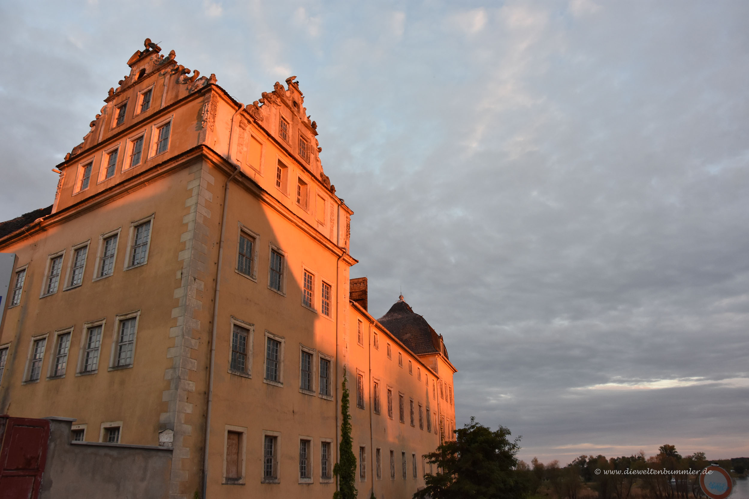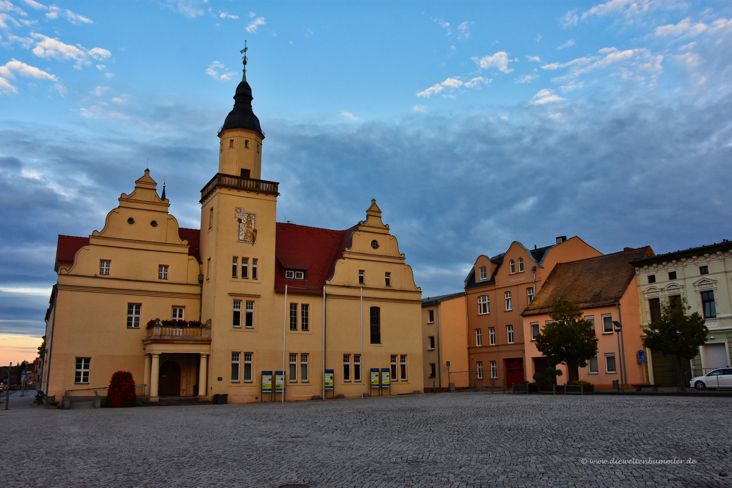 Der Stellplatz war unserer Meinung nach ein wenig zu kitschig eingerichtet und weil wir noch etwas Zeit hatten, gingen wir zu Fuß nach Coswig hinein. Dort sagte uns die Innenstadt nur mäßig zu. Wir spazierten bis zum Rathaus, wo der frisch renovierte Marktplatz glänzte. Aber viele Wohnhäuser sahen ziemlich abrissfertig aus und auch das Schloss machte einen sehr maroden Eindruck. Eine Einwohnerin, die gerade vor ihrem Haus stand, fragten wir nach einem Bäcker, damit wir am nächsten Morgen etwas frühstücken könnten. Sie überlegte kurz und wollte uns gerade eine Bäckerei nennen, doch dann fiel ihr ein, dass der nächste Tag ein Montag ist und am Montag habe die Bäckerei zu. Na sowas, das sind wir als Ruhrgebietler natürlich nicht gewohnt. Nur eine Bäckerei und die hat Montags Ruhetag.