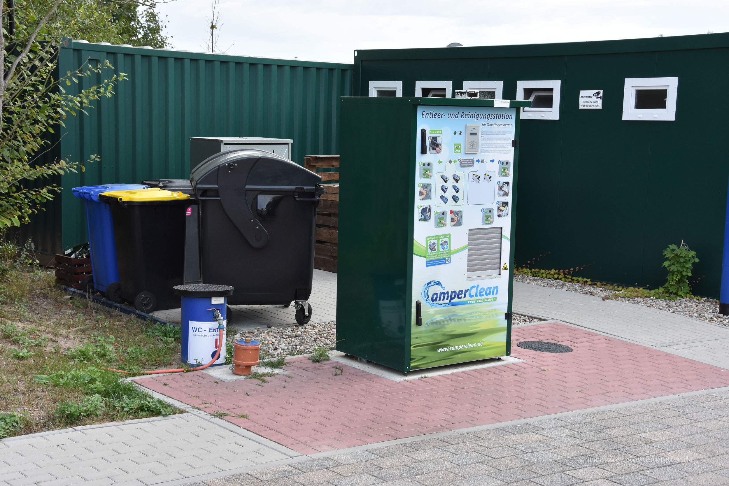 Wir warfen auch einen Blick in den Sanitärcontainer. Der war allerdings alles andere als geräumig. Wir fanden es kurios, dass der Teil für die Herren nur zwei Toiletten, dafür aber fünf Pissoirs besaß. Außerdem war die Toilettenkabine extrem eng und klein. Wer sich das hat einfallen lassen, war wahrscheinlich noch nie auf einer Toilette. Aber es war uns egal. Der Platz war wirklich gut und vor allen Dingen war er deutlich besser und vermutlich ruhiger als der kostenlose Stellplatz im Ortskern. Den hatten wir nämlich auf der Fahrt gesehen und sogar kurz angesteuert, weil wir einem Schild dorthin vertrauten. Doch als wir den kostenlosen Stellplatz mitten in Templin sahen, fuhren wir gleich weiter. Dort mitten im Wohnviertel würde ich nicht schlafen wollen. So viel Altstadtnähe brauchten wir nicht.
