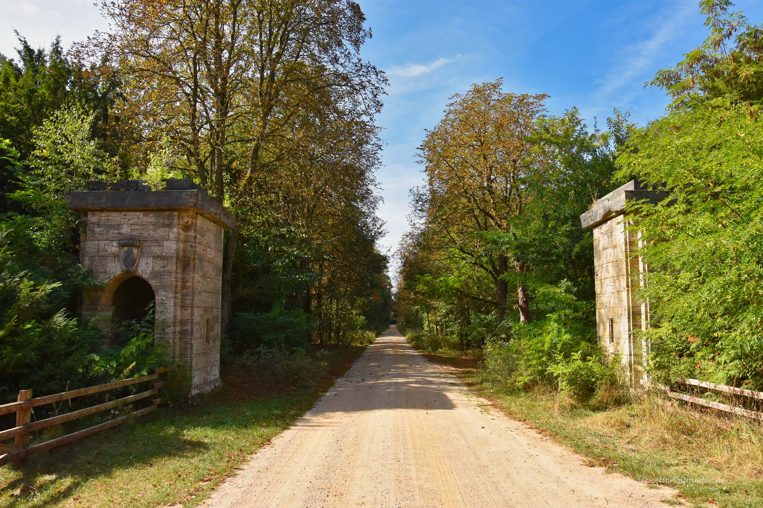 Dort, wo einst das Bauwerk stand, befindet sich heute nur noch ein Informationsschild. Ein paar Meter folgten wir auch mal zu Fuß den Trampelpfaden tiefer in den Wald hinein und wir konnten uns gut vorstellen, dass man hier noch auf irgendwelche Spuren stoßen würde. Aber das war nicht unser Ansinnen. Wir fuhren weiter und erreichten die östliche Zufahrt von Carinhall. Dort standen noch die zwei Pfeiler rechts und links des Wegs, was den Eingang zu Carinhall markierte. Ein wenig seltsam fanden wir die beiden kleinen Häuser, offensichtlich Ferienhäuser hier einsam im weiten Waldareal. Wer will denn gleich neben dem einstigen Landsitz von Göring übernachten?
