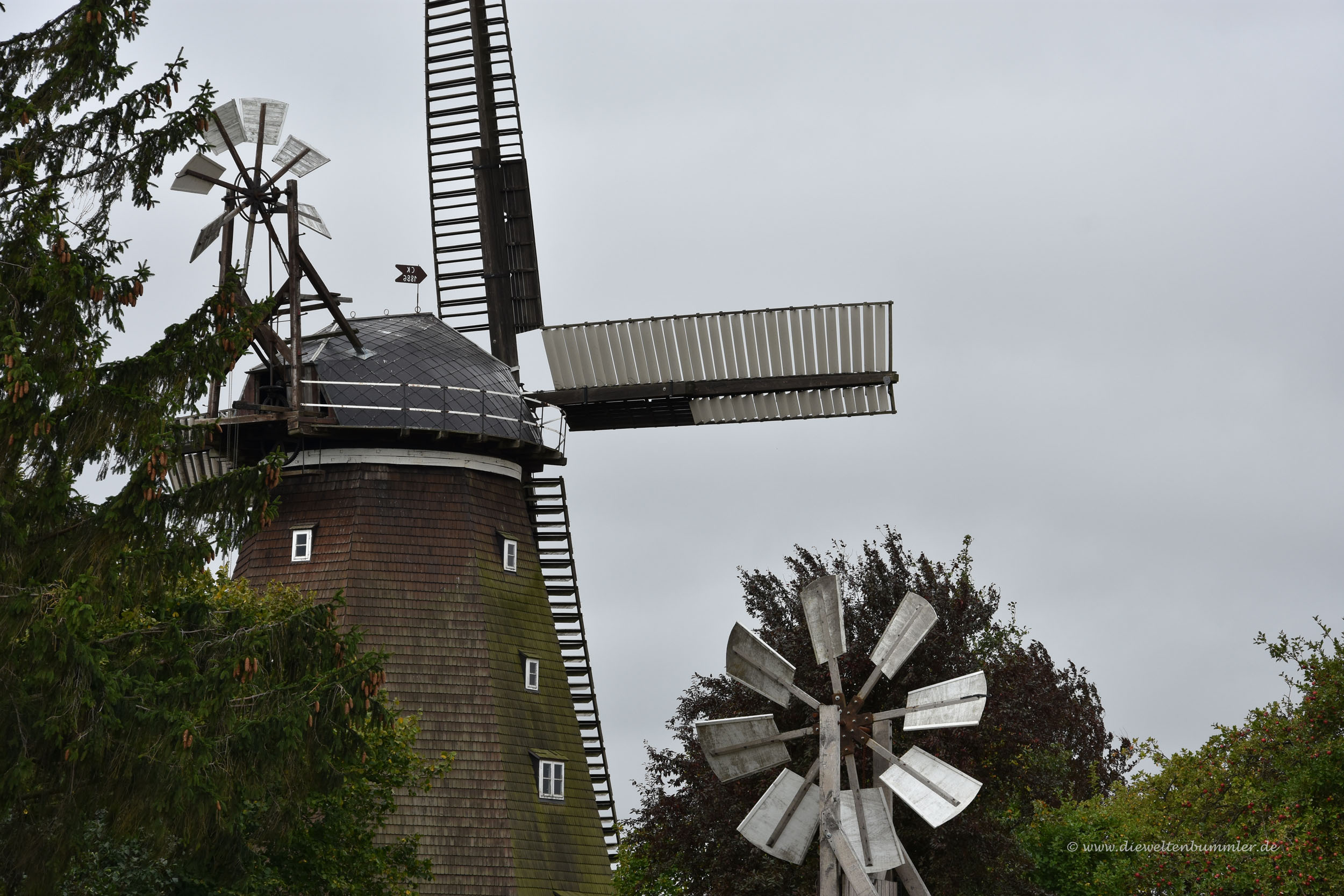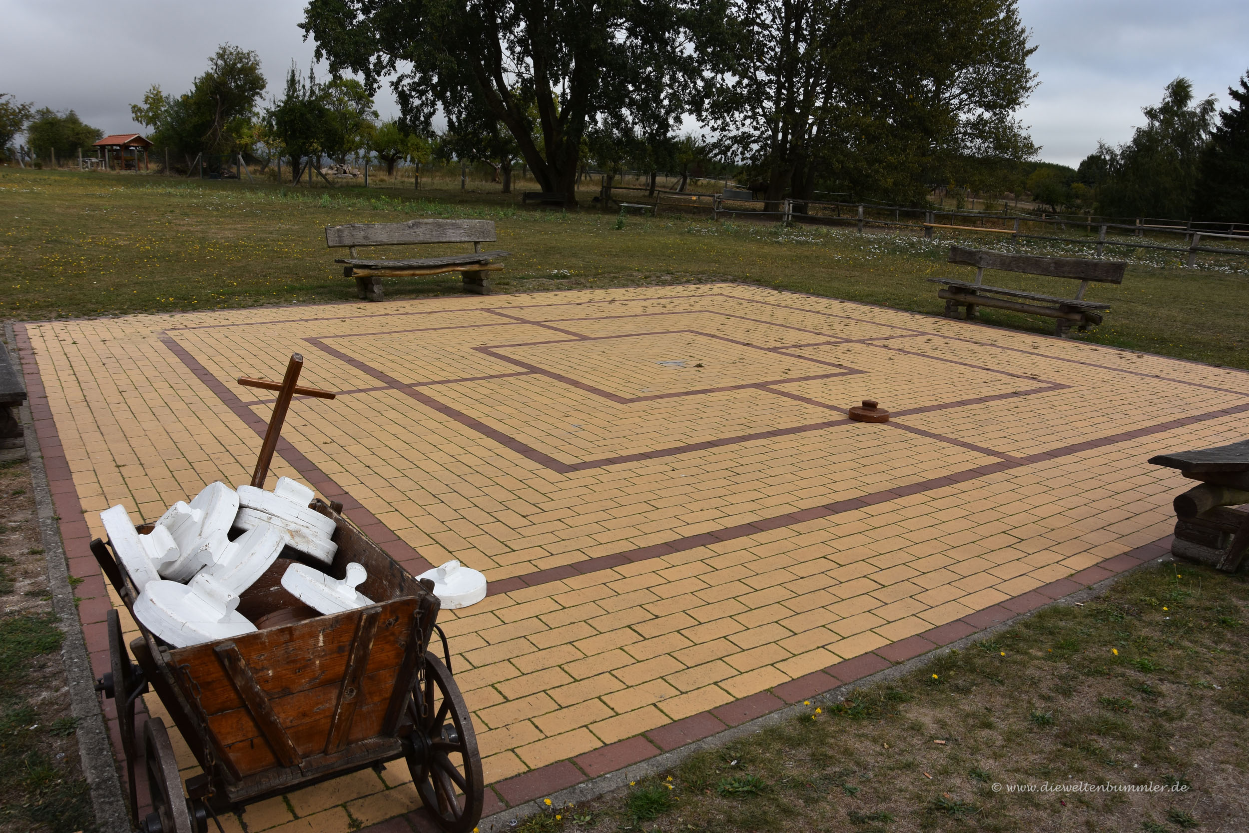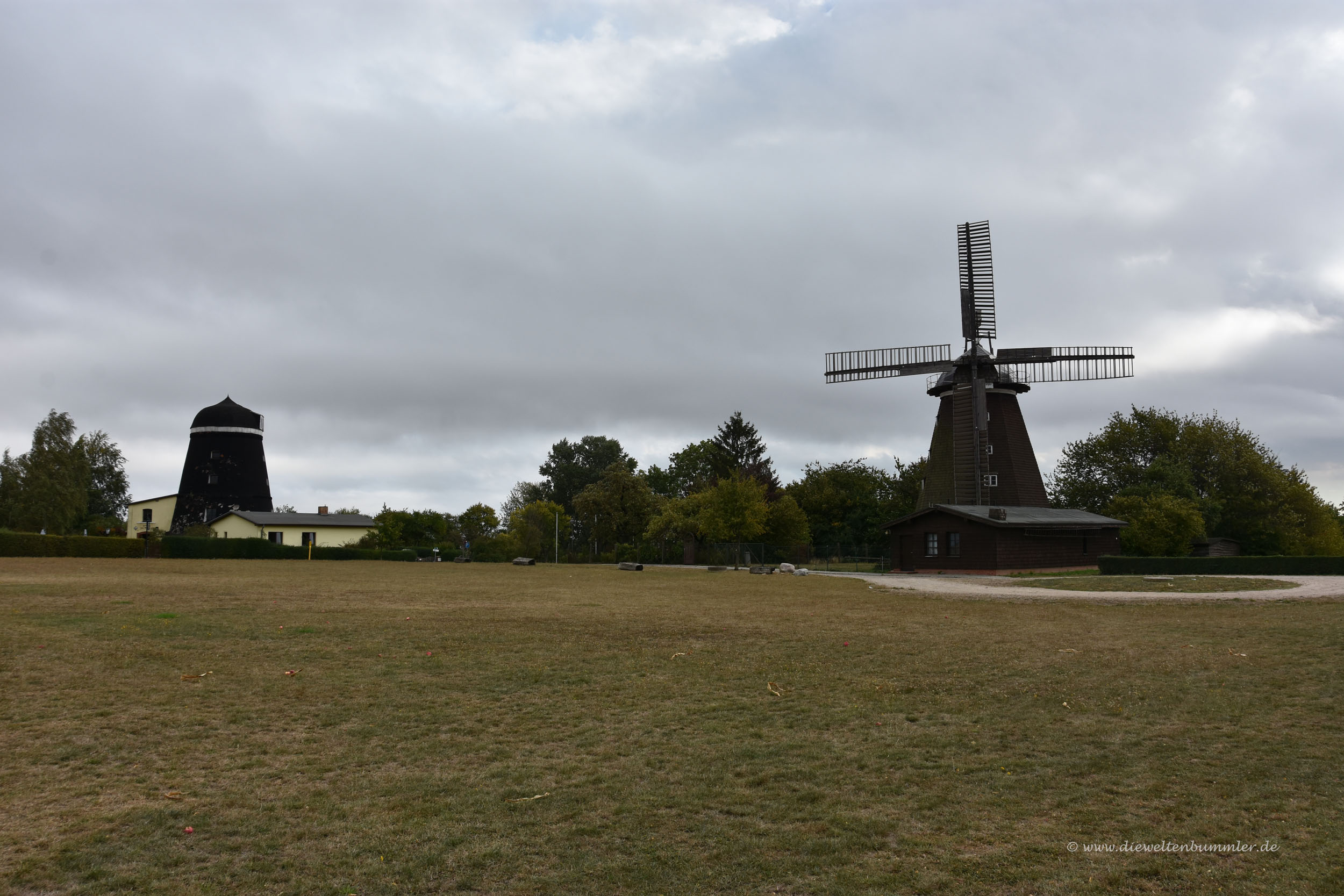 Auf dem Weg zu den Helpter Bergen sahen wir auf der Autobahn das braune touristische Hinweisschild für die „Windmühlenstadt Woldegk“. Das machte uns ein wenig neugierig, hatten wir doch noch nie etwas davon gehört. Und da Woldegk der nächstgelegene Ort ist, fuhren wir einfach mal hin und schauten uns dort um. Am nördlichen Ortsrand gibt es tatsächlich ein Mühlenmuseum mit mehren Windmühlen. Hat uns sehr gut gefallen, aber besonders drollig fanden wir das große Mühlespiel, dass zwischen den richtigen Windmühlen auch noch in den Boden eingelassen wurde. Das passte irgendwie gut hinein, dürfte wohl am Namen liegen.