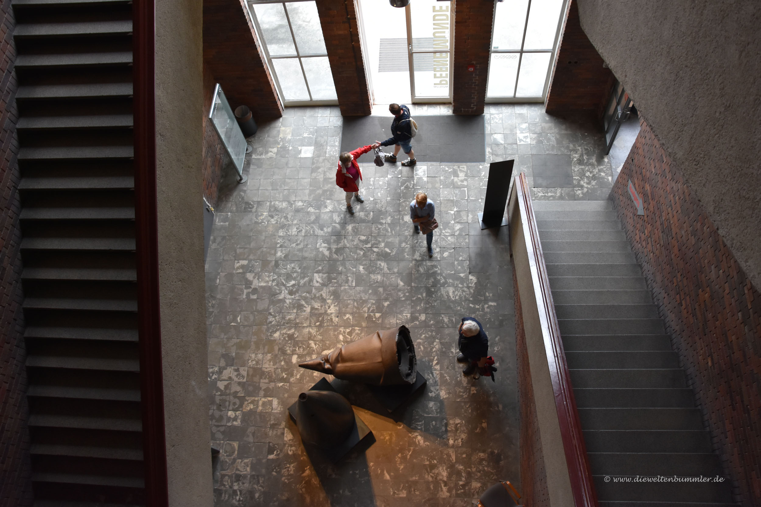 Ganz anders allerdings der Parkplatz am Museum in Peenemünde. Dort, wo die V2 entwickelt wurde, wollten wir uns die dazugehörige Ausstellung anschauen. Aber, um es mal vorwegzunehmen, wir waren nachher irgendwie enttäuscht. Enttäuscht von der Darstellung innerhalb des Museums. Zunächst mal befindet man sich auf einer Freifläche, die uns sehr an die Zechenanlagen im Ruhrgebiet erinnerten. Später, im Inneren der Gedenkstätte, war die Luft extrem stickig und die Ausstellung wirkte wie wild zusammengewürfelt. Auch der Rundgang erschien uns nicht schlüssig. Auf einem Weg, der eigentlich klar markiert war, kamen uns plötzlich Besucher entgegen und uns ist nachher genau das gleiche passiert. Alles wirkte konfus und darüber hinaus teilweise auch ein wenig in die Jahre gekommen.
