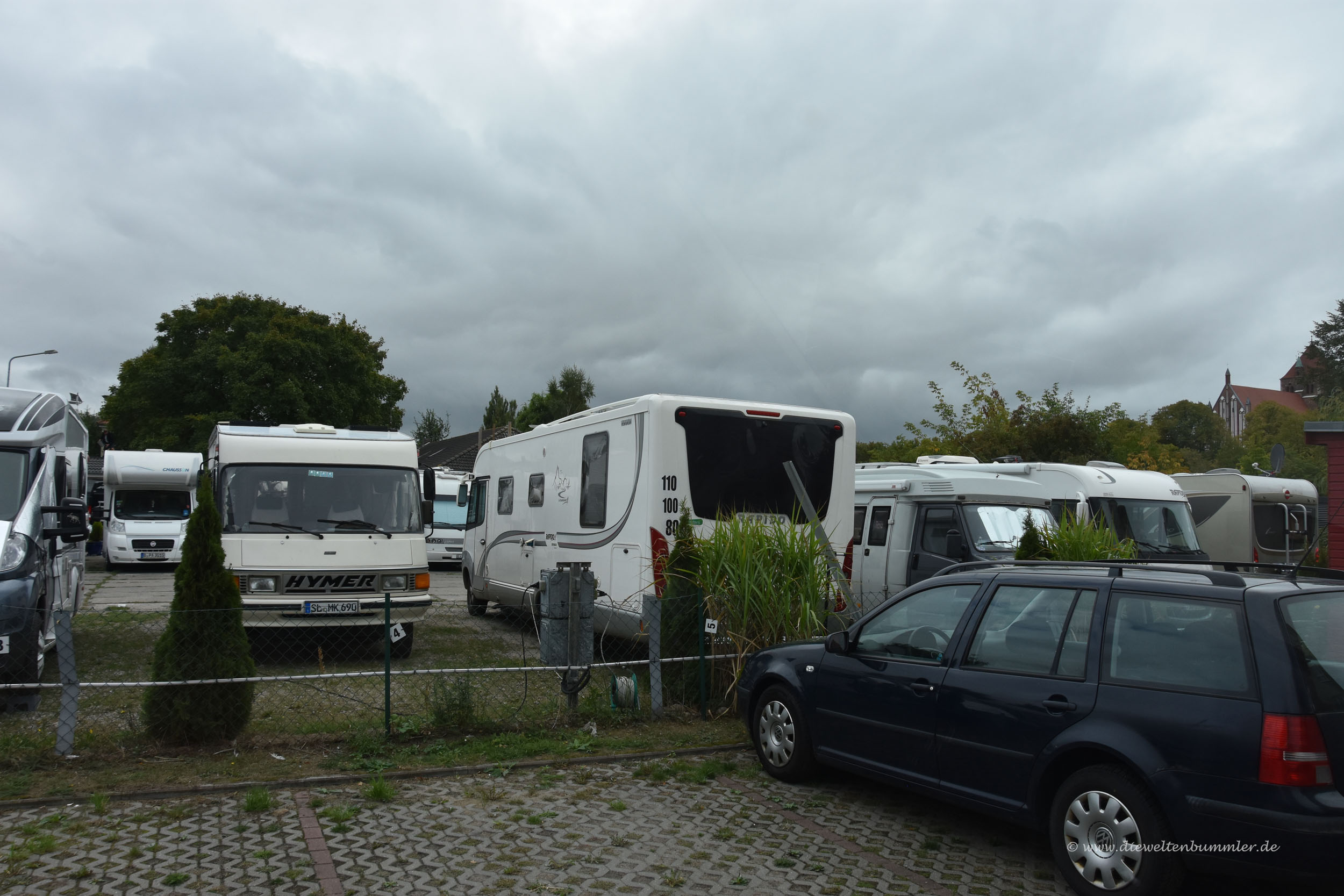 Wir fuhren wieder zum Festland zurück und freuten uns, dass sich der Stau aufgelöst hatte. So konnten wir relativ schnell Greifswald erreichen. Hier wollten wir eigentlich den Tag enden lassen und vom zentral gelegenen Wohnmobilstellplatz aus gemütlich durch die Altstadt schlendern. Aber als wir den Stellplatz sahen, machten wir sofort kehrt. Direkt an der nächsten Einfahrt wendeten wir und verließen die Straße mit dem Stellplatz beinahe fluchtartig. Ein anderer Wohnmobilist, der gerade vom Stadtbummel zurückkam und uns wenden sah, dachte scheinbar, wir hätten die falsche Einfahrt genommen und hat uns noch nett gewunken, damit wir die richtige Einfahrt finden.