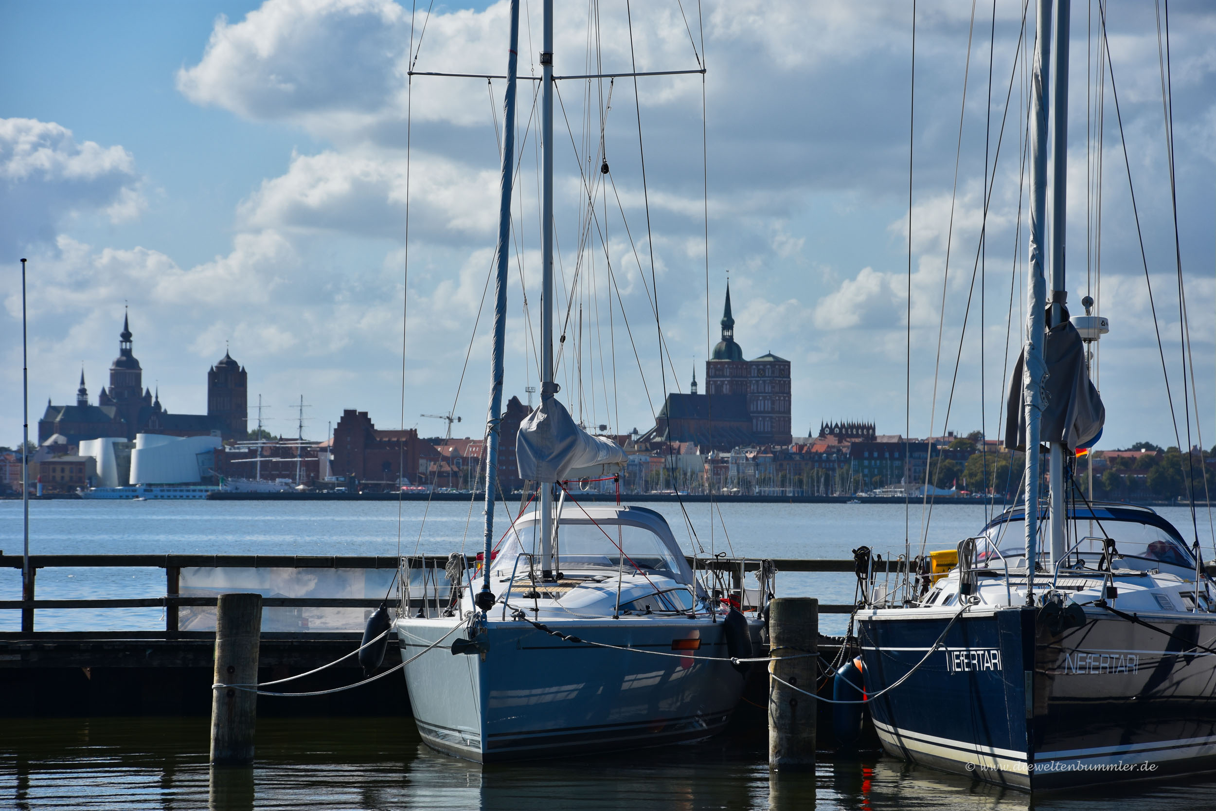 Wir überquerten die gesamte Insel Rügen bis zu ihrem Ende und planten, irgendwann wiederzukommen. Denn grundsätzlich gefiel uns das, was wir von Rügen sahen. In Altefähr hielten wir noch kurz am Hafen an und machten ein paar Panoramaaufnahmen von Stralsund. Denn nach größeren Stadtbesichtigungen war uns jetzt nicht wirklich so recht. Außerdem hatten wir noch eine Verabredung mit einem Freund westlich von Stralsund, der bei sich zu Hause mit Kuchen auf uns wartete. Da wir uns wegen der Entfernung relativ selten sehen, war uns das ohnehin wichtiger. Und außerdem war der Kuchen sehr lecker, aber das erfuhren wir ja erst als wir da waren. Danke nochmals an dieser Stelle. Wir blieben ein paar Stunden und hatten eine gemütliche Runde am Nachmittag. Die hätte ich auch gerne weiterführen können, denn als wir bei unserem Freund auf der Couch saßen, merkte ich, dass das einfach mal gut tat.