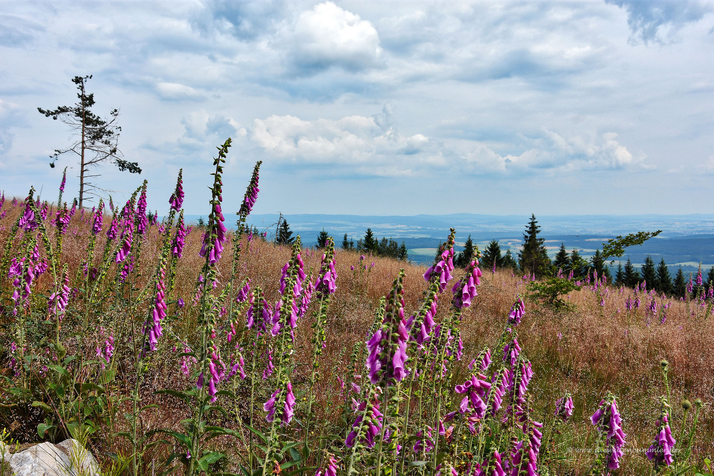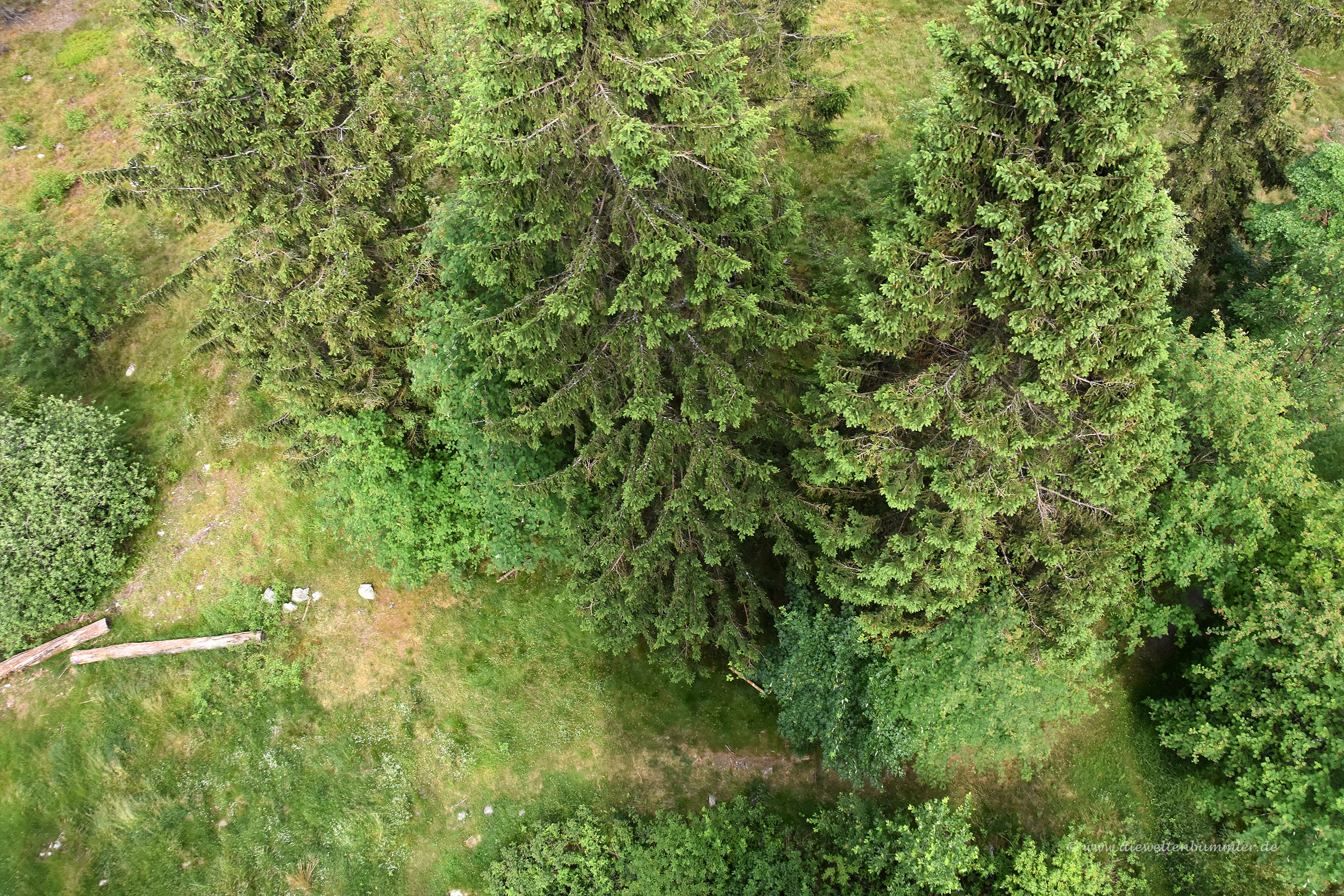 Auf dem Weg durch den Wald zum Turm müssen wir irgendetwas an uns gehabt haben. Hunderte von Fliegen umschwärmten uns und machten uns die Wanderung nicht gerade zum Genuss. Außerdem liefen wir an einer Stelle falsch und mussten uns schließlich wieder einmal durch hohes Gras kämpfen. Das machte die Sache nicht leichter, denn damit scheuchten wir erst recht zahlreiche Fliegen auf. Dennoch erreichten wir den Gipfel des Wüstegarten und standen schließlich vor dem hölzernen Kellerwaldturm.