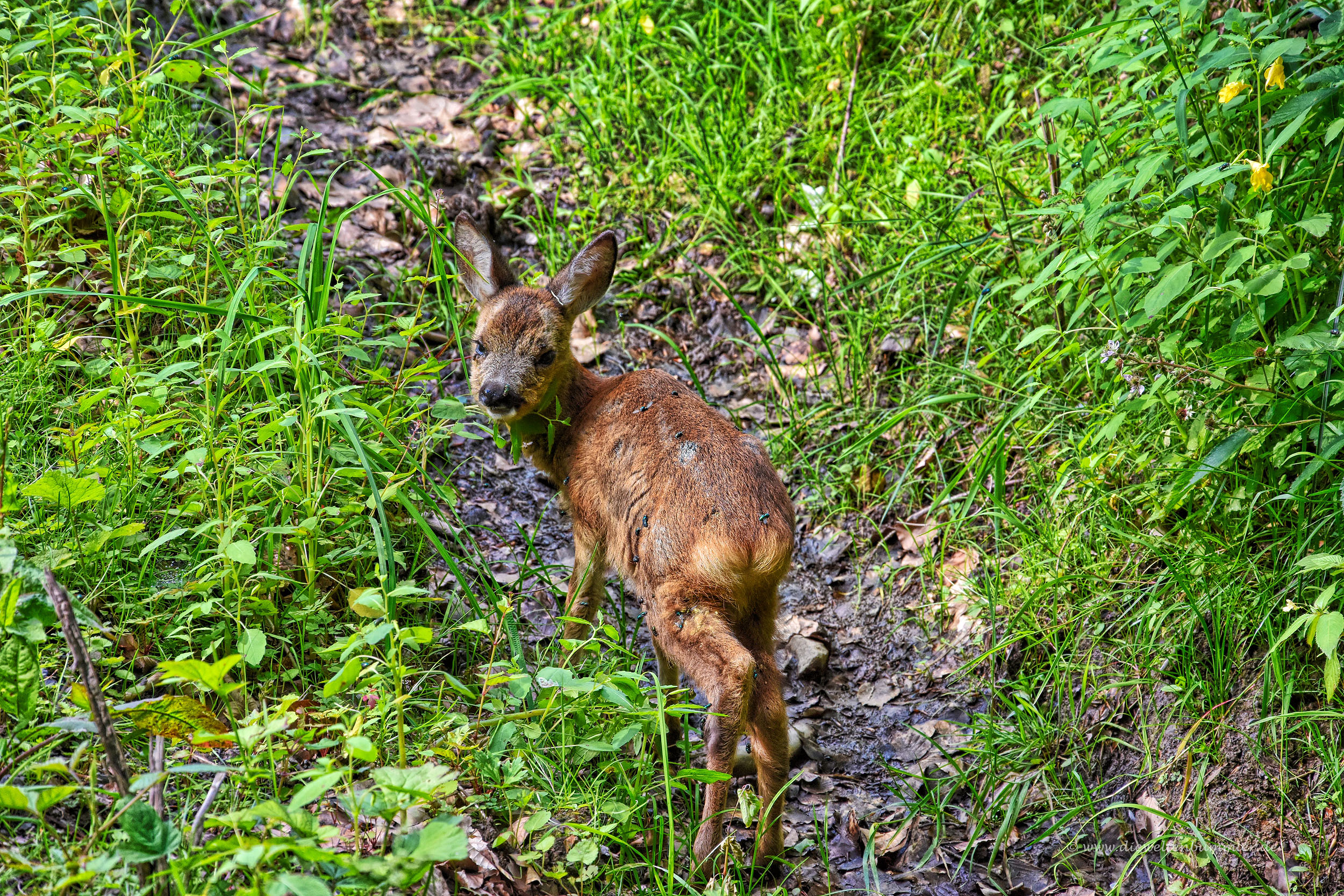 Im ersten Augenblick konnte ich gar nicht realisieren, was da sitzt und glotzt. Aliens? Ein Wolf? Nein, es war ein Rehkitz. Ein Rehkitz mit zahlreichen Fliegen am Körper und einem Fell, das stellenweise sehr nass wirkte. Es stand dort und schaute uns an. Dabei war es nur zwei, höchstens drei Meter von uns entfernt. Es gelang mir, einige Male auf den Auslöser zu drücken, um den Moment festzuhalten. Doch im gleichen Augenblick fragte ich mich, ob mit dem Tier wohl alles okay sei. Mir schossen Gedanken durch den Kopf, was wir tun müssten, wenn es sich um ein verletztes Tier handelt. Doch die kurze Sorge um das Rehkitz nahm uns das Tier selber ab. Denn nach ungefähr 10-15 Sekunden drehte es sich weg und rannte davon. Dabei sah es ganz und gar nicht kränklich aus. Es war ein toller Anblick.