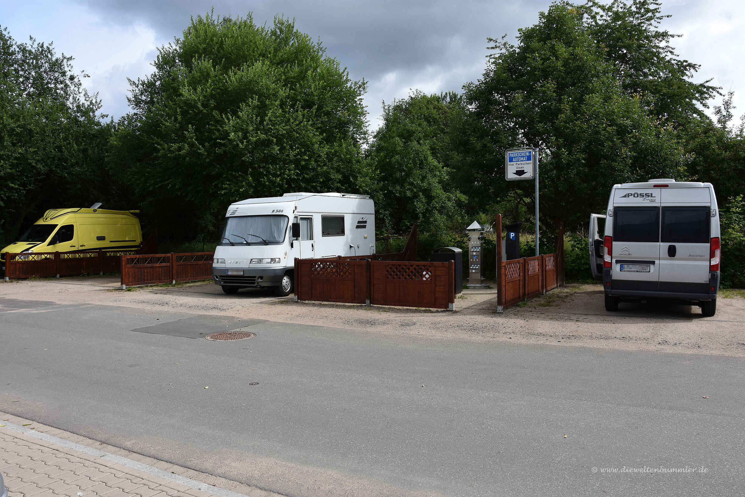 Wir steuerten den Wohnmobilstellplatz an, verzichteten aber darauf, dort zu parken. Denn ein Parken tagsüber war dort nicht vorgesehen. Man kann nur 12 Euro in den Parkscheinautomaten schmeißen und dann über Nacht bleiben. Also fuhren wir zum großen öffentlichen Parkplatz am Schwimmbad weiter und stellten das Auto dort kostenlos ab.