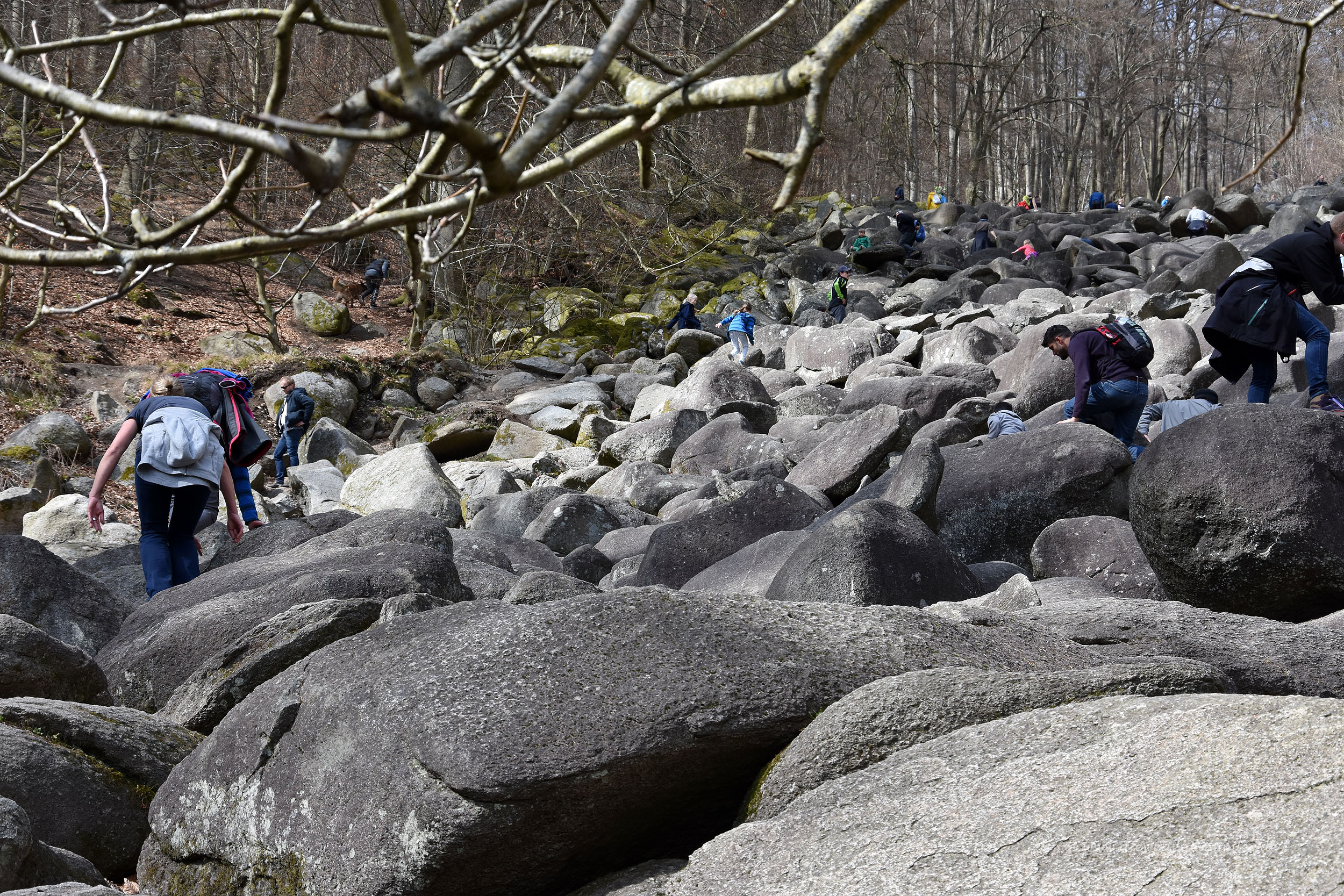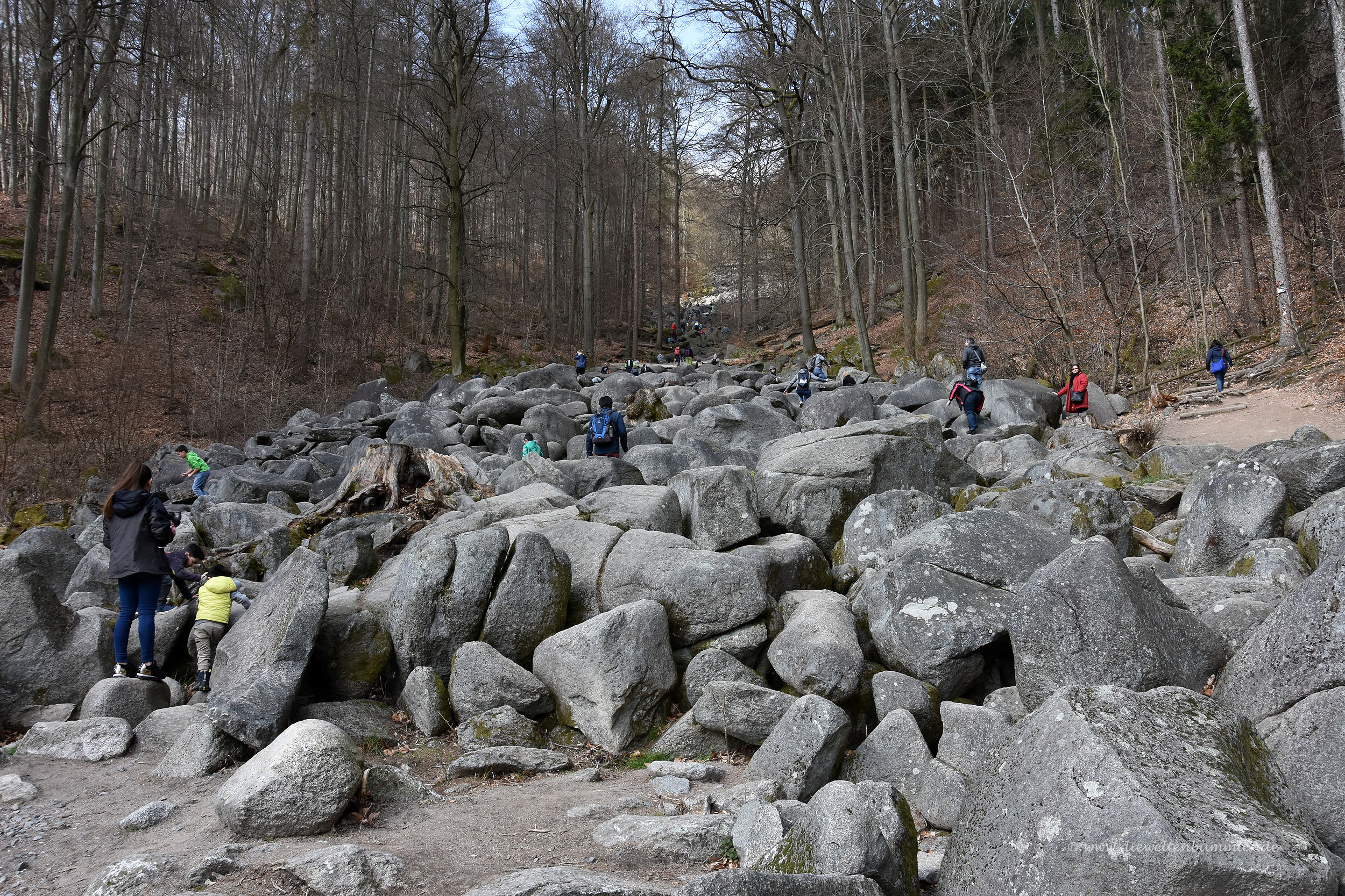 In dem Hauptbereich, wo sich die meisten Felsen befinden, hat Moos keine Chance, sich auf dem Gestein anzusammeln. Dafür sind es definitiv zu viele Besucher, die sich über die Felsen nach oben hangeln. Eigentlich ist das ein wenig schade, denn es ist ja kein Spielplatz oder Klettergarten, sondern sollte vielmehr als Naturdenkmal gesehen werden. Na ja, wir folgten dem Weg ein wenig bergauf, blickten zurück in die Tiefe und gingen dann wieder zum Wohnmobil zurück.