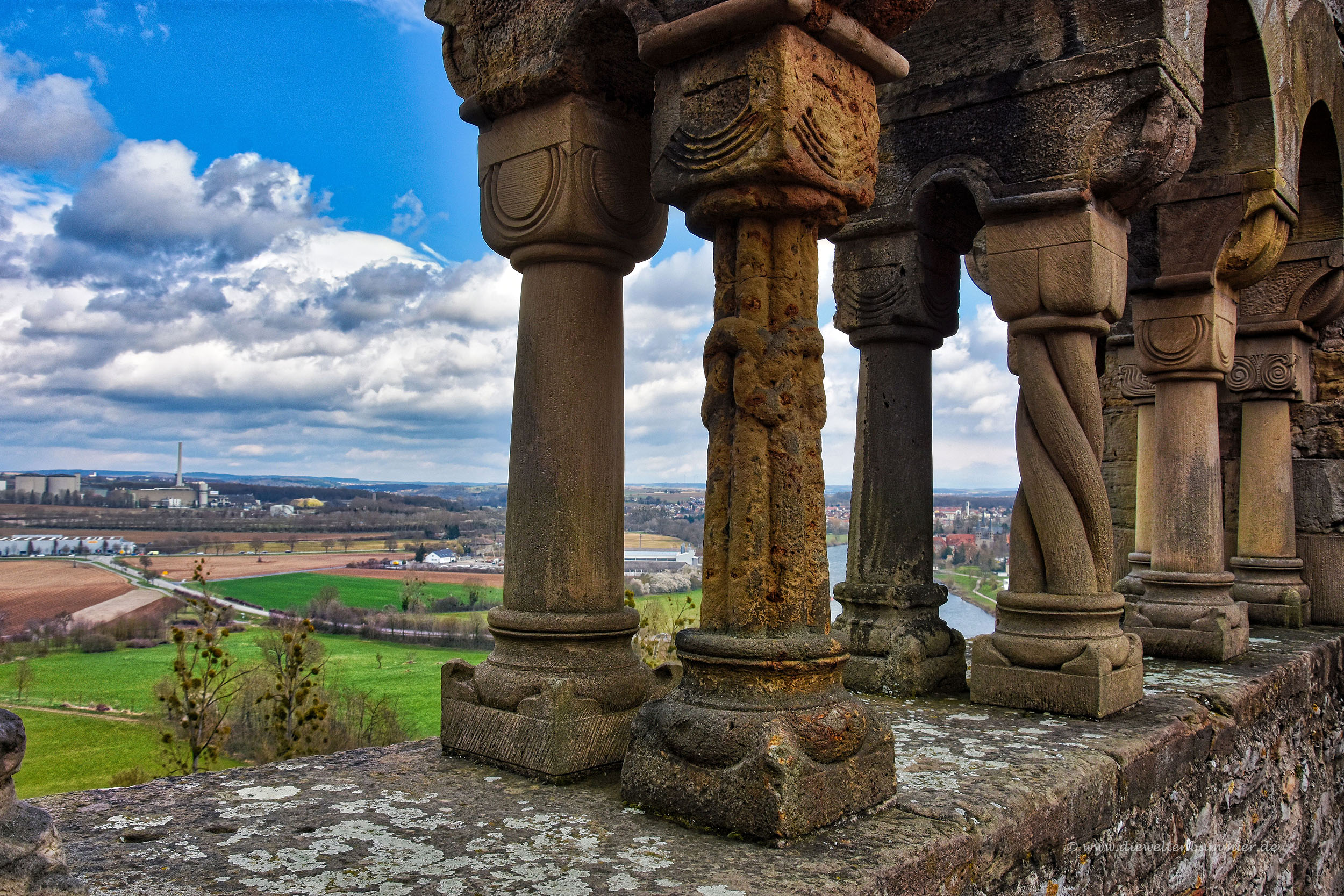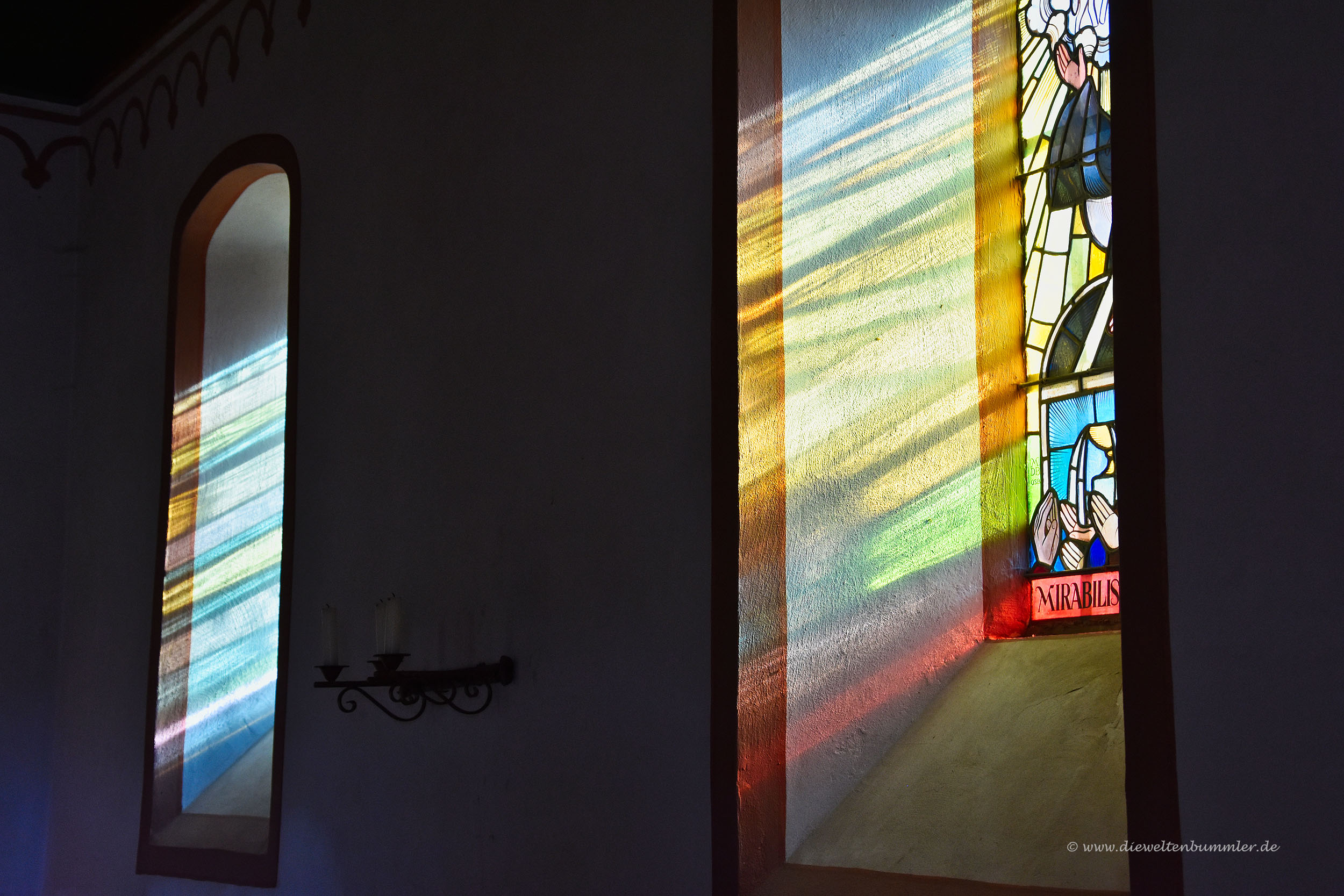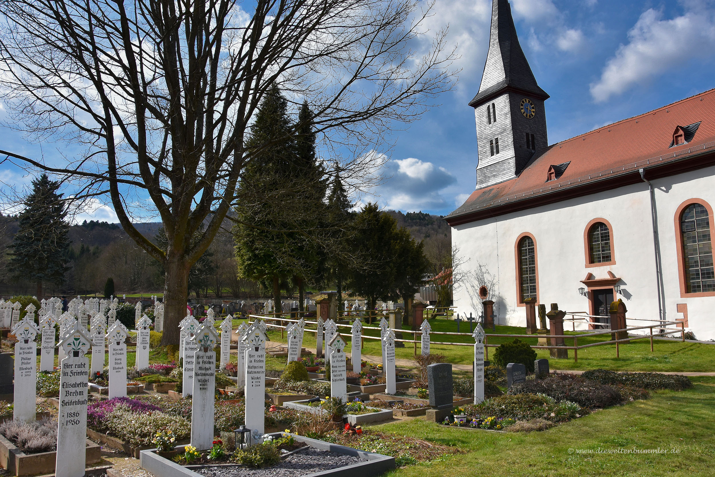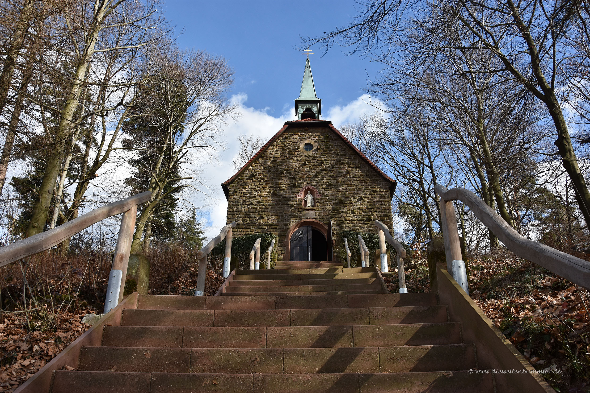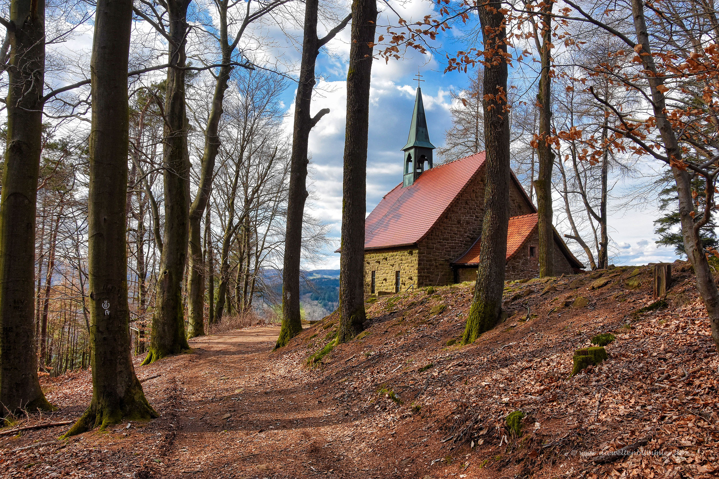 Es sollte nicht unser letzter Anstieg an diesem Tag sein. Bei einem kleinen Dorf namen Weschnitz, stellten wir das Wohnmobil ab und wanderten auf einem steilen Serpentinenpfad hinauf zur dortigen Walpurgiskapelle. Der Pfad, Teil des Nibelungensteigs, war jedoch wenig gepflegt. Man könnte zwar mit gutem Willen auch sagen, dass er noch durch den Winter ein wenig verwahrlost aussah, aber wirklich glauben würden wir das wohl nicht. Die Kapelle war hingegen überraschenderweise offen und sah schön aus. Nur einen tollen Ausblick sollte man hier nicht erwarten, auch wenn man gerade einen anstrengenden Aufstieg hinter sich brachte.