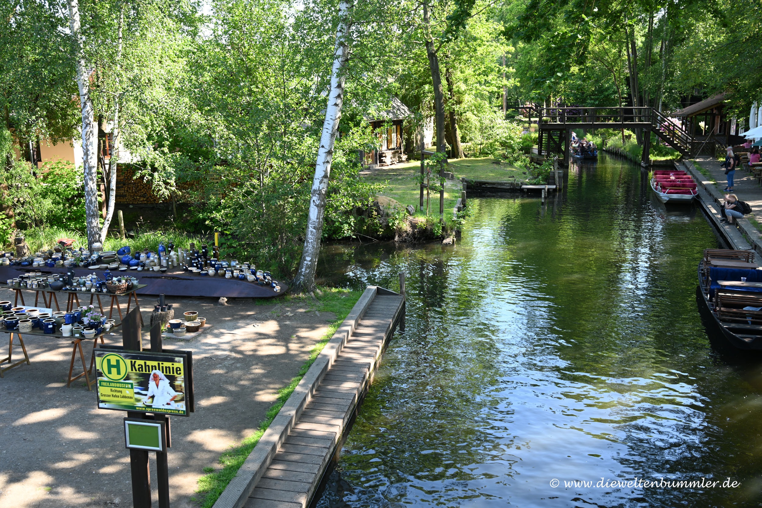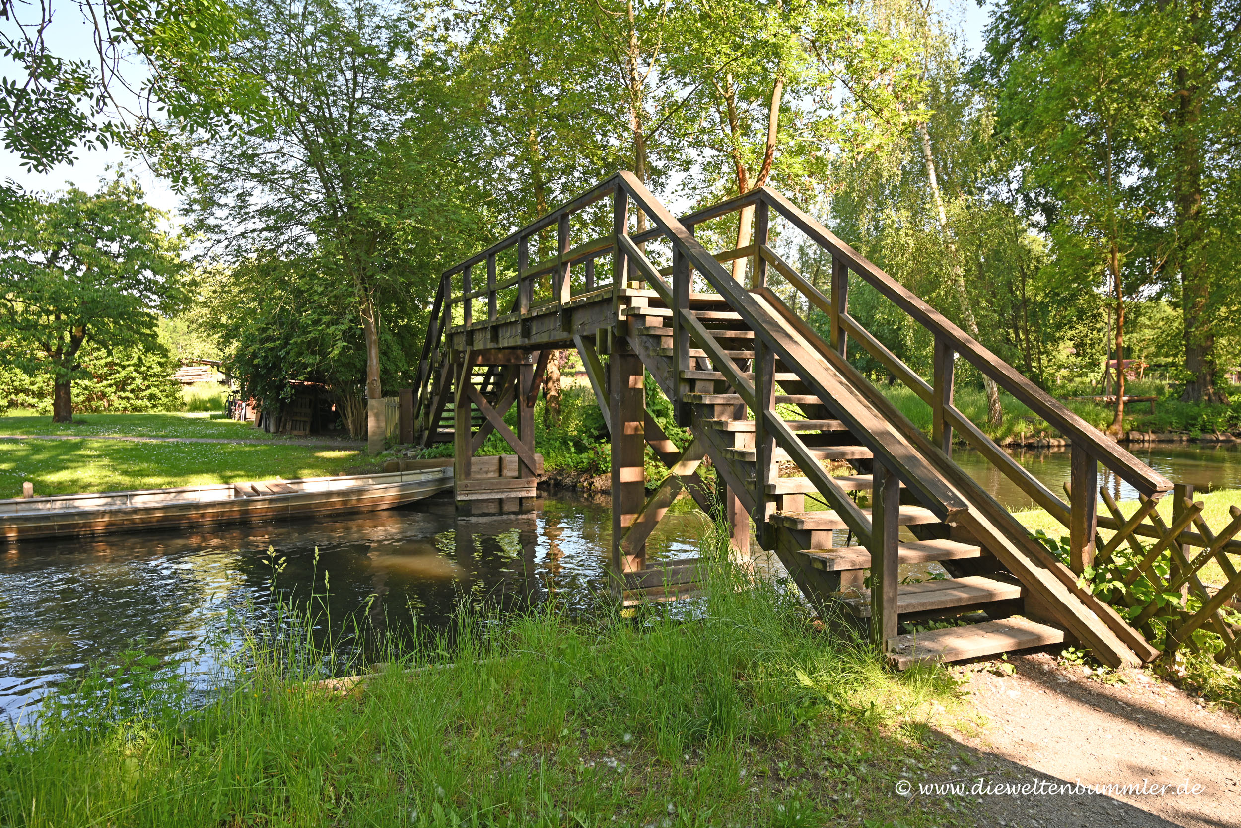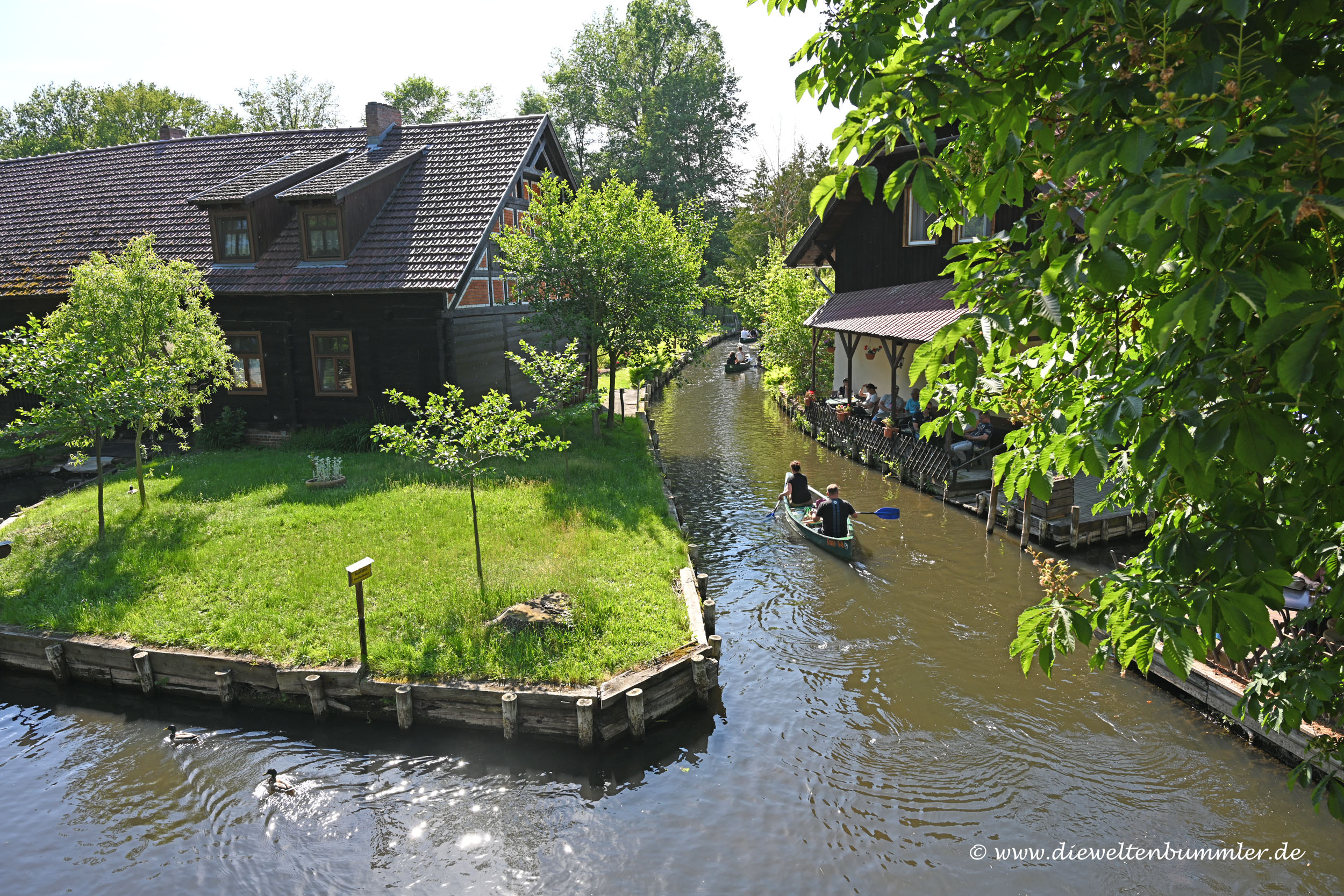 So ging ich dann zu Fuß durch den kleinen Ort mit seinen vielen Wassergräben. Hin und wieder konnte man diese über Brücken überqueren, während Kanus und Ausflugsboote unten durch fuhren. Es wirkte ein klein wenig wie Venedig, nur eben in einem Wald. Aber voll wie rund um den Canal Grande war es hier auch. Und noch voller wirkte es alleine durch das Humptata des Herrentags. Das ist so gar nicht meine Welt und erinnerte mich an eine meiner Harz-Wanderungen, wo der Wald im Harz auch von mobilen Lautsprechern beschallt wurde.