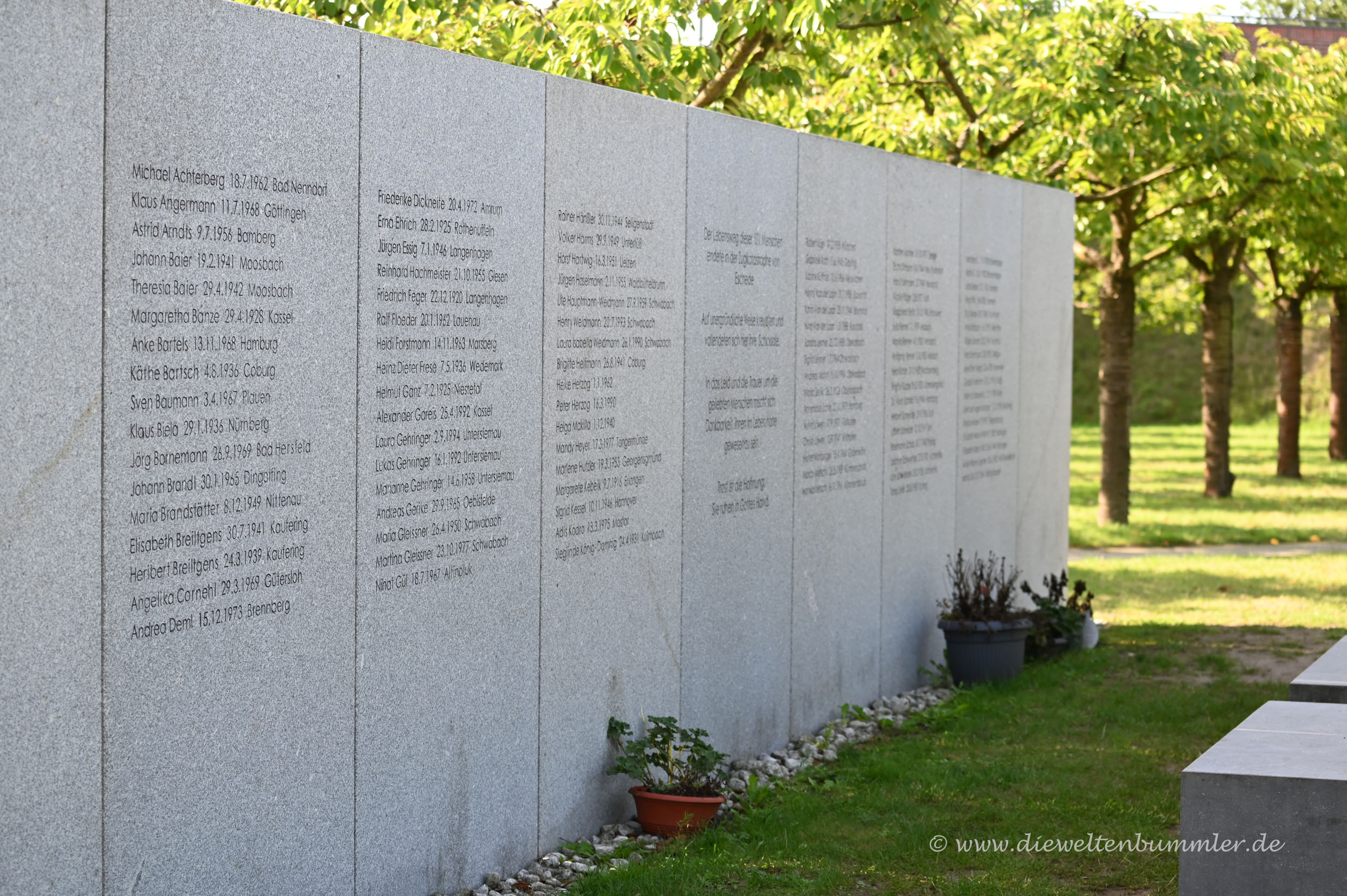 Abgesehen von den absolut überfüllten Stellplätzen und der Problematik, die dieser Umstand für uns mit sich bringt, lief diese Reise bisher sehr gut. Am nächsten Morgen waren wir wieder ausgeruht und konnten frisch an die weitere Arbeit herangehen. Unser erster Fotostopp brachte uns zu einem Wohnmobilstellplatz an der Aller und anschließend nach Eschede, wo wir uns die Gedenkstätte für das ICE-Unglück anschauten.