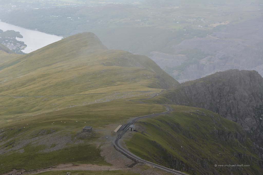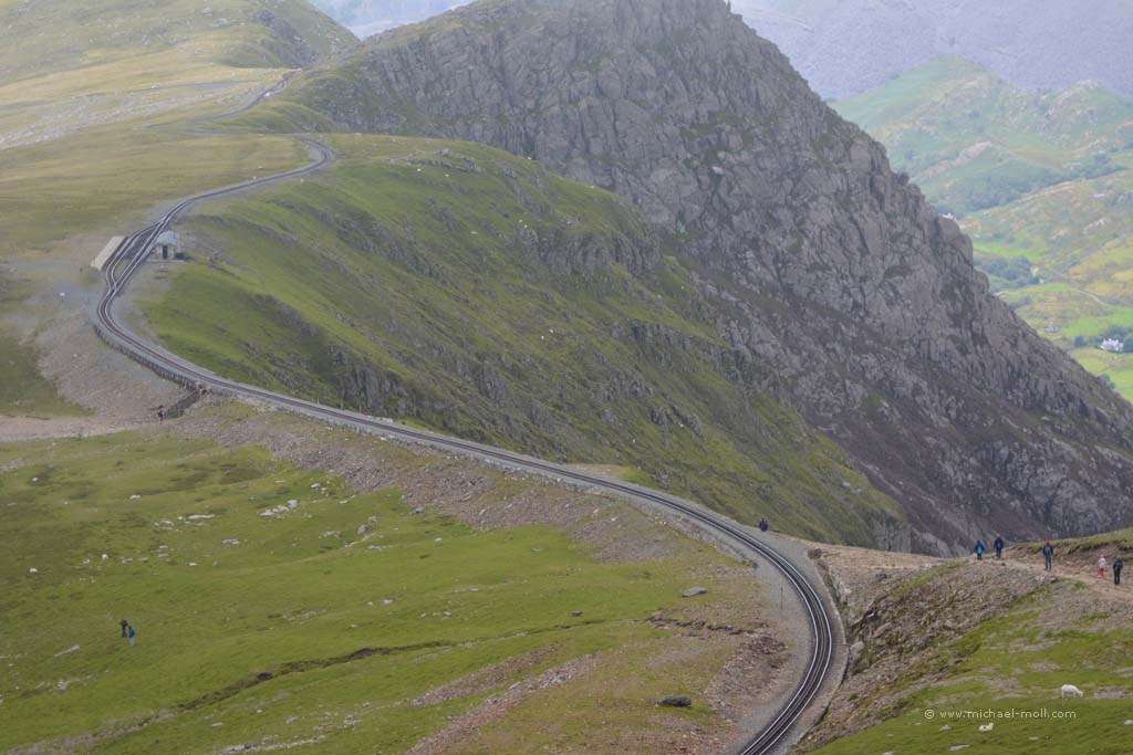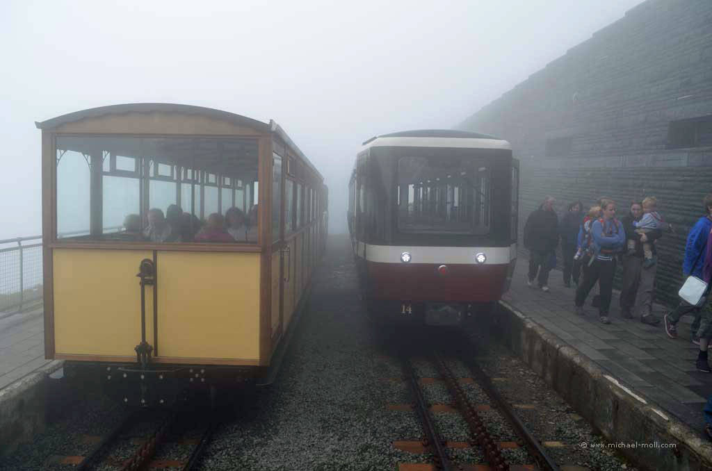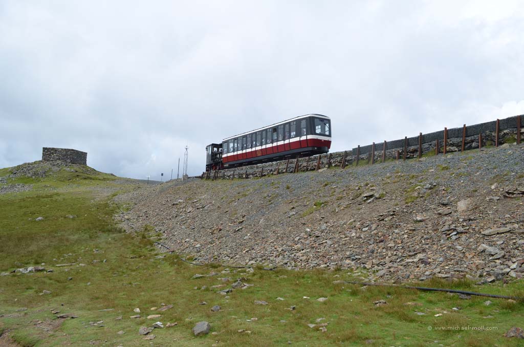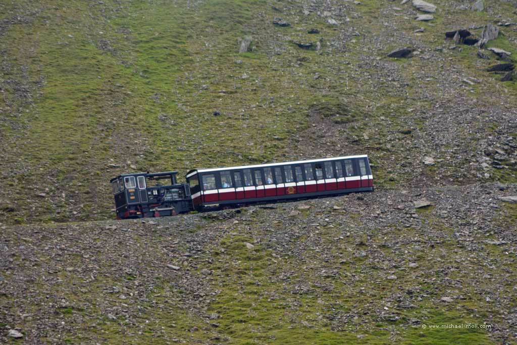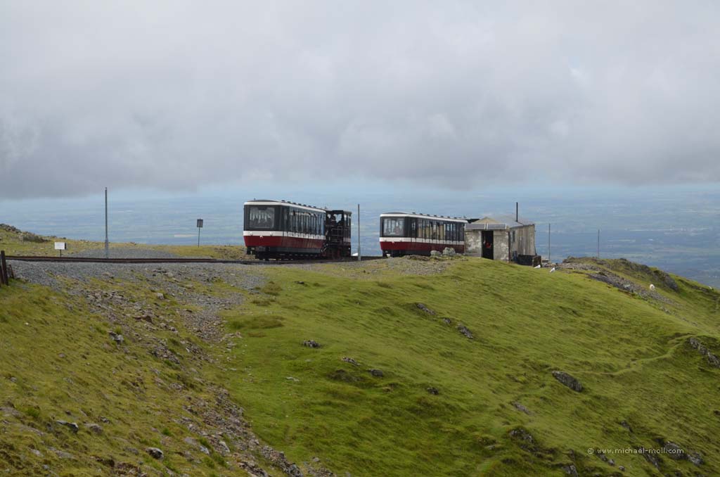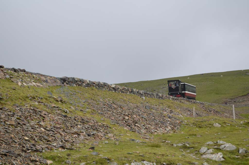 Okay, zunächst fuhren wir zwar zum besagten Parkplatz, aber so richtig wollte immer noch keine Lust aufkommen. Wir überlegten eine Weile und fragten uns, ob wir nicht mal was anderes machen wollen. Etwas, was wir noch nie taten. Und so fuhren wir noch ein kleines Stück zurück nach Llanberis. Dort befand sich nicht nur ein großer Parkplatz, sondern auch die Talstation für die Zahnradbahn. Ja, wir wollten uns einfach mal bequem hinauf befördern lassen. Für uns ist das eine ganz neue Erfahrung. So besorgten wir uns zwei Hin- und Rückfahrtickets und mussten nun nur noch auf die Abfahrt warten. Das hieß, wir hatten nun noch drei Stunden Zeit, da alle Züge bis dahin komplett belegt sind. Das war aber nicht schlimm. So kamen wir endlich mal dazu, ein paar Postkarten zu schreiben und zu verschicken. Außerdem suchten wir eine Werkstatt auf, da unser Auto endlich auch mal Öl braucht. Das hatte ich leider ein wenig vernachlässigt. Und so verging die Zeit, bis wir gegen Mittag in die Zahnradbahn einsteigen durften. Proppenvoll war es, aber einfach auch mal nett. Rund eine Stunde dauerte die Fahrt, die uns aber gar nicht so lang vorkam. Ganz gemütlich tuckerte die Bahn hinauf, aber währenddessen sahen wir fast parallel den Wanderweg neben der Bahnstrecke und die Wanderer, die dort in Kolonnen rauf und runter liefen. Noch bevor wir oben waren, stand für uns fest, dass wir den Rückweg dann doch lieber zu Fuß antraten. Der Weg war so simpel zu gehen und das Wetter wurde mittlerweile auch besser. Außerdem hatten wir so überhaupt keine Möglichkeit, Bilder von unterwegs zu machen. Tja, gesagt getan.