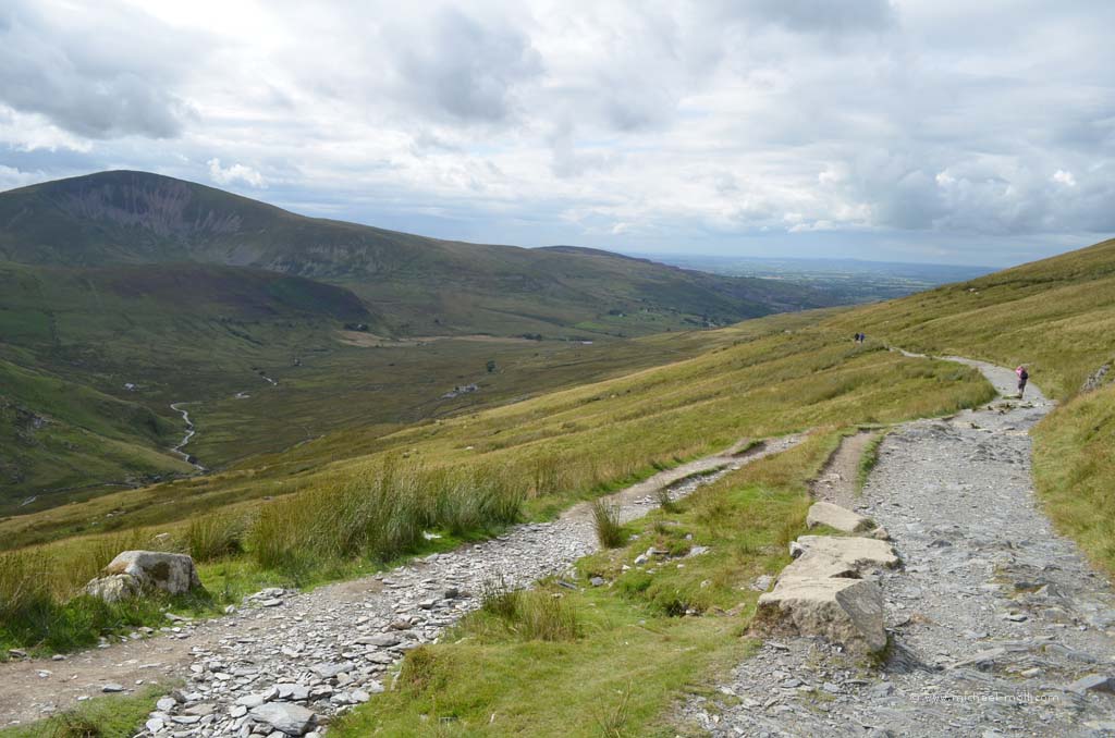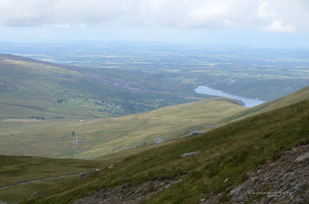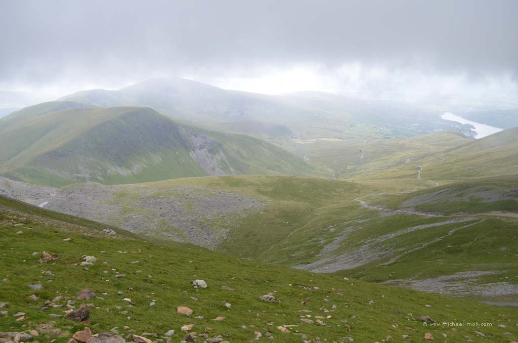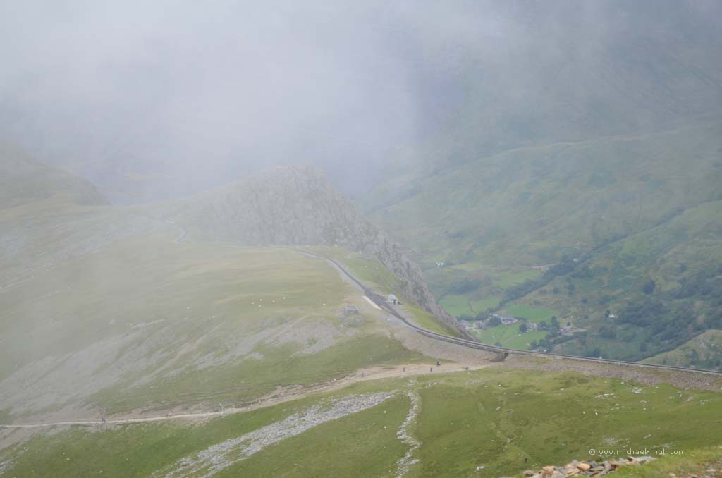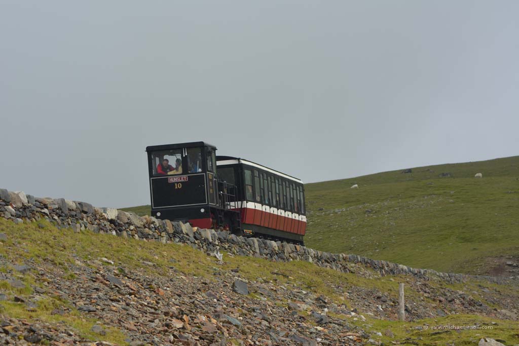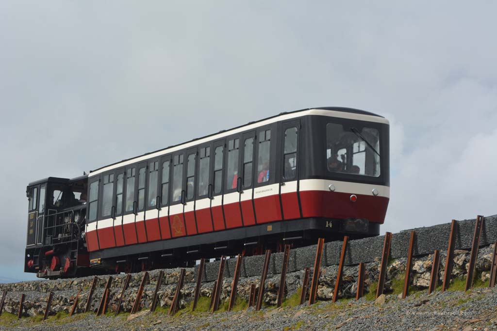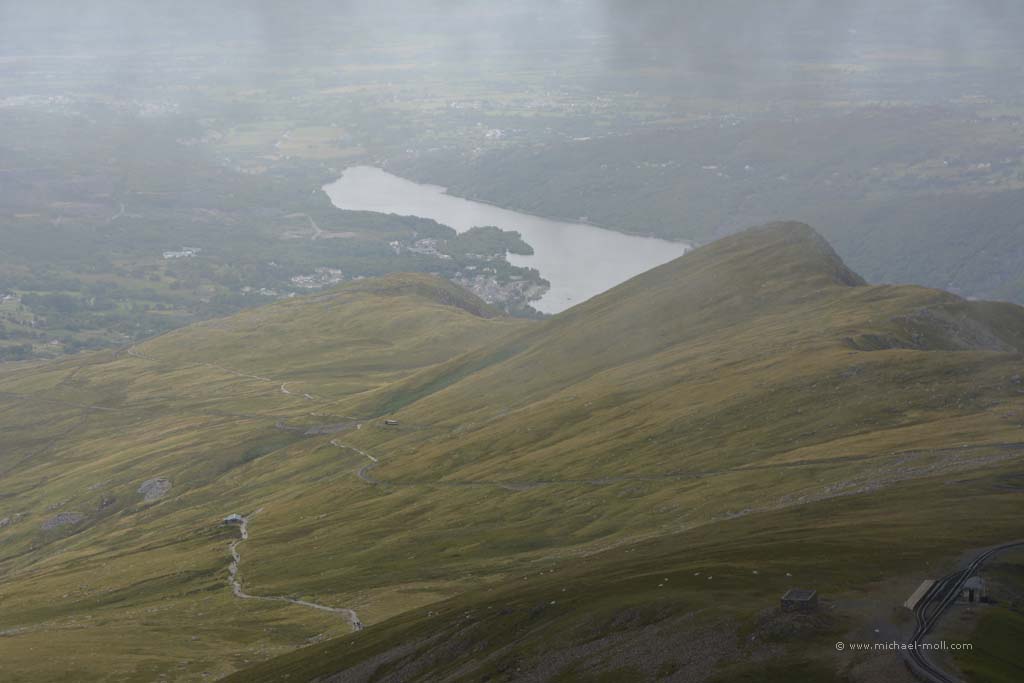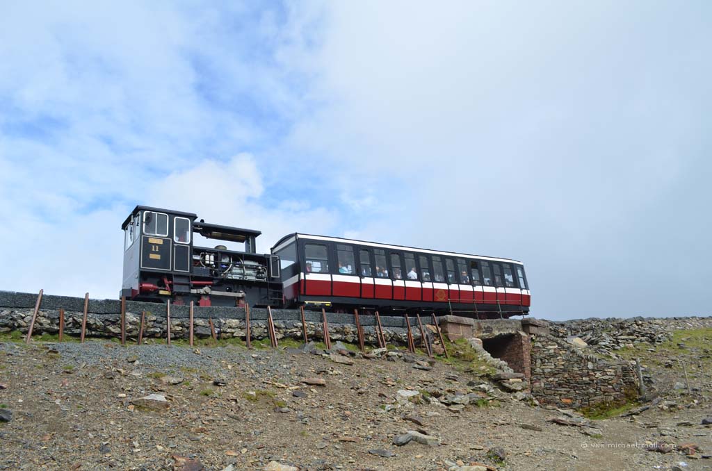 Okay, zunächst fuhren wir zwar zum besagten Parkplatz, aber so richtig wollte immer noch keine Lust aufkommen. Wir überlegten eine Weile und fragten uns, ob wir nicht mal was anderes machen wollen. Etwas, was wir noch nie taten. Und so fuhren wir noch ein kleines Stück zurück nach Llanberis. Dort befand sich nicht nur ein großer Parkplatz, sondern auch die Talstation für die Zahnradbahn. Ja, wir wollten uns einfach mal bequem hinauf befördern lassen. Für uns ist das eine ganz neue Erfahrung. So besorgten wir uns zwei Hin- und Rückfahrtickets und mussten nun nur noch auf die Abfahrt warten. Das hieß, wir hatten nun noch drei Stunden Zeit, da alle Züge bis dahin komplett belegt sind. Das war aber nicht schlimm. So kamen wir endlich mal dazu, ein paar Postkarten zu schreiben und zu verschicken. Außerdem suchten wir eine Werkstatt auf, da unser Auto endlich auch mal Öl braucht. Das hatte ich leider ein wenig vernachlässigt. Und so verging die Zeit, bis wir gegen Mittag in die Zahnradbahn einsteigen durften. Proppenvoll war es, aber einfach auch mal nett. Rund eine Stunde dauerte die Fahrt, die uns aber gar nicht so lang vorkam. Ganz gemütlich tuckerte die Bahn hinauf, aber währenddessen sahen wir fast parallel den Wanderweg neben der Bahnstrecke und die Wanderer, die dort in Kolonnen rauf und runter liefen. Noch bevor wir oben waren, stand für uns fest, dass wir den Rückweg dann doch lieber zu Fuß antraten. Der Weg war so simpel zu gehen und das Wetter wurde mittlerweile auch besser. Außerdem hatten wir so überhaupt keine Möglichkeit, Bilder von unterwegs zu machen. Tja, gesagt getan.