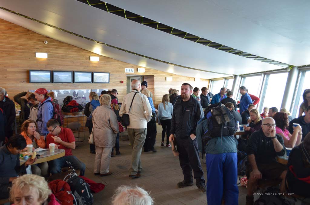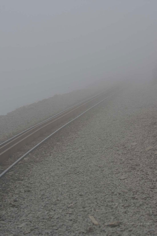 Als die Bahn oben ankam, stiegen wir aus, machten das obligatorische Pingu-Foto auf dem Gipfel – natürlich wie bei allen anderen drei Bergen – im Nebel und gingen sofort los, um den Berg hinab zu wandern. Denn das was wir oben sahen, war einfach nur erschreckend. Neben der Bahnstation befinden sich ein kleiner Souvenirladen und eine Mischung zwischen Schnellimbiss und Restaurant. Mehr Möglichkeiten gab es auf dem Gipfel nicht. Und das bei einer Aufenthaltsdauer von rund 45 Minuten. Da fragten wir uns schon, was wir da noch sollten. Also, einfach dem breiten Weg gefolgt, der sich sehr gut gehen ließ. Und da wir keinen anstrengenden Aufstieg hinter uns hatten, war der Abstieg sehr einfach zu begehen. So dauerte es auch eine ganze Weile und einige Höhenmeter, bis uns die Zahnradbahn einholte, worauf wir ein kleines bisschen stolz waren.