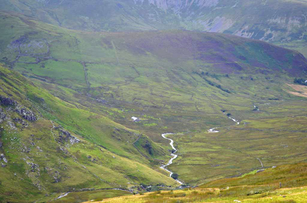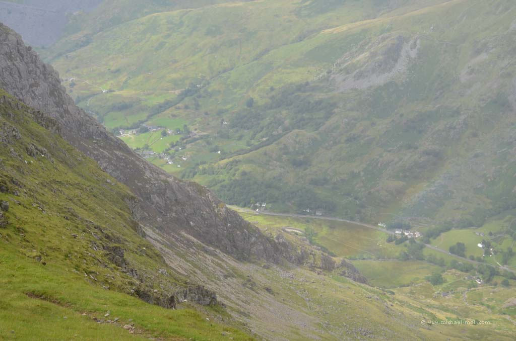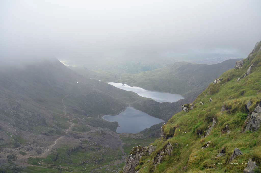 Wir verließen kurz darauf die Insel, erreichten walisisches Festland und fuhren Richtung Snowdon. Unser Weg führte uns hinauf zum Pen-y-Pass, doch als wir dort ankamen, war es schon zu spät. Alles voll. Schade, wäre ein schöner Ausgangspunkt für eine Wanderung gewesen. Wobei wir kurioserweise heute gar keine so große Lust auf Wanderung hatten, das Wetter war nämlich hundsmiserabel. Der Parkplatzwächter schickte uns wieder weg und gab uns den Tipp, weiter unten im Tal bei Nant-Peris zu parken und mit dem Shuttle-Bus wieder hochzufahren.