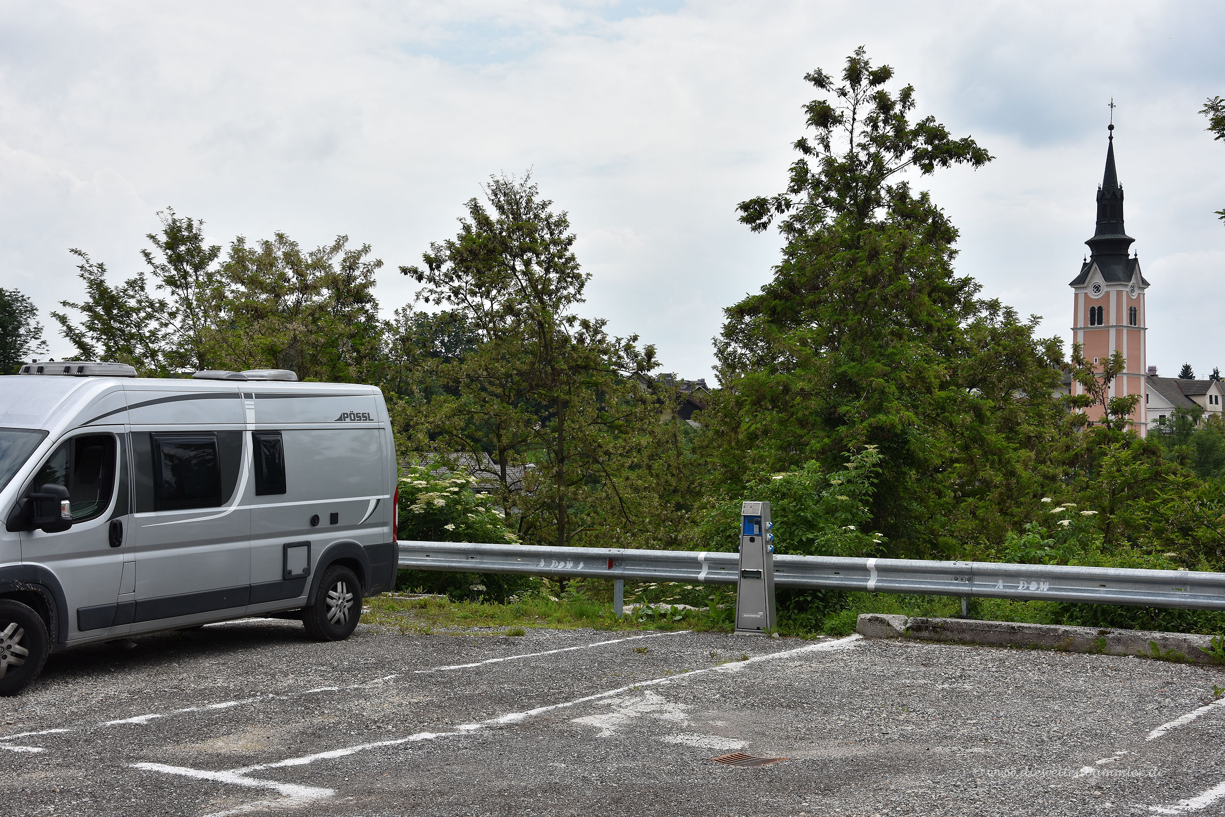 Velenje war die nächstgrößere Stadt, die touristisch aber eher wenig anzubieten hat. Daher ging es für uns direkt weiter nach Slovenji Gradec. Hier wussten wir, dass es wieder eine kleine Innenstadt zu besichtigen gab und dass es dort einen Wohnmobilstellplatz gibt. Diesen steuerten wir natürlich als Erstes an, weil wir so langsam auch mit der heutigen Fahrerei aufhören wollten. Der Weg führte uns in ein Gewerbegebiet und wir fragten uns natürlich, ob wir wirklich richtig seien. Aber es kam tatsächlich das versprochene Hostel, neben dem eben der kleine Wohnmobilstellplatz sein sollte.