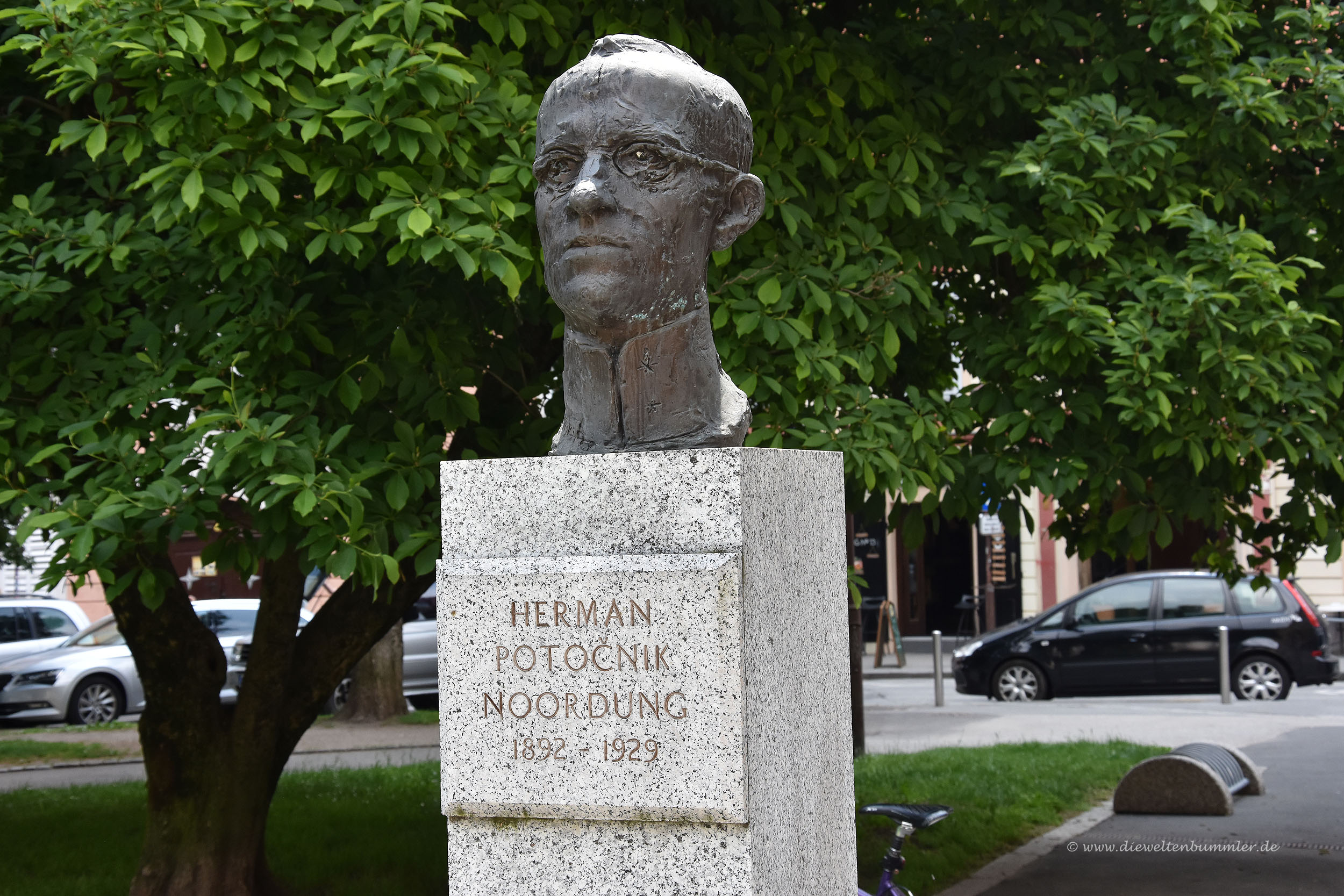 Zu den Sachen, die wir natürlich unbedingt sehen wollten und mussten, gehörte auch die älteste Weinrebe der Welt. Gut, das Alter sieht man ihr nicht an, aber es war nett, ihr mal begegnet zu sein. Außerdem wollte ich ganz gerne noch die Büste von Herman Potočnik anschauen. Dieser Man gilt als Weltraumvisionär und war seiner Zeit vermutlich weit voraus. Näheres über ihn kann man natürlich in der Wikipedia nachlesen.