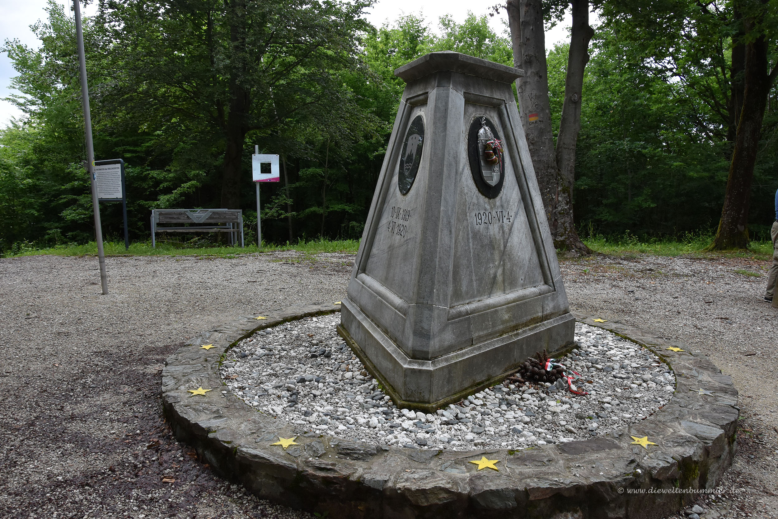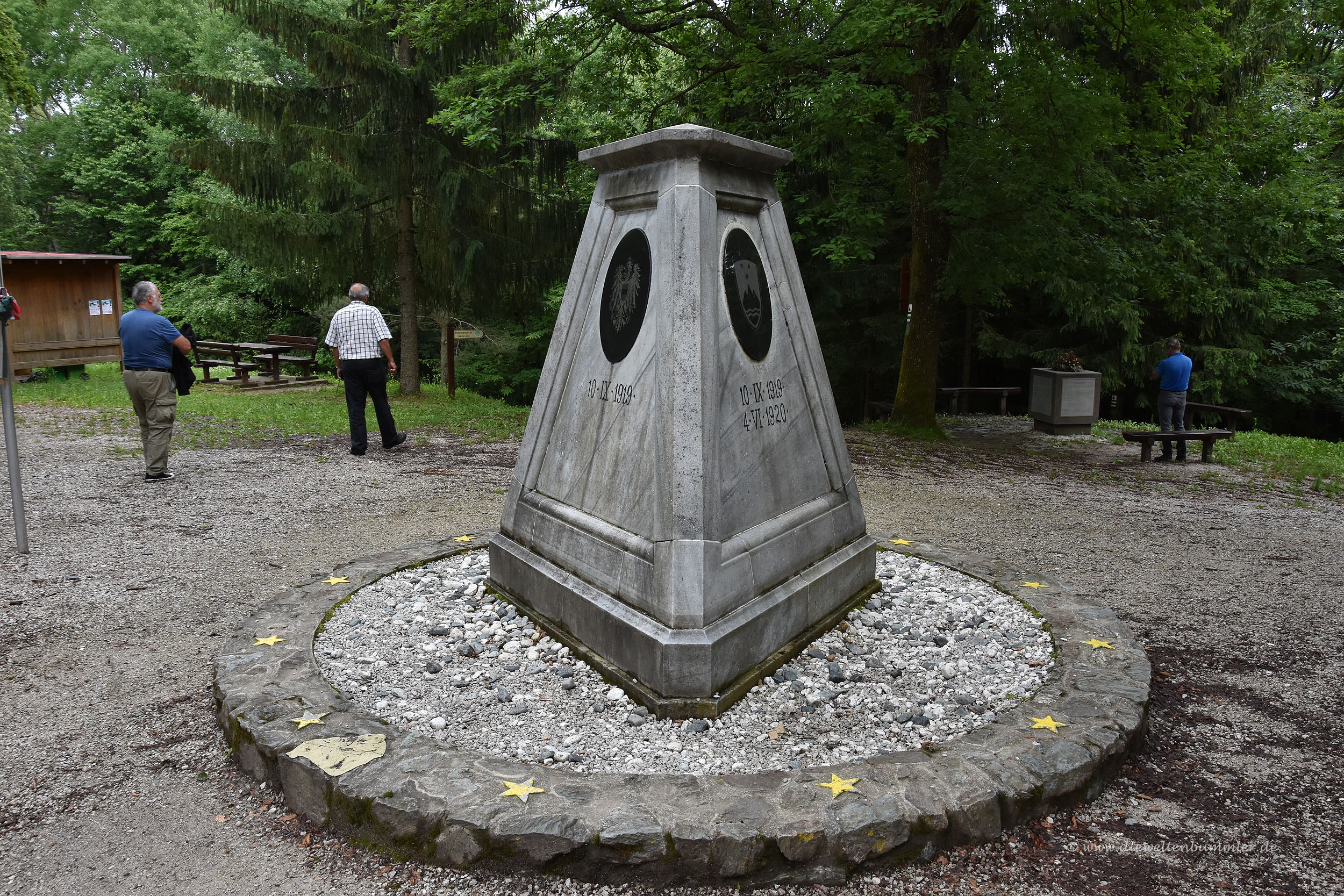 Apropos Ungarn. Natürlich haben wir es uns zum Abschluss der Reise nicht nehmen lassen, noch das Dreiländereck von Österreich, Slowenien und Ungarn aufzusuchen. Dafür fuhren wir allerdings in das Nachbarland Österreich, weil es sich dort einfacher parken lässt. Von dort aus ging es eine knappe halbe Stunde zu Fuß in den Wald, leicht bergauf und damit wieder zurück nach Slowenien. Auf einem bewaldeten Hügel trafen schließlich alle drei Länder aufeinander und so kamen wir in den Genuss, in jedes Land noch einmal einen Schritt zu wagen.