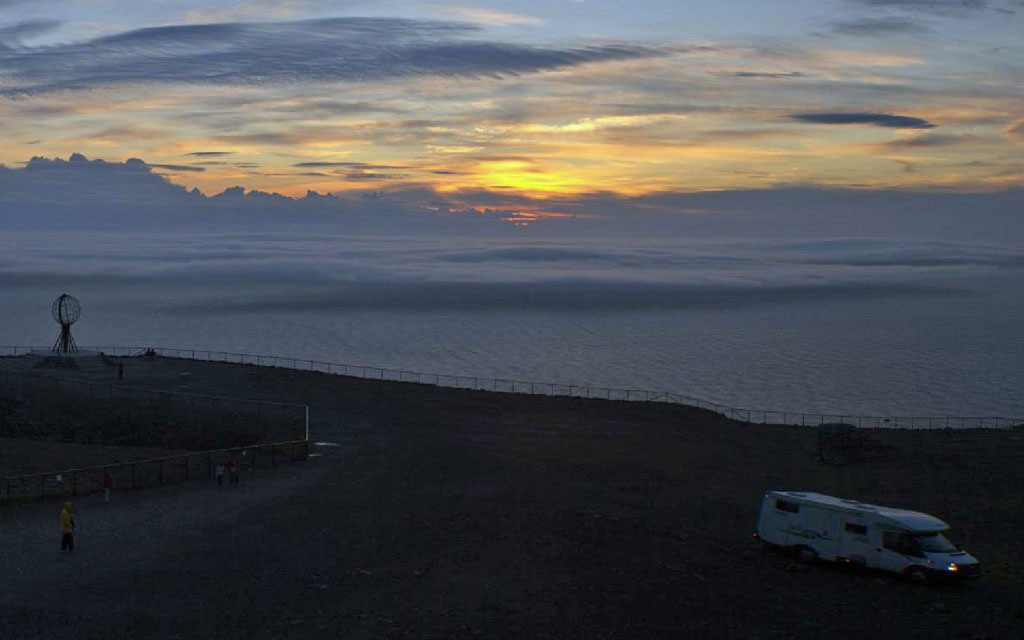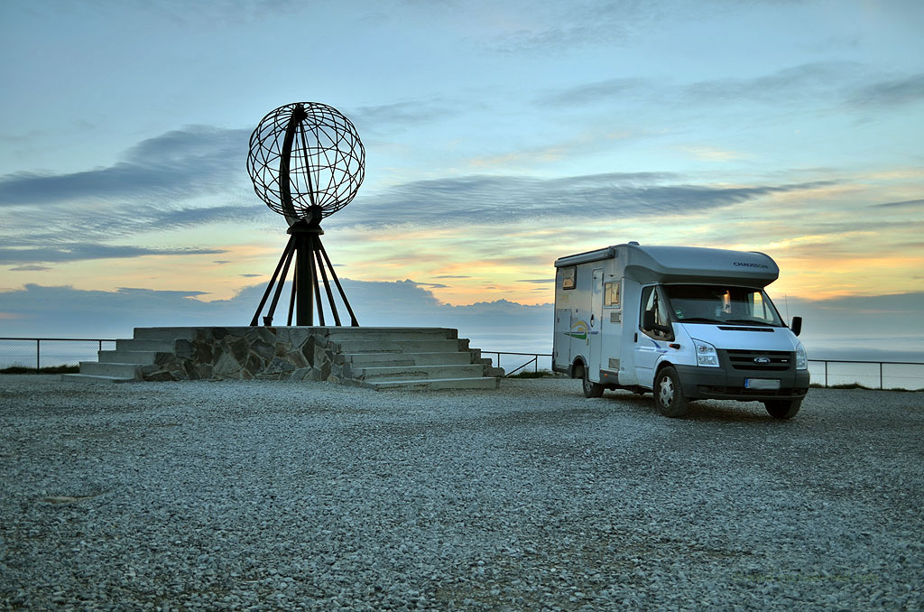 Und dann kam endlich meine große Stunde. Ich kontaktierte bereits vor der Reise die Nordkapphalle, weil ich als Reisebuchautor ein Foto von einem Wohnmobil neben dem Globus benötigte. Dieses wurde mir erlaubt, allerdings erst, wenn die Nordkapphalle ihre Pforten schließt. Und das macht sie des Nachts um 1. Während also fast alle Menschen in ihren Autos schliefen, startete ich den Motor, fuhr zur Schranke und legte meine Erlaubnis vor. Die Schranke wurde geöffnet und ich genoss eines der wenigen Privilegien, die man in meinem Job hat.