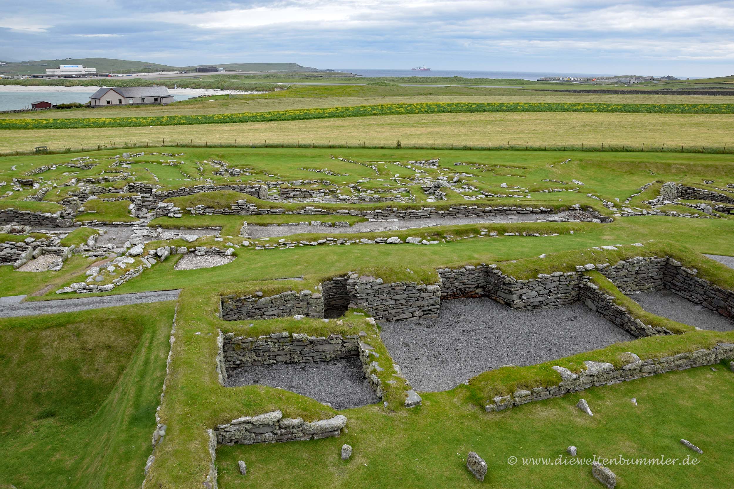 Um zum Jarlshof zu gelangen folgt man der A970, die eine weitere Besonderheit aufweist. Sie überquert nämlich ganz nebenbei die Start- und Landebahn des Inselflughafens. Landet also ein Flugzeug, muss man logischerweise erst einmal abwarten. Aber auf dem Flughafen ist nicht ganz so viel los. Uns ist es kein einziges Mal passiert, dass wir einem Flieger die Vorfahrt gewähren mussten.