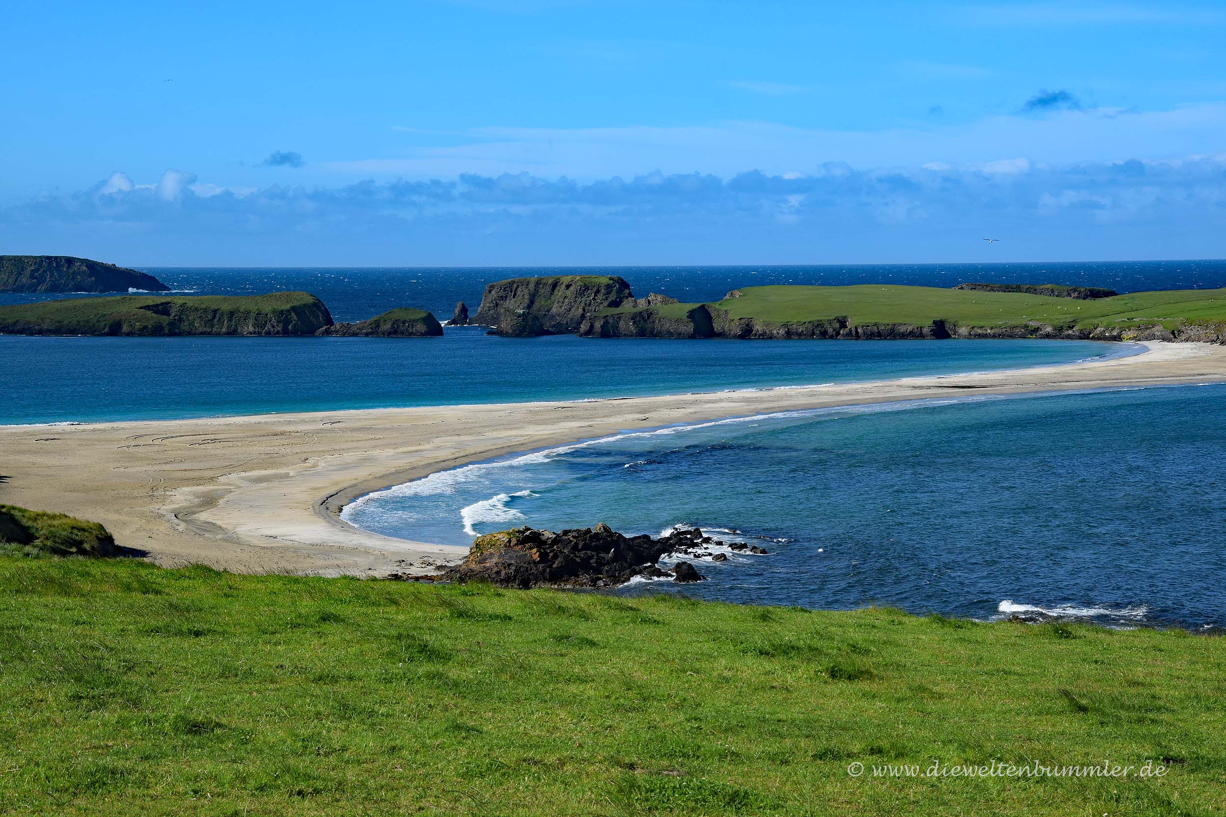Wenig später folgt der Abzweig zu St. Ninian’s Island. Diese Insel ist ein absolutes Muss. Aber eigentlich weniger wegen der Insel, sondern wegen der Tatsache, dass sie über einen schmalen Sandstreifen mit Mainland verbunden ist. Dieser Strandabschnitt wird von beiden Seiten vom Meer angespült, was global betrachtet recht ungewöhnlich ist.