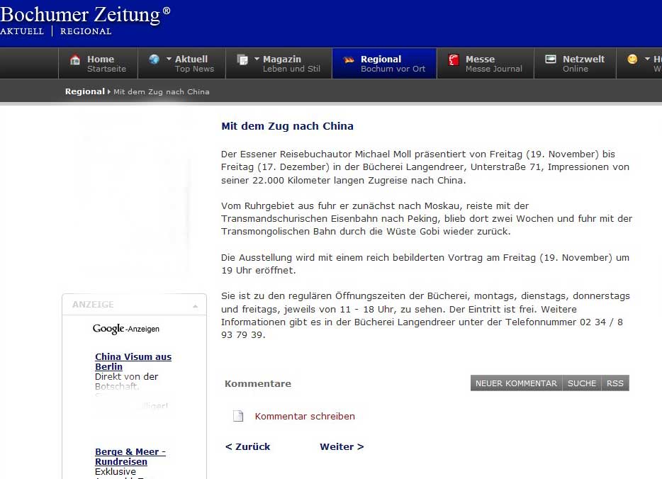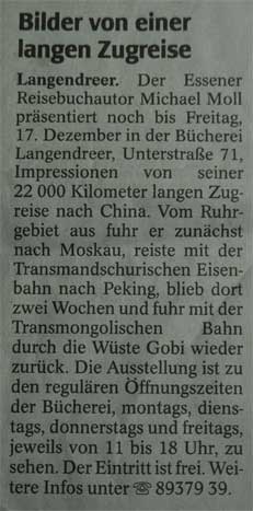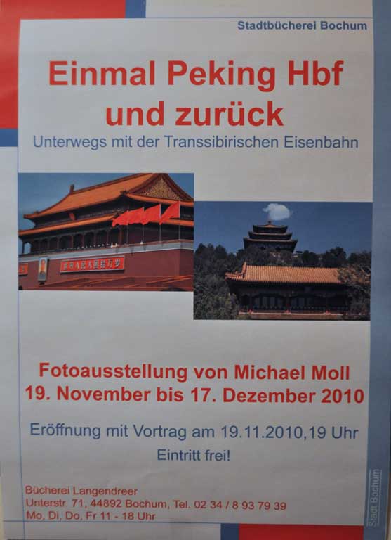 Nur wenige Monate nach meiner ersten Vorstellung in der Stadtteilbibliothekl Bochum-Langendreer durfte ich dort ein zweites Mal ausstellen. Dieses Mal zeigte ich Bilder von der Reise mit der Transsibirischen Eisenbahn nach Peking. Auch hier gab es natürlich wieder einen aufregenden Reisevortrag am Abend der Ausstellungseröffnung.