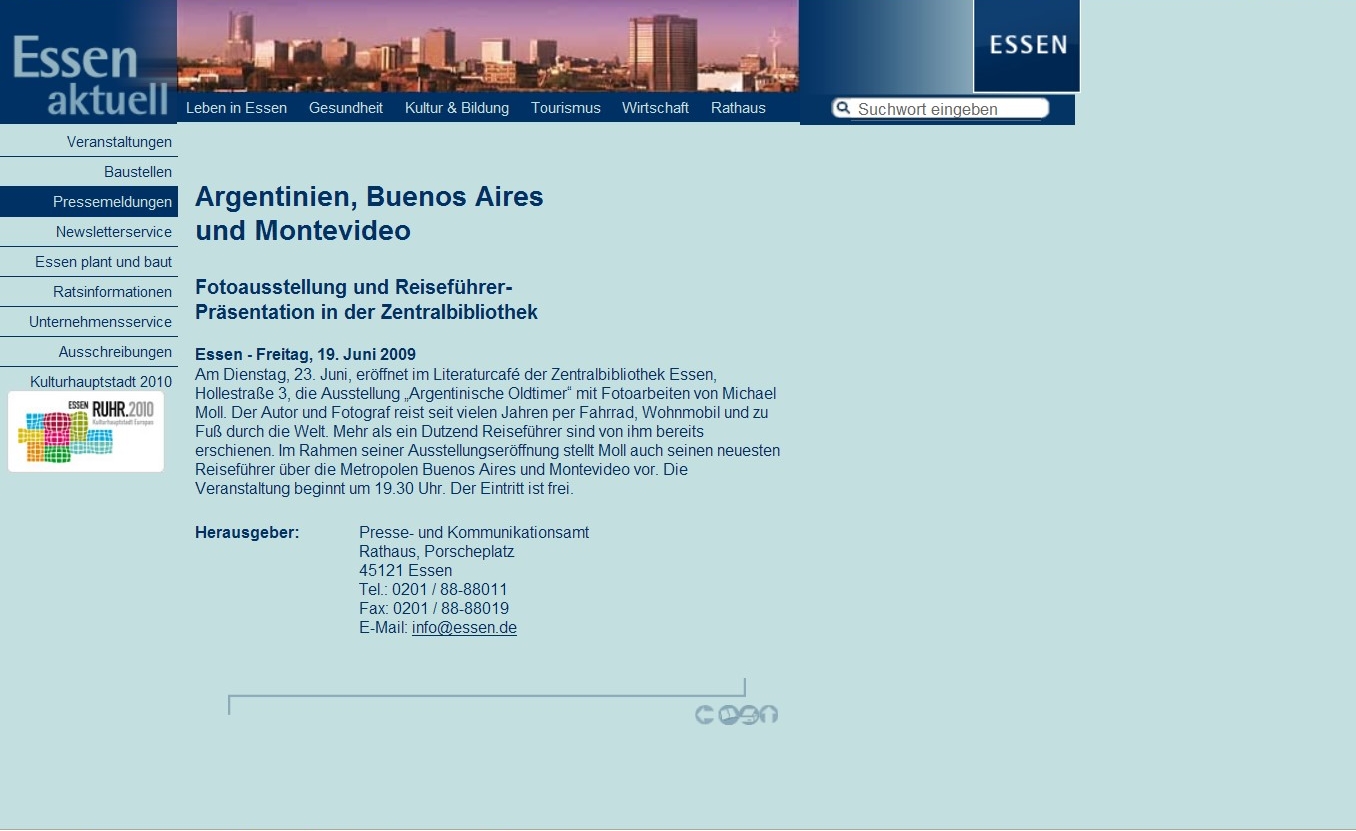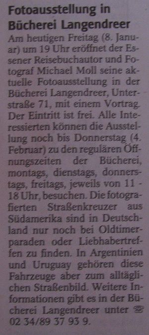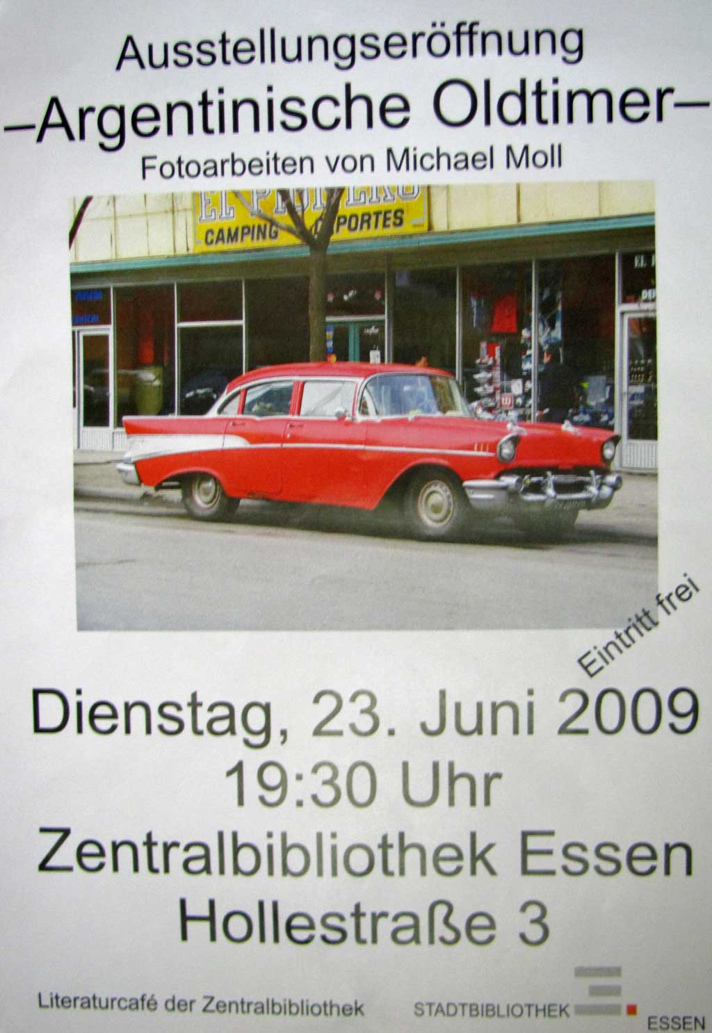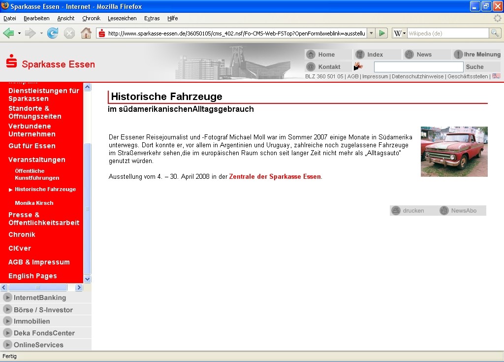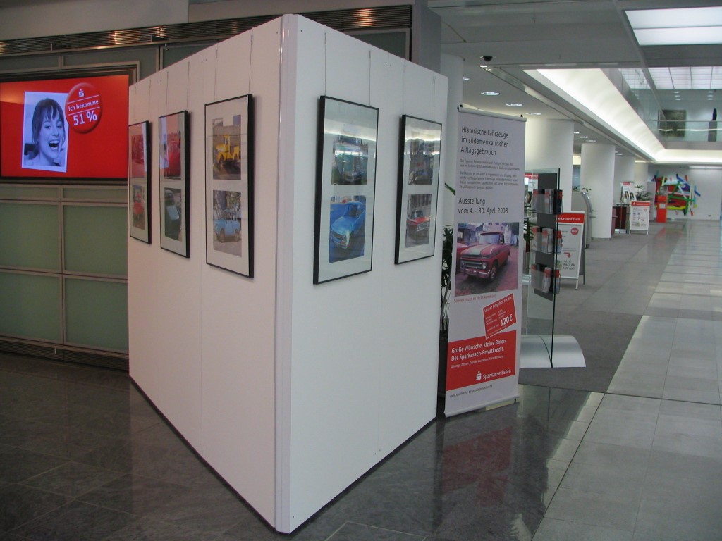 Die erste Ausstellung fand im Foyer der Hauptsparkasse in der Essener Innenstadt statt. Auf einem kleinen Monitor wurde zudem die Ausstellung beworben und jeder Besucher der Sparkasse konnte in den vier Wochen einen Blick auf Oldtimer aus Südamerika werfen.