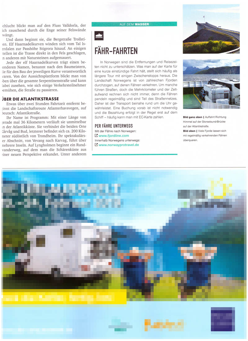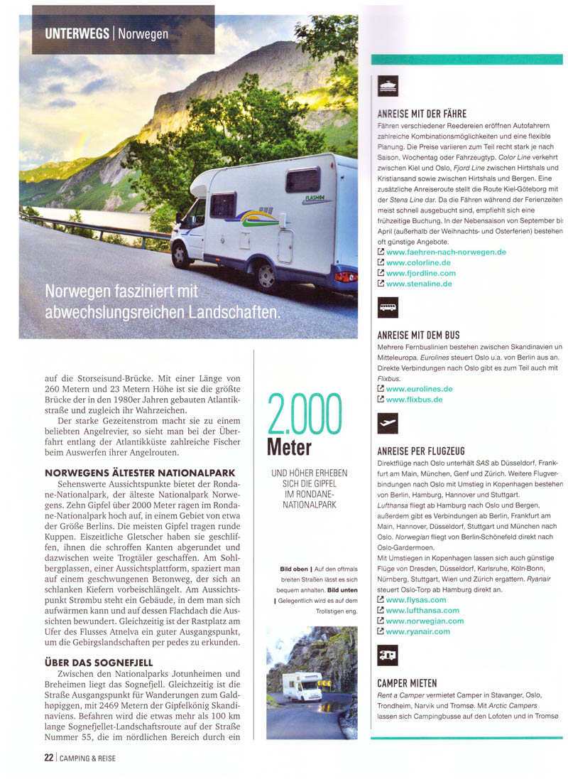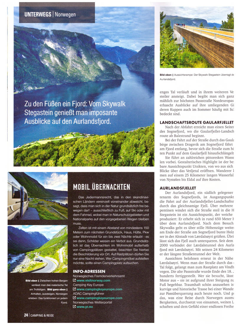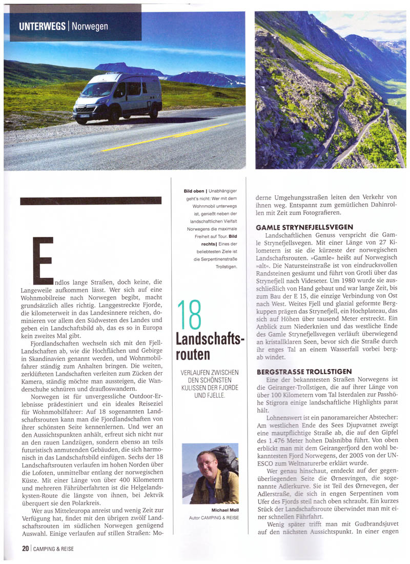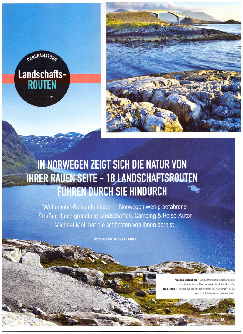 Ich bin nicht nur als Buchautor unterwegs, sondern veröffentliche hin und wieder auch Artikel in verschiedenen Zeitungen, Fachzeitschriften und Magazinen. Mein neuester Beitrag behandelt die Nationalen Landschaftsrouten in Norwegen und ist im Camping & Reise Magazin, Ausgabe 1/2019 erschienen.