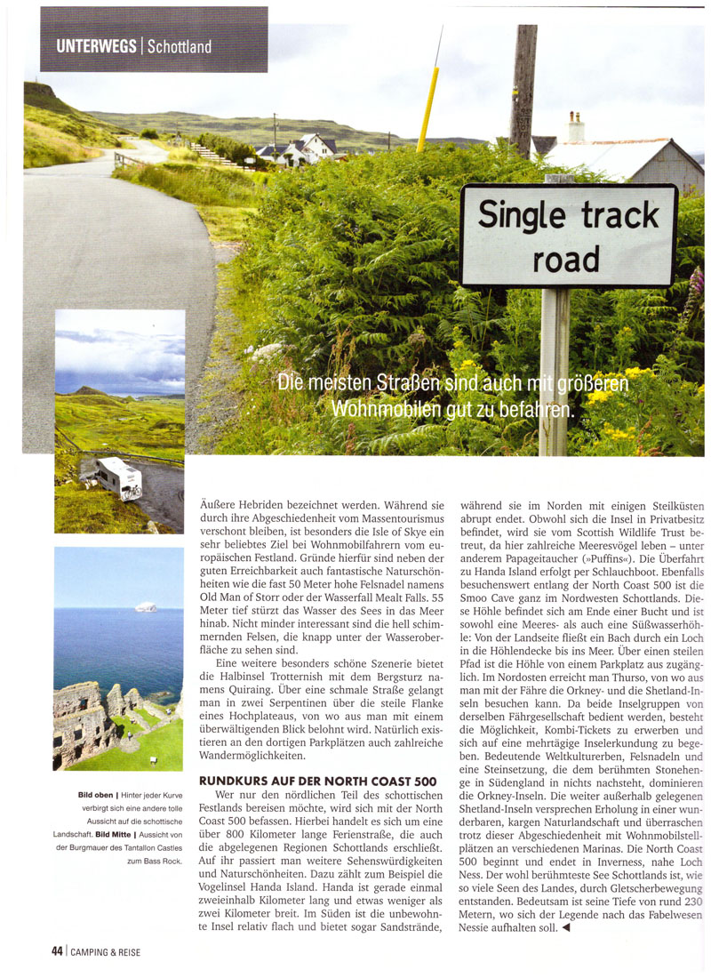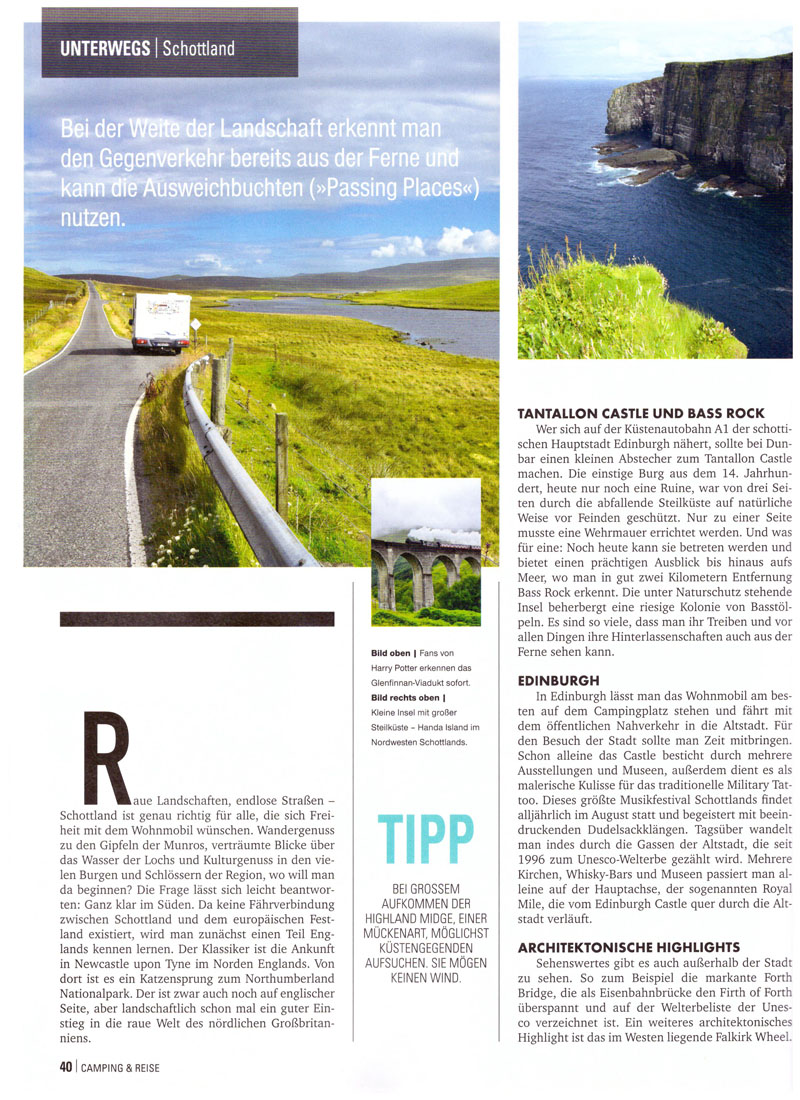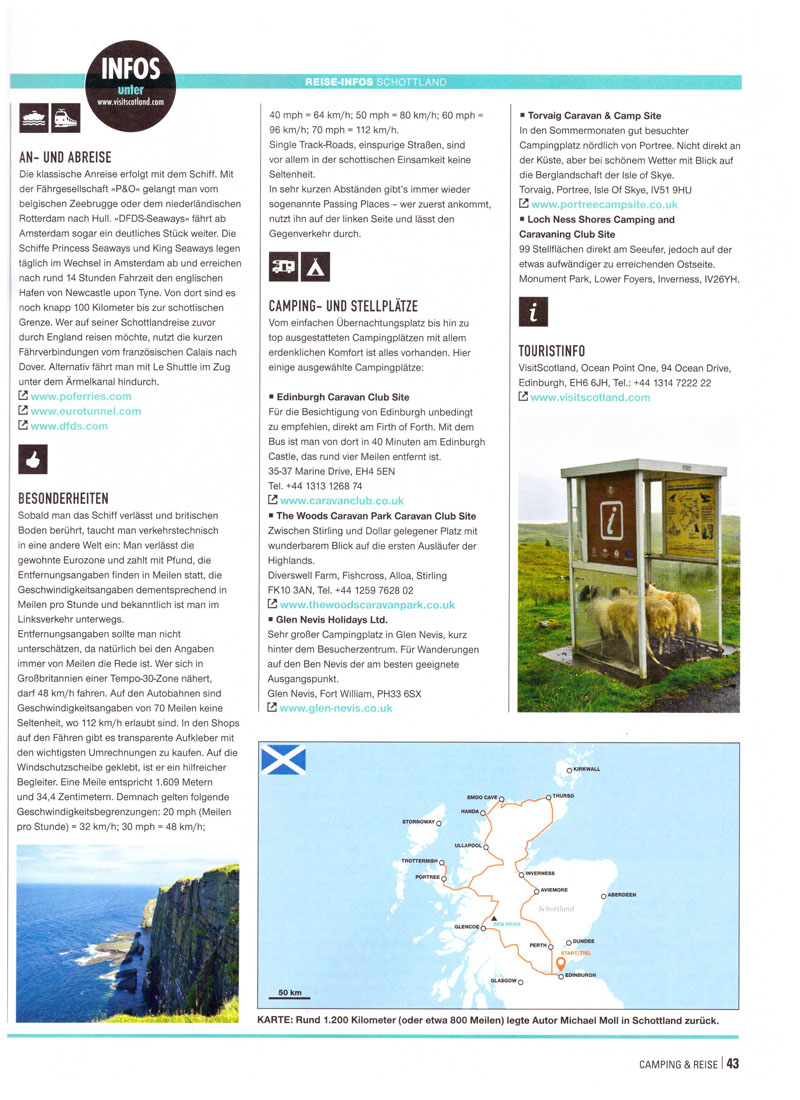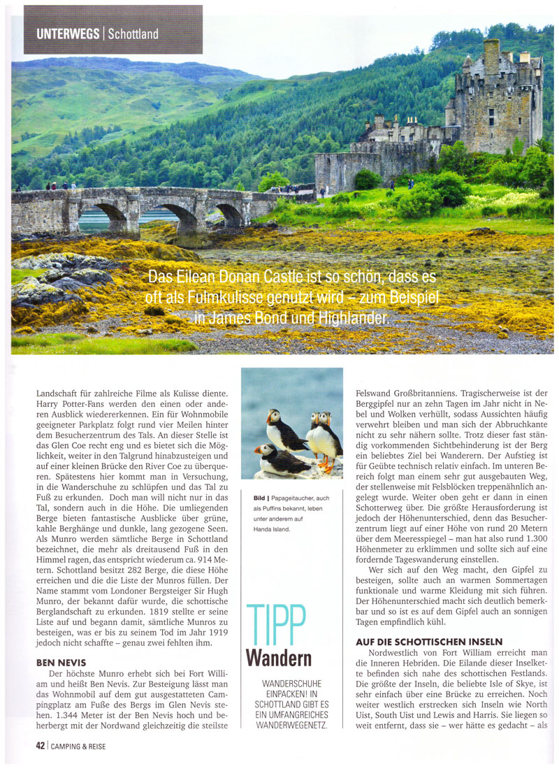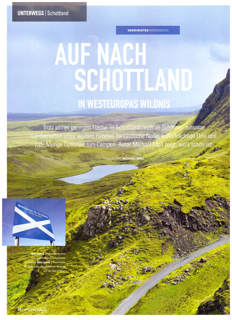Wieder ist ein Artikel von mir in der Fachzeitschrift Camping & Reise erschienen. Dieses Mal nehme ich die Leser mit auf eine Reise mit dem Wohnmobil durch Schottland. Auf sieben Seiten berichte ich über die Reisemöglichkeiten in den Highlands, bei den Munros sowie auf den verschiedenen Inselketten, die Schottland zu bieten hat.