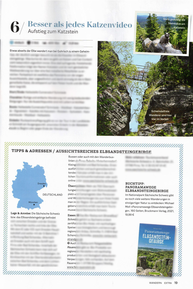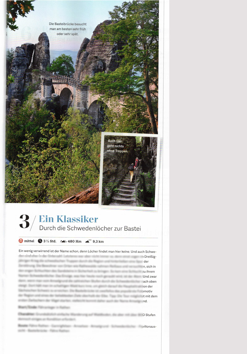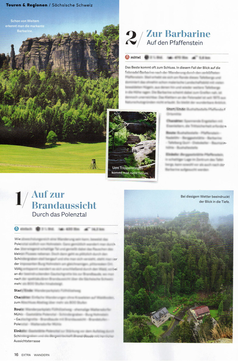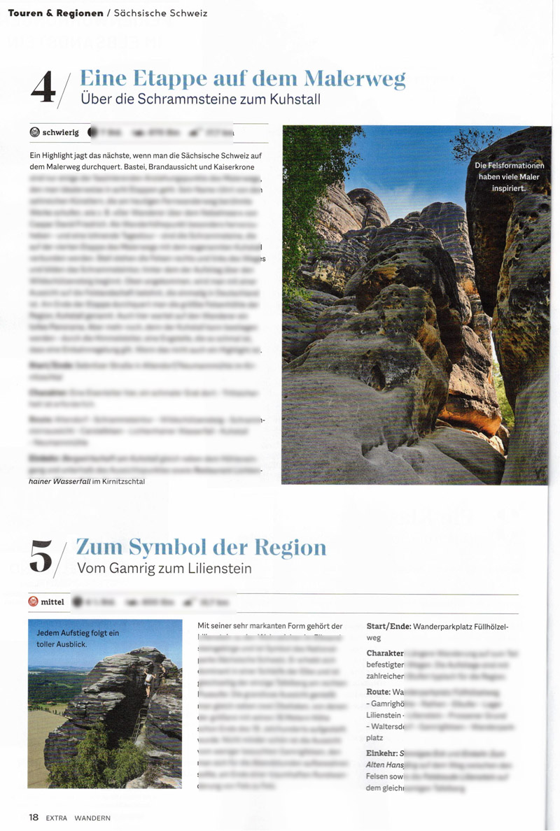 In der Extrabeilage des Bergsteiger-Magazins für das Septemberheft habe ich einige Tourenvorschläge für Wanderungen durch den Nationalpark Sächsische Schweiz bzw. für das Elbsandsteingebirge beigetragen.